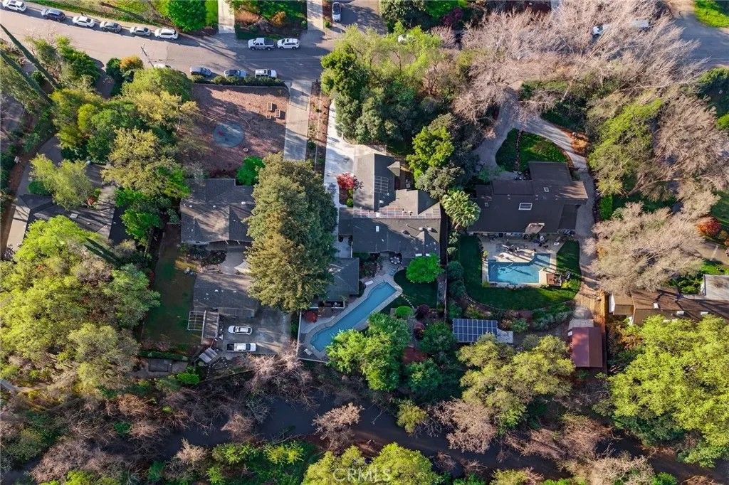 Large House, lot, 75 foot full-length lap POOL with swim-outs. This 3284 square foot custom house is TURN KEY and REMODELED with a leathered granite chef's kitchen .72 acre CREEK FRONT parcel in a premium established neighborhood. RV and BOAT PARKING, detached 2 car GARAGE with SHOP, shed and sauna. Private and fully landscaped yet walking distance from downtown restaurants, galleries, year-round Farmer's Market and Chico State University. House has 2 wings offering a perfect in-law floor plan. A MASSIVE PRIMARY SUITE on one-side has its own sitting area, walk-in closet with built-ins, several other closets, coffered ceilings, skylights and a lush secluded patio. It also has a sunny little office or perhaps Nursery/play room just off the primary suite. On the other side of the home you will find a second living room/family room, a lovely guestroom and another primary bedroom with ensuite bathroom. This primary has a door to the pool and sauna. The formal dining room has views of the beautiful lawn and fig trees. The spacious open great room has multiple sitting areas and a cozy gas fireplace, newer LVT floors and views of the pool, weeping willow and fruit trees in the big back yard. A beautiful redwood deck over-looks Big Chico Creek, firepit, multiple covered patios and porches. Freshly poured concrete driveway with several parking areas. Fresh exterior paint. Owned solar array is older but PG&E bills are still very reasonable. Whole house fan adds to efficiency. New 50 year roof in 2018. 16 skylights make this home glow with natural light. Rich loamy soils in the area have put several of the neighboring homes on the Chico Rose Garden tour. A stroll through the orchards to the West leads to Rose Bridge and scenic Bidwell Avenue.