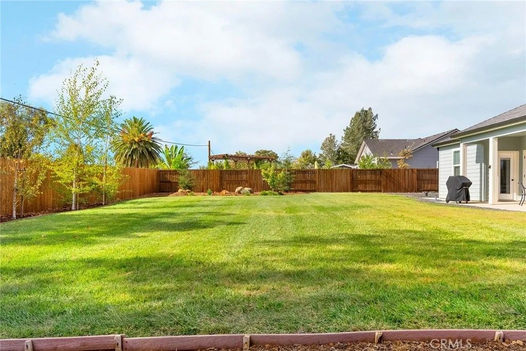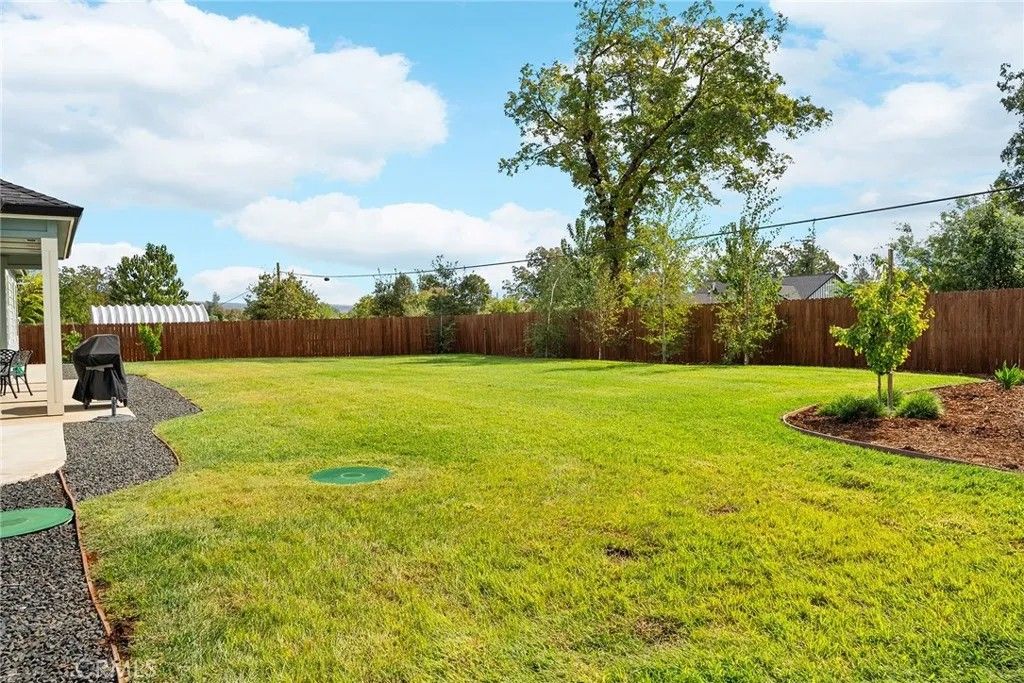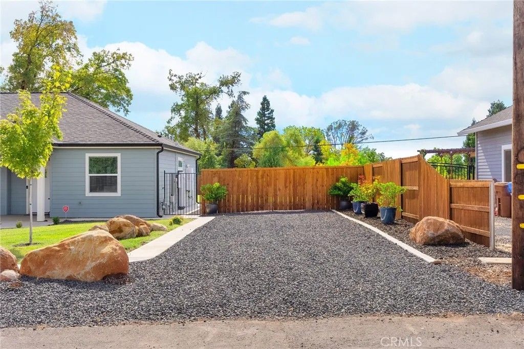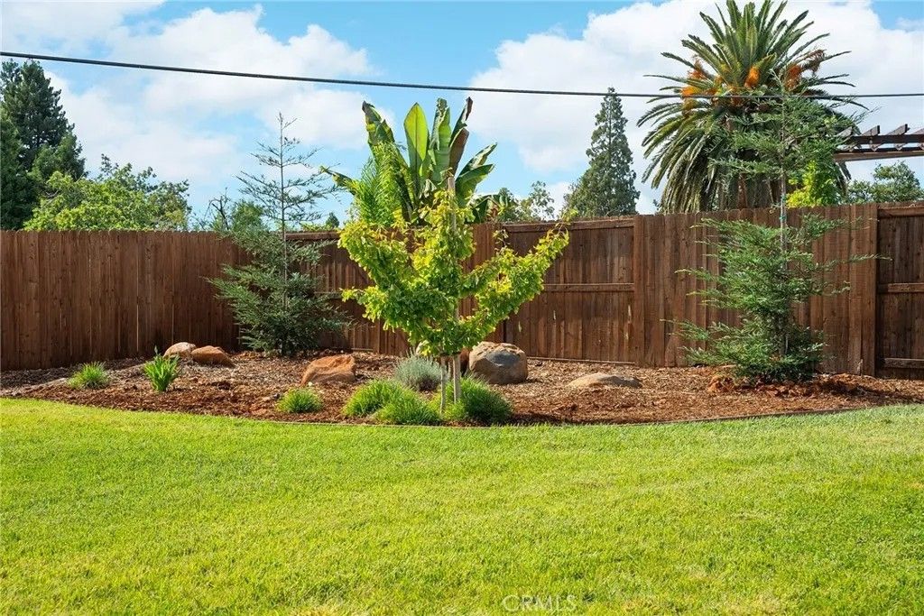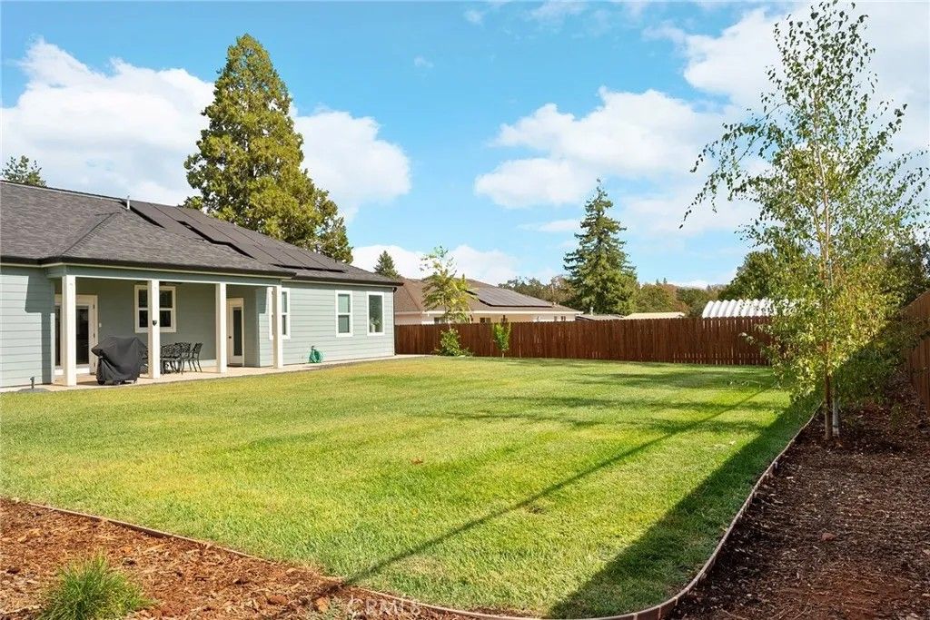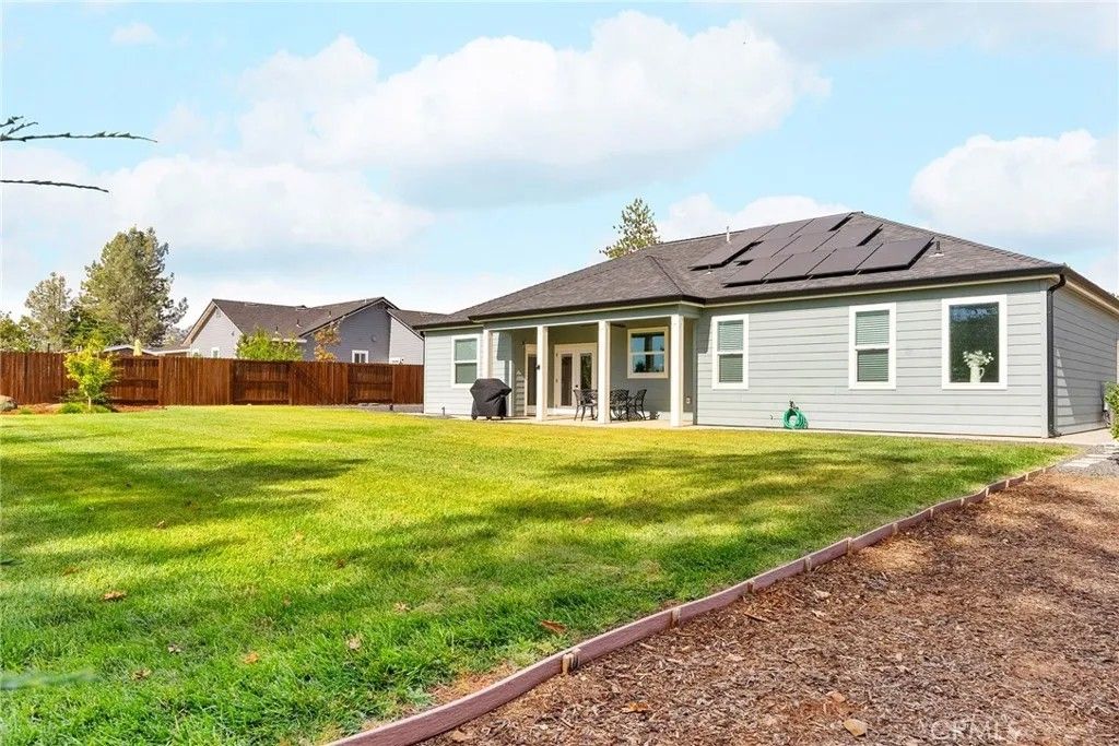 MOVE-IN READY never looked so good! Owned solar, fully landscaped front/back yard and RV parking are just a few of the thoughtful upgrades that make this home as efficient as it is comfortableperfect as you head into the beautiful summer months. Built in 2021 and truly better than new, this property offers completed front and backyard landscaping, including mature citrus trees with Meyer lemon and Mexican lime, full perimeter fencing, and generous gated RV parking. Step inside and immediately feel at home in the spacious open-concept layout. The inviting living area is anchored by a stunning floor-to-ceiling slate hearth fireplace, while the expansive kitchen island creates the perfect gathering space for entertaining and everyday living. The kitchen is beautifully finished with stainless steel appliances, quartz countertops, soft-close cabinetry, and a sink positioned to take in a picture-perfect view of the lush backyard. The dining area opens through French doors to a large, covered patio, creating a seamless indoor-outdoor flow thats ideal for year-round BBQs and relaxing evenings. Designed with a popular split-bedroom floor plan, the home offers both comfort and privacy. The spacious primary suite features a large walk-in closet with built-in storage, a luxurious soaking tub, a step-in tile shower, dual vanities and private access to the expansive covered back patio. Two additional bedrooms and a full bath provide flexibility for guests or family, each with oversized closets and abundant natural light, while the rear bedroom offers its own patio accessperfect for a potential second suite. Additional features include a well-appointed indoor laundry room with counter space and overhead cabinetry and a large walk-in pantry. Since purchasing new, the seller has made extensive improvements, including the addition of owned solar, a Generac backup power system with battery, expanded fencing and gates, a security system, custom window coverings, additional concrete for mow strips and walkways, and fully landscaped front and backyards. Located on a quaint street in desirable south Paradise, known for its prime elevation for gardening and surrounded by newer custom homes, this property offers a peaceful setting with easy commutes to Chico and Oroville. With energy efficiency and potential insurance savings, this home not only provides comfort but helps reduce monthly costs. All the work has been donenow its your turn to move in and enjoy.