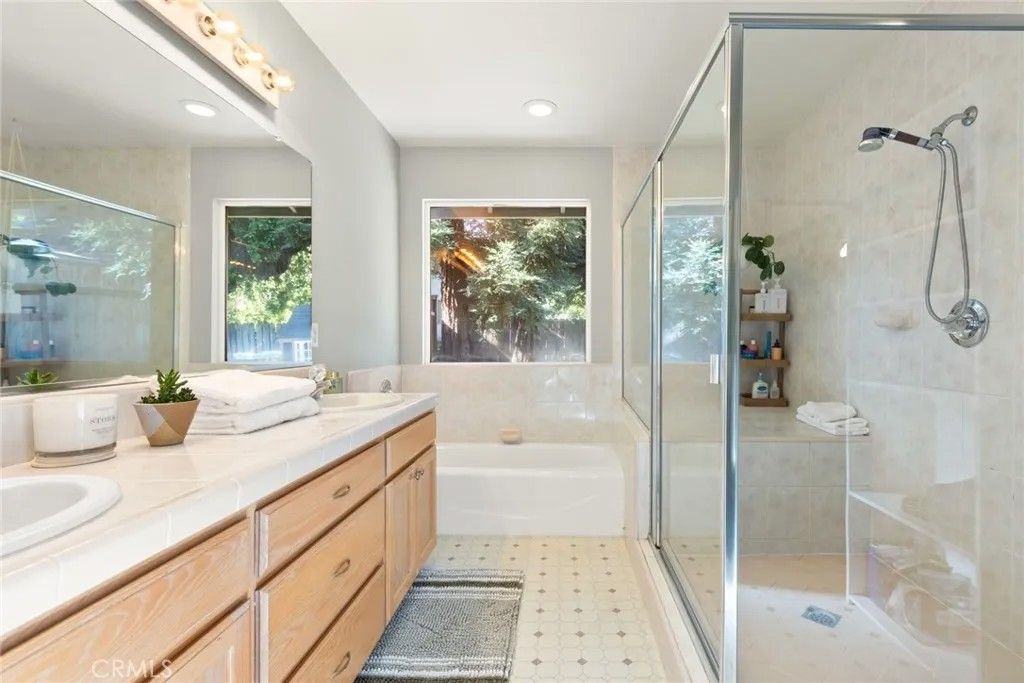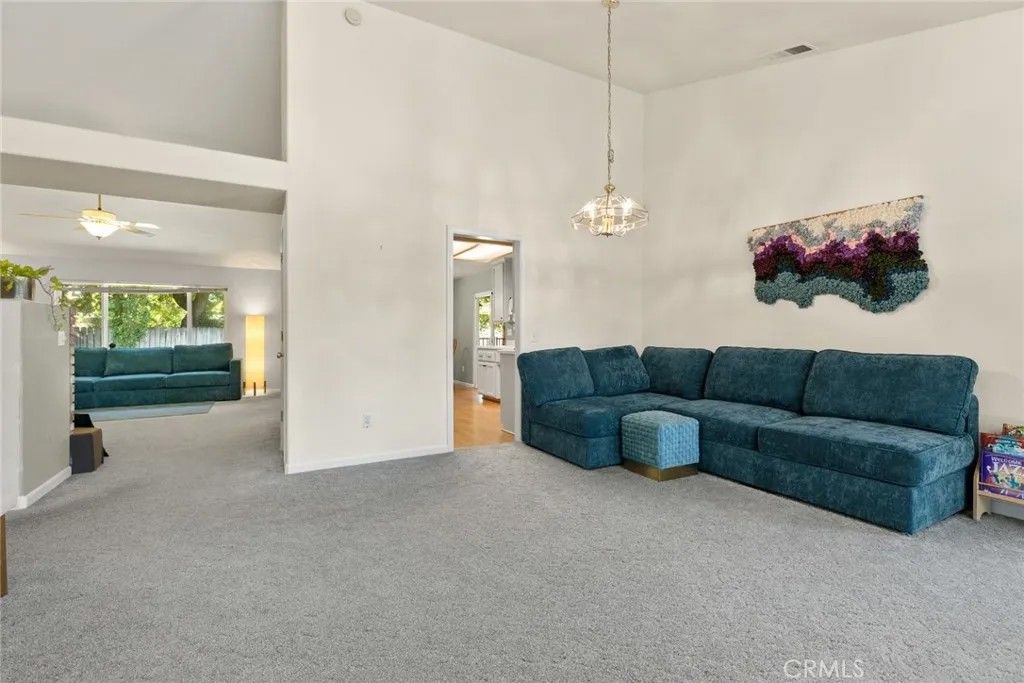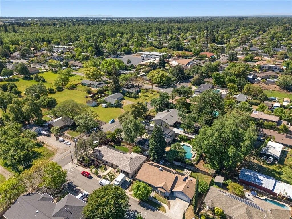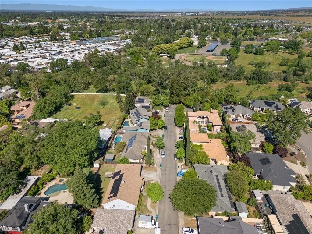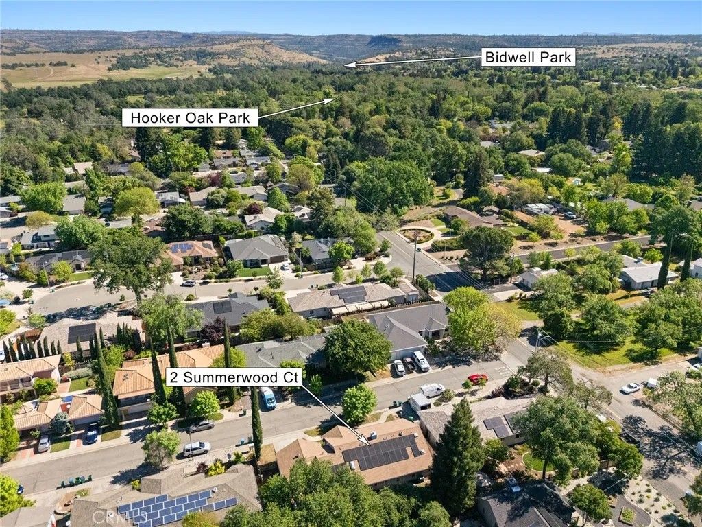 Nested in a desirable cul-de-sac location near the scenic trails and recreation of Bidwell Park, this light-filled home offers the perfect blend of comfort, style, and modern convenience. The open and airy floor plan welcomes you with high ceilings, engineered wood flooring, and a spacious living room highlighted by large windows that invite in abundant natural light. Designed for both everyday living and entertaining, the kitchen opens seamlessly to the dining area and features Corian counters, a breakfast bar, pantry, pots-and-pans drawers, gas appliances and a refrigerator,. The adjoining family room with a cozy fireplace creates a warm gathering space for relaxing evenings. The generously sized primary suite offers a spacious bedroom retreat and a well-appointed bathroom with tile counters, a separate soaking tub, walk-in shower, and dual vanities. Step outside to enjoy the private backyard, where a covered dining patio with skylight provides the perfect setting for outdoor meals and year-round entertaining. Additional highlights include a new roof, indoor laundry with washer and dryer, a water purifier, water softener, Tesla universal charger with two batteries for modern energy efficiency and a leased solar. A two-car garage and potential RV parking along the side yard add extra convenience and flexibility. Ideally located near parks, nature, and amenities, this inviting home combines thoughtful upgrades with a fantastic location.