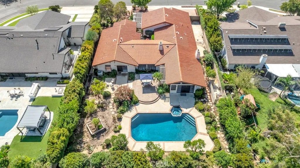 Welcome to a truly special Chatsworth residence that blends timeless character with thoughtful modern enhancements. Nestled in one of Chatsworths most sought-after enclaves where homes rarely come to market, this 5-bedroom, 4-bath property offers nearly 3,500 sq ft of living space on an expansive 0.40-acre lot. Meticulously cared for and upgraded with quality materials, key features include a US tile terracotta ceramic roof and refinished antique Saltillo tile flooring (2025), plus a dual-zone HVAC system with major updatesone zone fully replaced in 2023. All exterior and interior walls are insulated, a rare feature ensuring year-round comfort and efficiency. The exterior was refreshed in 2022 when the entire home was painted with Ceramic Shield paint. The front of the home showcases manicured landscaping, a large gated driveway with RV potential, and a 4-car garage with overhead storage. A gated entry leads through a colonnade to a peaceful courtyard and a refinished vintage fountain. Through the front door, youre welcomed by a step-down living room with vaulted ceilings, a fireplace, and large patio doors opening to the backyard. The west wing includes a spacious great room with new carpet, vaulted ceilings, a fireplace, a wet bar, built-ins, and abundant natural light. The kitchen has been almost entirely rebuilt with newer appliances, a large granite center island with a sink, plenty of cabinetry, a breakfast area, sliding door access to a side patio, and a formal dining room. This wing also features a generous bedroom with courtyard accessideal as guest quarters, studio, or officeplus a renovated hallway bathroom and large laundry room with built-in storage. In the east wing, the primary suite offers vaulted ceilings, sliding door access to the backyard, a walk-in closet, and an ensuite bathroom. Two additional hallway bathrooms are large in size and serve the remaining three guest bedrooms, which offer ample space and storage, including one by the courtyard with refinished parquet flooringperfect for a home office. The backyard offers a large pool, multiple patios, and lush landscaping surrounded by six mature citrus treestwo Navel orange, two Valencia orange, one Meyer lemon, and one kumquat. Dont miss this rare opportunity to own a one-of-a-kind home in Chatsworthminutes from hiking trails, parks, and mountain views.