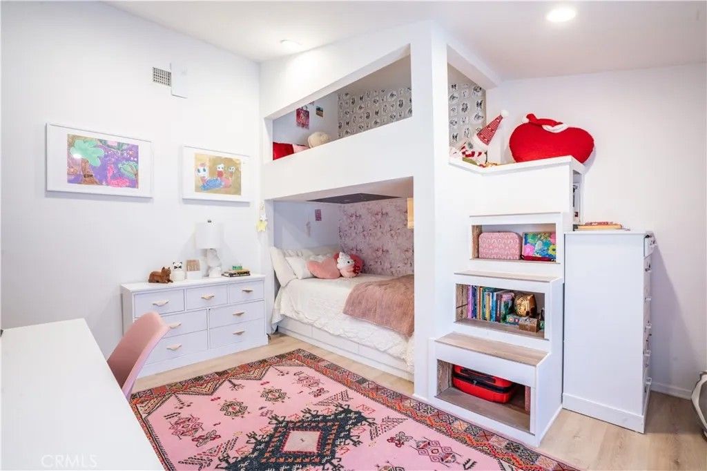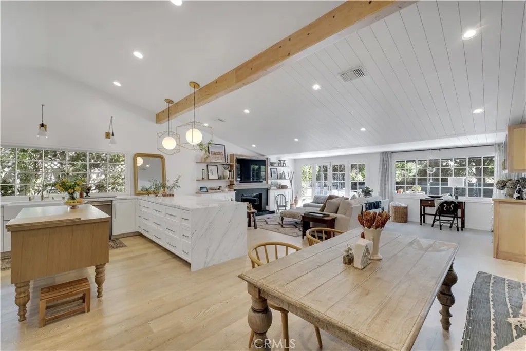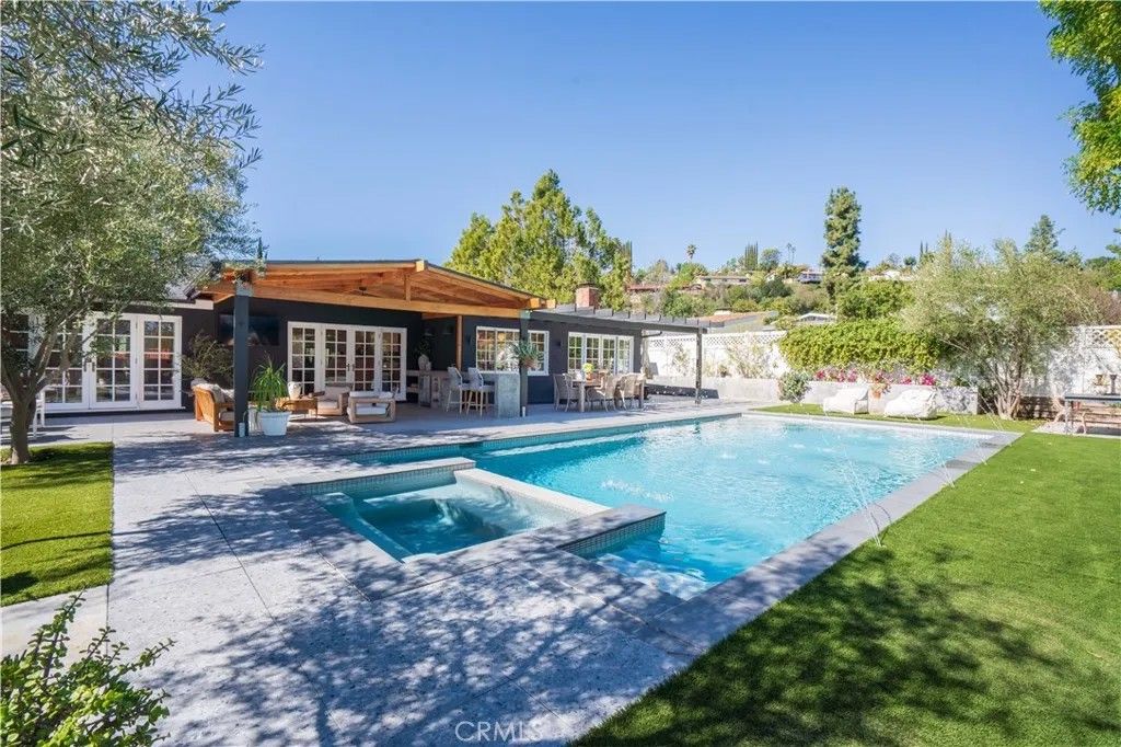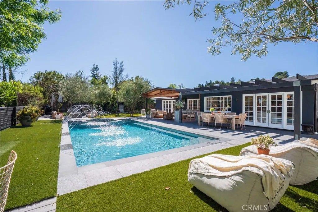 Stunning Mid-Century one story ranch seamlessly blends timeless charm with modern elegance. This is an interior designers home, every detail of this home has been carefully curated for style and functionality. A beautifully landscaped front yard sets a serene tone as you approach this 3,080-square-foot home, situated on an expansive 11,286-square-foot lot. Offering five bedrooms and four bathrooms, the layout is both spacious and versatile. The fifth bedroom and bath are privately positioned apart from the others, making it ideal for guests, extended family, or home office. The primary suite is a true retreat, featuring a walk-in closet plus an additional floor-to-ceiling closet space and French doors looking at the backyard. Its newly renovated ensuite bathroom boasts double sinks and a stunning marble shower. The additional bedrooms are generously sized, each offering ample closet space. One bedroom features a custom-built bunk bed, perfect for kids or anyone seeking a cozy, private space to read and relax. At the heart of the home, the open-concept kitchen is a chefs dream. Designed with soaring ceilings, an exposed beam, and custom cabinetry adorned with unlacquered brass handles, this space is both elegant and practical. Premium Thermador appliances, including a six-burner stove, extensive counter space, a custom wood center island, and an inviting eat-in kitchen area. The kitchen seamlessly flows into the great room, featuring a custom fireplace surround, built-in dry bar, and French doors that open to the backyardcreating a warm and inviting atmosphere. Step outside into your private backyard retreat, where a sparkling pool with water jets, a relaxing spa, and a cozy firepit await. Multiple seating areas, a covered patio designed for outdoor dining and relaxing, and lush drought-tolerant landscapingincluding stunning olive treesmake this space both breathtaking and low maintenance. This lovely backyard comes complete with an inspiring art studio and a welcoming craft corner. Located within the highly sought-after El Camino Charter School District, this exceptional property is just minutes from the freeway, Hidden Hills, Calabasas, and Warner Center. A rare blend of mid-century charm and modern luxury that must be seen to be fully appreciated.