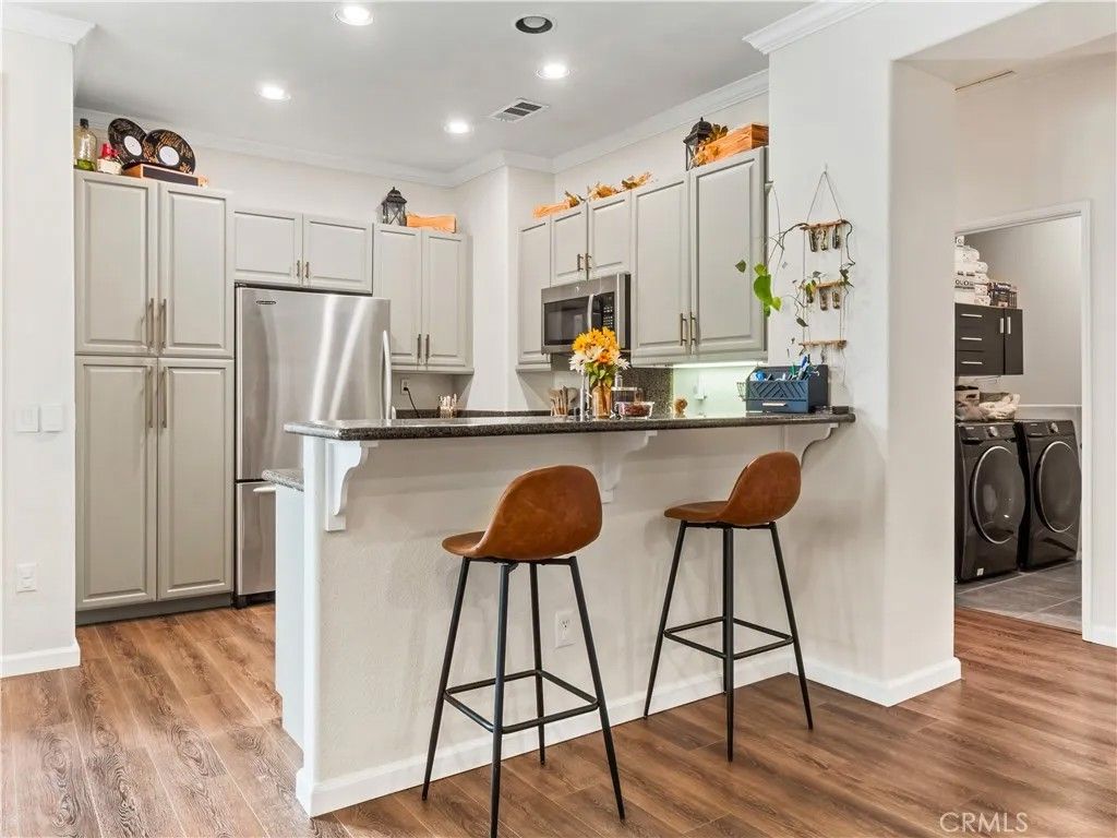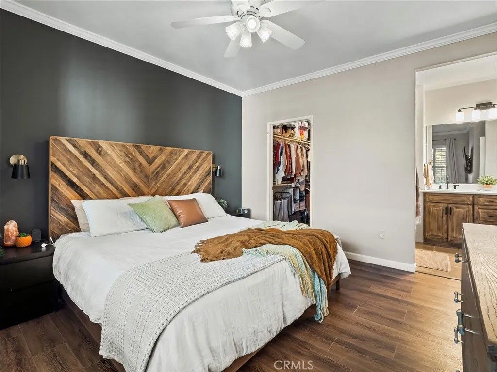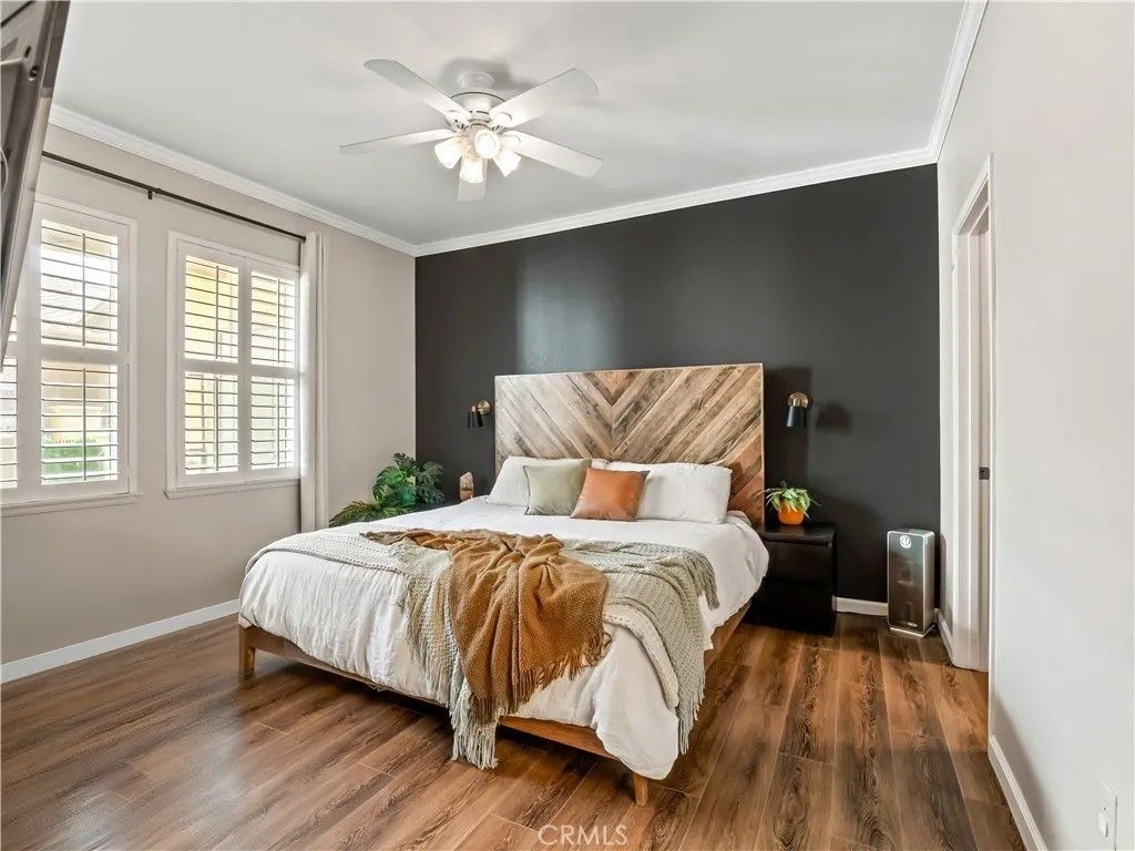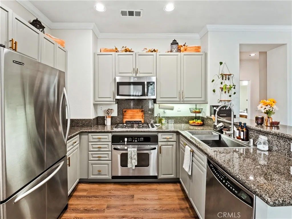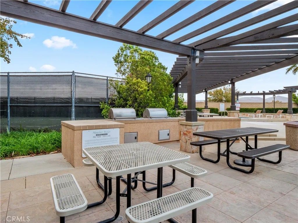 Welcome to this trendy 3-bedroom end-unit townhome in the desirable gated Heather Ridge community! Enjoy no neighbors above and a direct-access 2-car garage for added convenience. Step inside to find new luxury vinyl plank flooring, fresh paint, upgraded light fixtures, crown molding, recessed lighting, plantation shutters, new water heater, and ceiling fans in every room. The spacious great room offers a custom fireplace with a wood mantel, built-in media cabinet, and built-in speakers, perfect for entertaining. The light and bright dining area opens to a private balcony, while the kitchen boasts stainless steel appliances, granite counters, updated cabinetry with new fixtures, a new sink, and breakfast bar seating. The primary suite features a huge walk-in closet and a modern ensuite bath with dual sinks and an upgraded vanity. Secondary bedrooms are well-appointedone with a charming wood-slat nookand the laundry room offers extra storage with direct access to the garage featuring epoxy floors. Heather Ridge residents enjoy resort-style amenities including a pool & spa, tennis and basketball courts, clubhouse, park, and BBQ areaplus ample guest parking. HOA covers exterior walls, roof, trash, and landscaping. Conveniently located right off the 14 freeway, near top-rated schools, shopping, and dining. Dont miss this amazing opportunity to make this home!!!