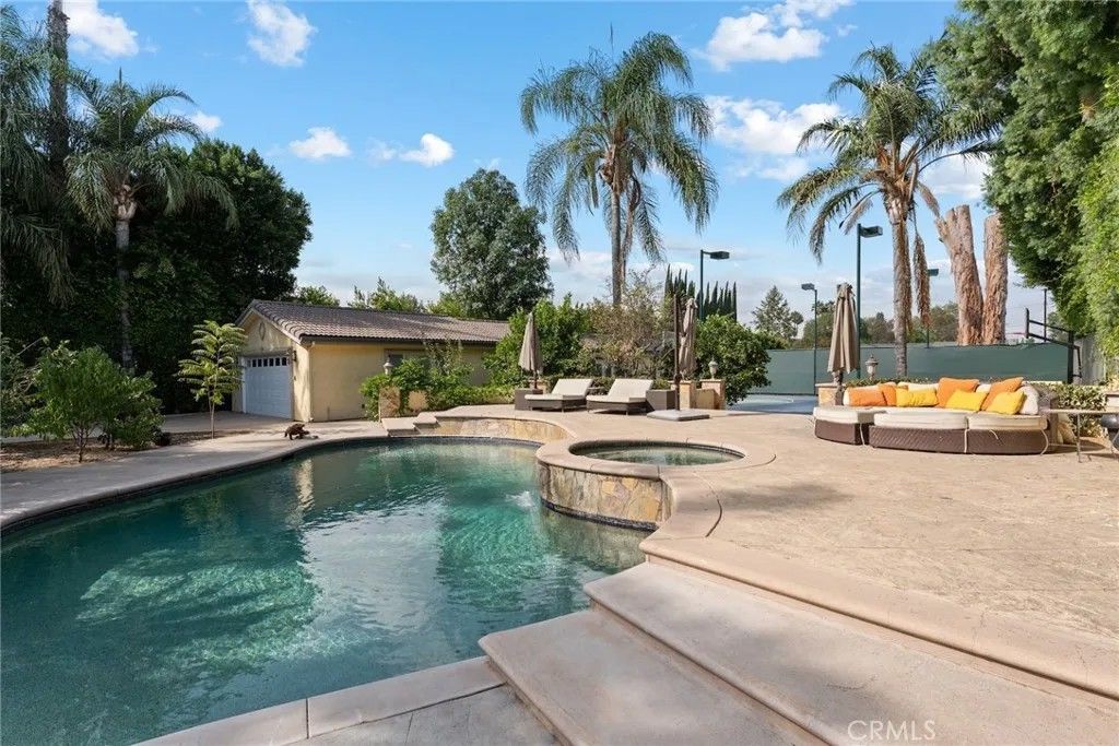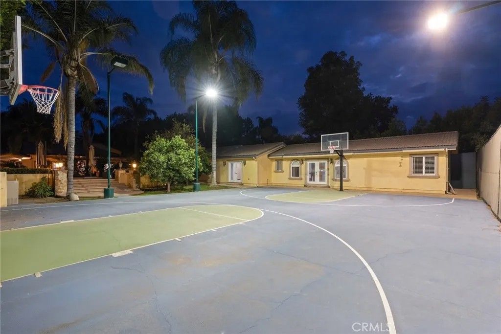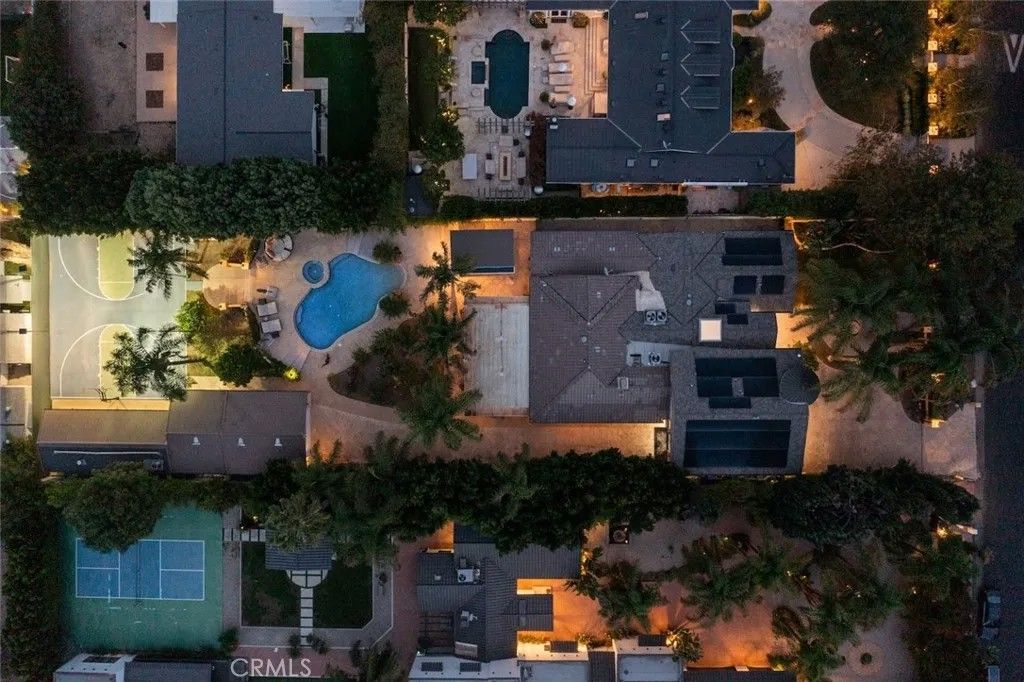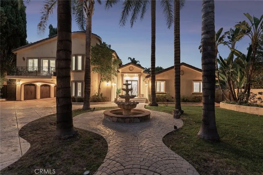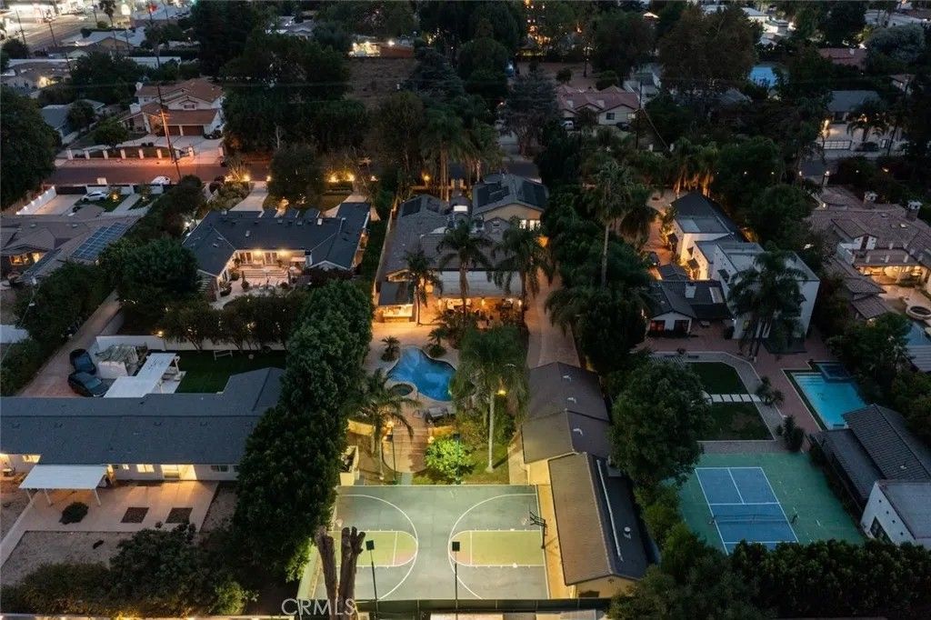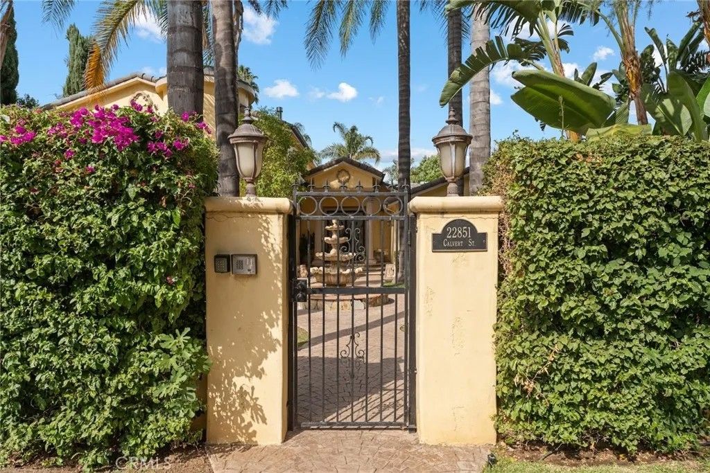 Custom gated Walnut Acres Italian Villa featuring a primarily one level main residence plus a detached oversized guest house situated on an expansive 26,000 SF flat lot. The private estate is secured behind an automatic security gate with separate pedestrian access and lush landscaping including full growth hedging and towering mature palms. The front yard features a sprawling driveway that can accommodate parking for large scale events and RVs/boats with a separate additional long gated driveway that leads to a covered carport and 2-car garage. Step inside to find a completely open concept floor plan with architectural design elements and designer finishes. A massive grand entry foyer with soaring ceiling and skylight basks the space with wonderful natural light. The foyer opens to a large great room with French doors that open to the backyard. Separate sitting and family rooms share a double-sided fireplace and wet bar. The vast chefs kitchen is highlighted by a sushi bar inspired wraparound countertop peninsula and boasts Sub Zero 36 column fridge & freezer and Viking range with double ovens & 6-burner grill + griddle. The formal dining room has built-in storage cabinetry and French doors that open to the yard. A separate living room off the entry features fireplace, built-ins, and a second wet bar. The entire second level is dedicated to a luxurious primary suite featuring an enormous bedroom with sitting room/office, wet bar, fireplace, front & back balconies, large walk-in closet, storage room with laundry hookups, and spa-like bathroom with dual sinks, steam shower, spa tub, & toilet room. The home truly lives like a one story featuring 4 well appointed bedrooms downstairs including a first level primary suite with en-suite bathroom with walk-in shower and separate spa tub. First floor also has a guest powder bath and second laundry room. The entertainers backyard is a true oasis featuring beach entry pebble pool & spa, large covered patio with fire pit, separate outdoor kitchen with two BBQ grills, lighted sports court with two basketball hoops, and lushly landscaped grounds with lawns, fruit trees, & mature palms. The 1 bed, 1 bath guest house features living room with vaulted wood beamed ceiling and fireplace, full kitchen, and separate gym/bonus/game room. Total SF includes guest house. Paid off Solar panels! Adjacent to Westfield Mall/Village, Calabasas Commons, Warner Center & zoned for award-winning El Camino & Hale charter schools.