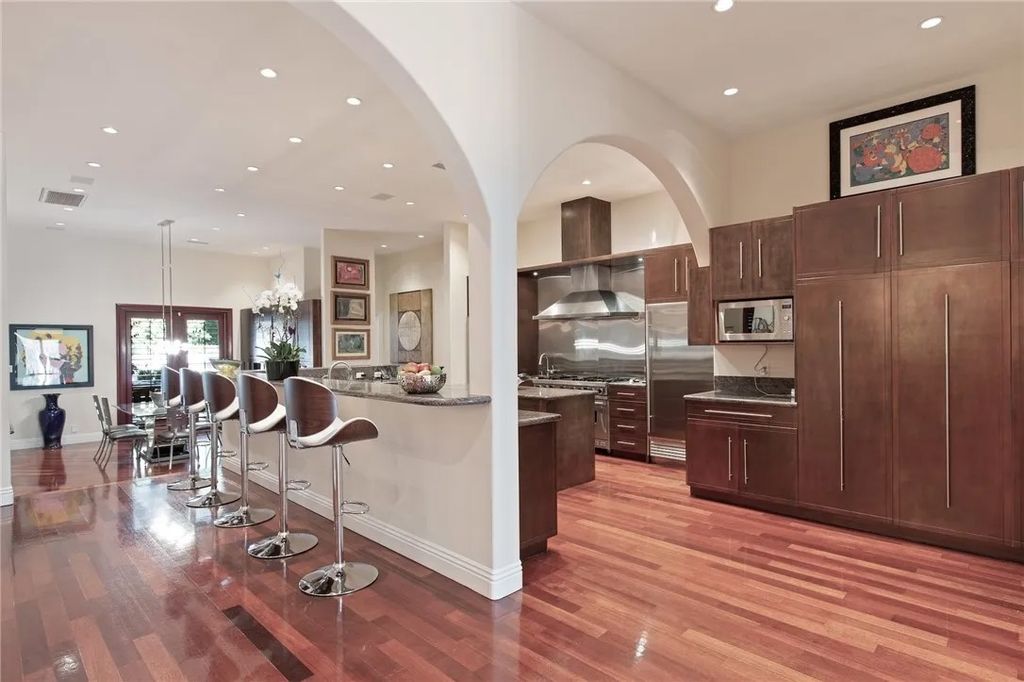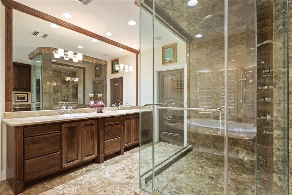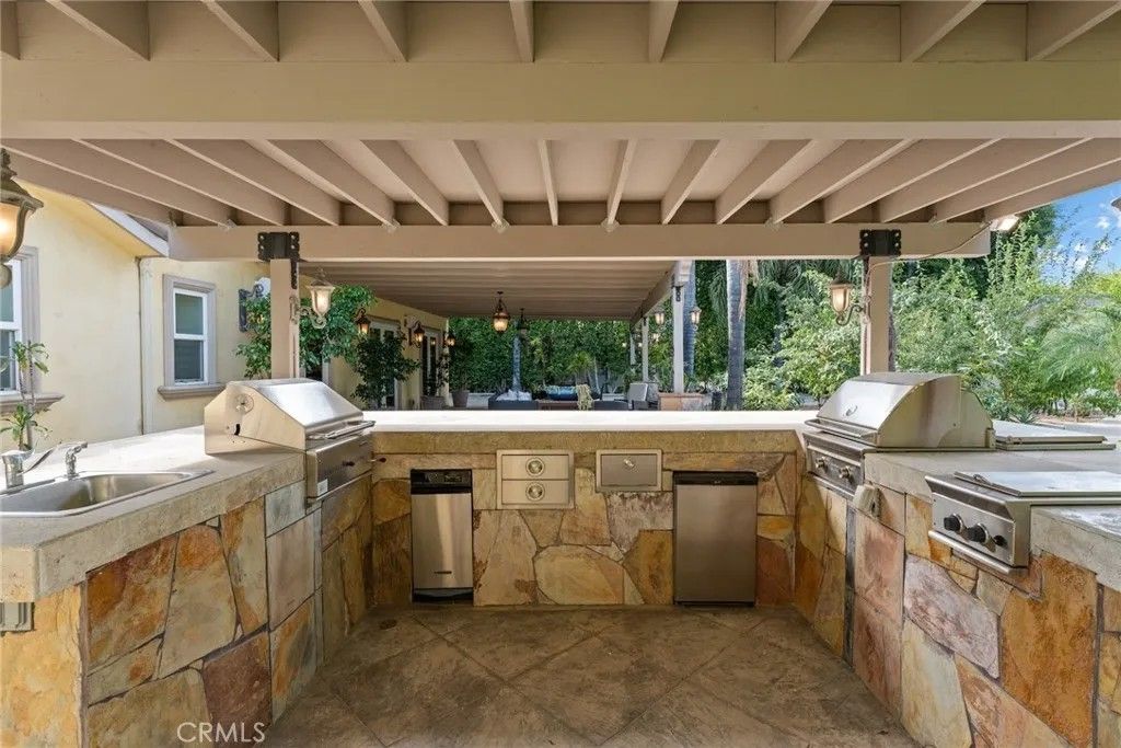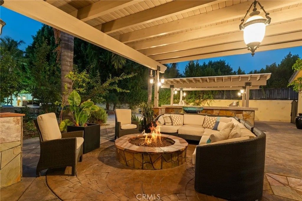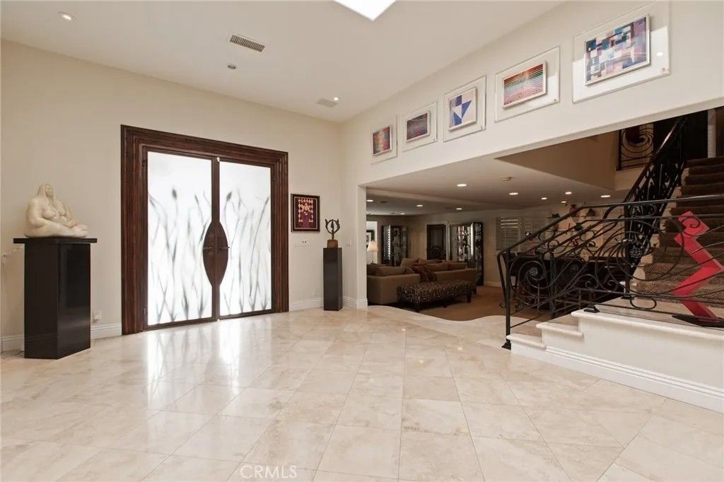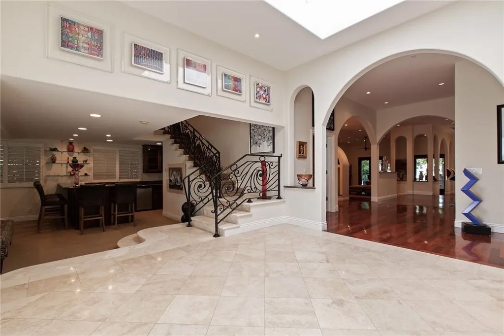 Custom gated Walnut Acres Italian Villa featuring a primarily one level main residence plus a detached oversized guest house situated on an expansive 26,000 SF flat lot. The private estate is secured behind an automatic security gate with separate pedestrian access and lush landscaping including full growth hedging and towering mature palms. The front yard features a sprawling driveway that can accommodate parking for large scale events and RVs/boats with a separate additional long gated driveway that leads to a covered carport and 2-car garage. Step inside to find a completely open concept floor plan with architectural design elements and designer finishes. A massive grand entry foyer with soaring ceiling and skylight basks the space with wonderful natural light. The foyer opens to a large great room with French doors that open to the backyard. Separate sitting and family rooms share a double-sided fireplace and wet bar. The vast chefs kitchen is highlighted by a sushi bar inspired wraparound countertop peninsula and boasts Sub Zero 36 column fridge & freezer and Viking range with double ovens & 6-burner grill + griddle. The formal dining room has built-in storage cabinetry and French doors that open to the yard. A separate living room off the entry features fireplace, built-ins, and a second wet bar. The entire second level is dedicated to a luxurious primary suite featuring an enormous bedroom with sitting room/office, wet bar, fireplace, front & back balconies, large walk-in closet, storage room with laundry hookups, and spa-like bathroom with dual sinks, steam shower, spa tub, & toilet room. The home truly lives like a one story featuring 4 well appointed bedrooms downstairs including a first level primary suite with en-suite bathroom with walk-in shower and separate spa tub. First floor also has a guest powder bath and second laundry room. The entertainers backyard is a true oasis featuring beach entry pebble pool & spa, large covered patio with fire pit, separate outdoor kitchen with two BBQ grills, lighted sports court with two basketball hoops, and lushly landscaped grounds with lawns, fruit trees, & mature palms. The 1 bed, 1 bath guest house features living room with vaulted wood beamed ceiling and fireplace, full kitchen, and separate gym/bonus/game room. Total SF includes guest house. Paid off Solar panels! Adjacent to Westfield Mall/Village, Calabasas Commons, Warner Center & zoned for award-winning El Camino & Hale charter schools.