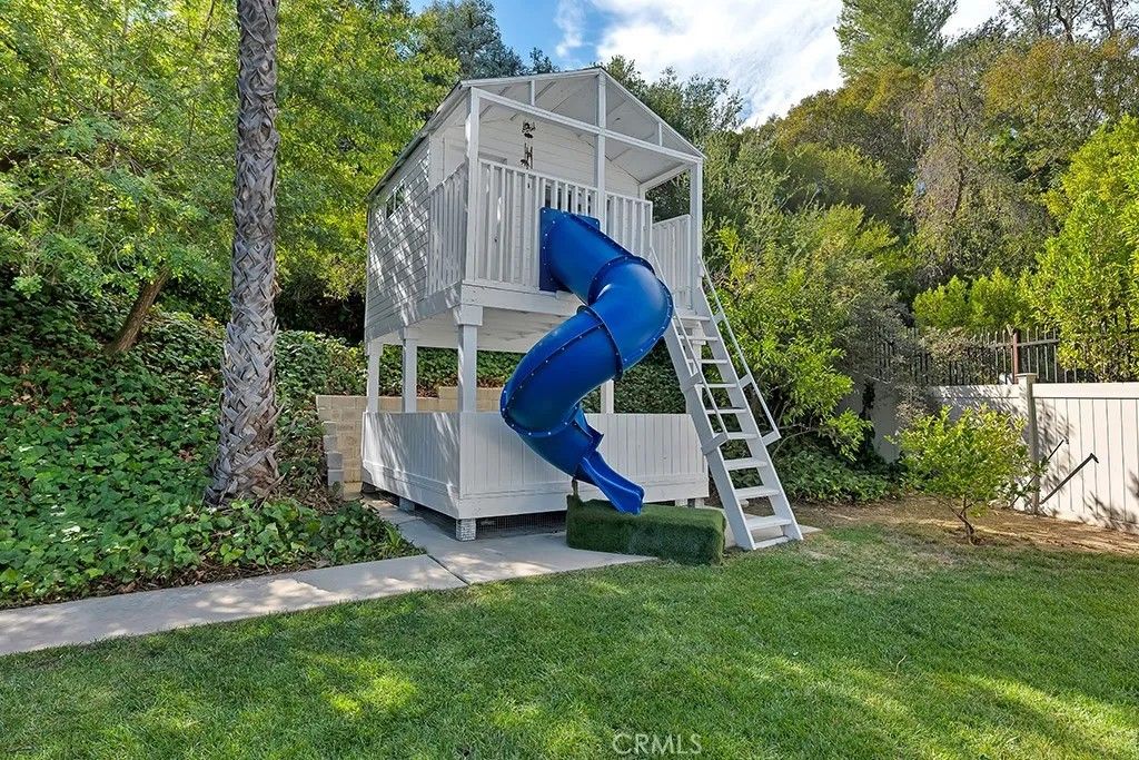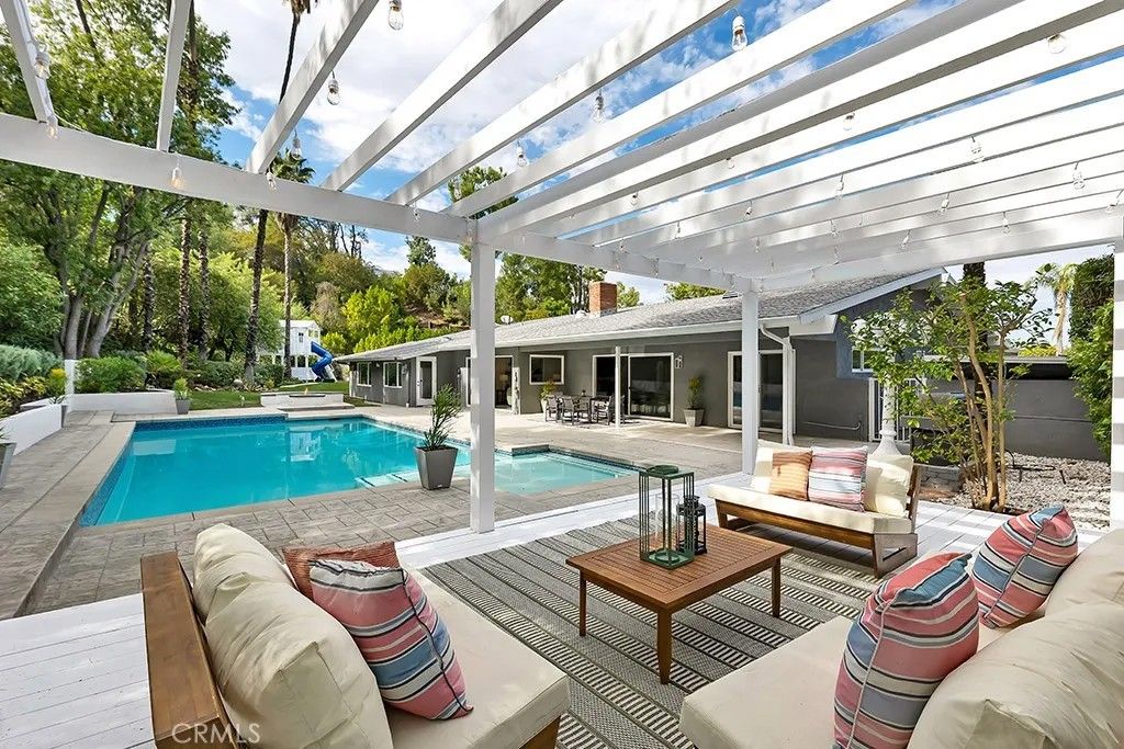 Welcome to your private sanctuary tucked away on a peaceful cul-de-sac in the highly sought-after hills of Tarzana. This luxuriously renovated single-story home offers 5 bedrooms, 4 bathrooms, and 3,386 sq ft of refined living space on a sprawling 21,529 sq ft lot designed for both relaxation and entertaining. Step inside to experience the seamless flow of this modern open-concept layout, filled with natural light and sophisticated finishes. The heart of the home is the designer kitchen, featuring custom cabinetry, a striking black arabesque tile backsplash, professional-grade stainless steel appliances, and an oversized granite island perfect for gatherings. The kitchen opens to expansive living and dining areas anchored by a floor-to-ceiling double-sided stone fireplace, creating an inviting ambiance for both casual and formal entertaining. Retreat to the spacious primary suite, complete with a walk-in closet, spa-inspired ensuite, and a private bonus room ideal for a home office, gym, or nursery. Each bedroom is thoughtfully positioned for privacy and comfort, including a guest suite with its own bath. Outside, experience your very own resort-style paradise. The sparkling pool with a Baja shelf invites you to unwind under the California sun, while the covered patio and string-lit pergola offer the perfect setting for al fresco dinners and weekend gatherings. A large grassy lawn provides space for kids or pets to play, complete with a charming 2-story treehouse and slide, while a hillside viewing deck delivers breathtaking sunset views over Tarzanas rolling landscape. Blending luxury, comfort, and tranquility, this home perfectly captures the essence of Southern California living a rare find in one of Tarzanas most desirable neighborhoods. Close to premier shopping, dining, and top-rated schools, this property truly has it all.