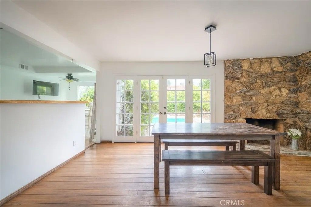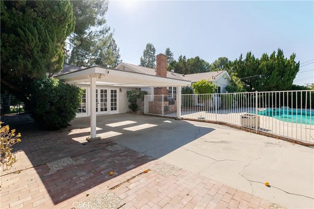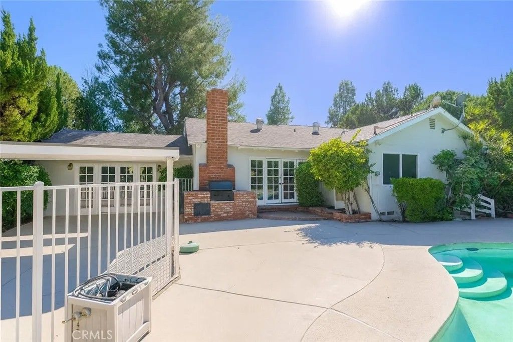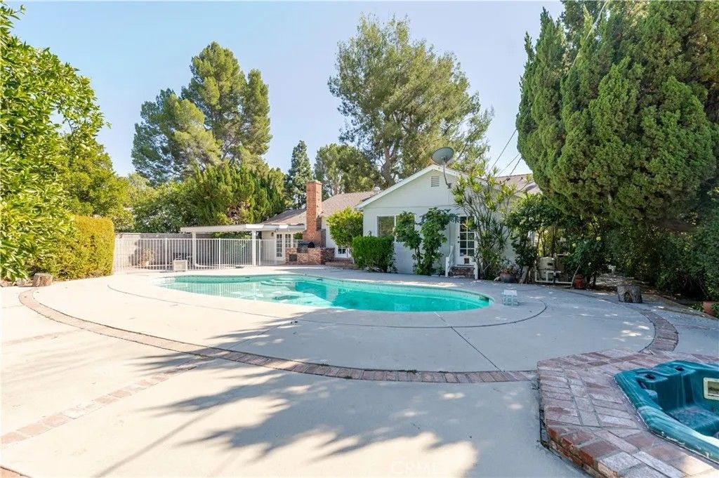 Absolutely gorgeous Porter Ranch pool home with nearly 2,000 sq. ft. of living space on an over 10,000 sq. ft. landscaped lot featuring a pool and RV access. Pride of ownership is evident throughout with hardwood floors, a bright formal dining room with French doors, breakfast bar, and rock fireplace. The spacious family room offers vaulted wood-beamed ceilings, wet bar, French doors, and new laminate flooring. The kitchen includes tiled counters, double oven, cabinetry, and a breakfast nook. The primary suite boasts hardwood floors, ample closets, vanity, and an updated bath, while the secondary bedrooms also feature hardwood floors and ceiling fans. Enjoy the entertainers backyard with sparkling pool and spa, large patio, brick BBQ, fruit trees, and covered parking with private entry. Recent upgrades include new roof, windows, recessed lighting, and freshly painted inside and out.