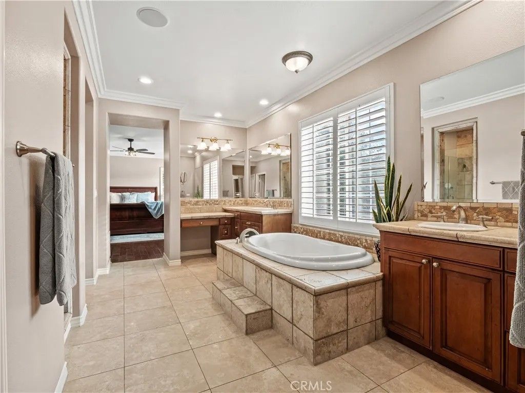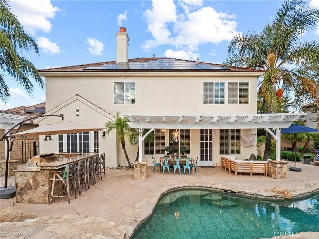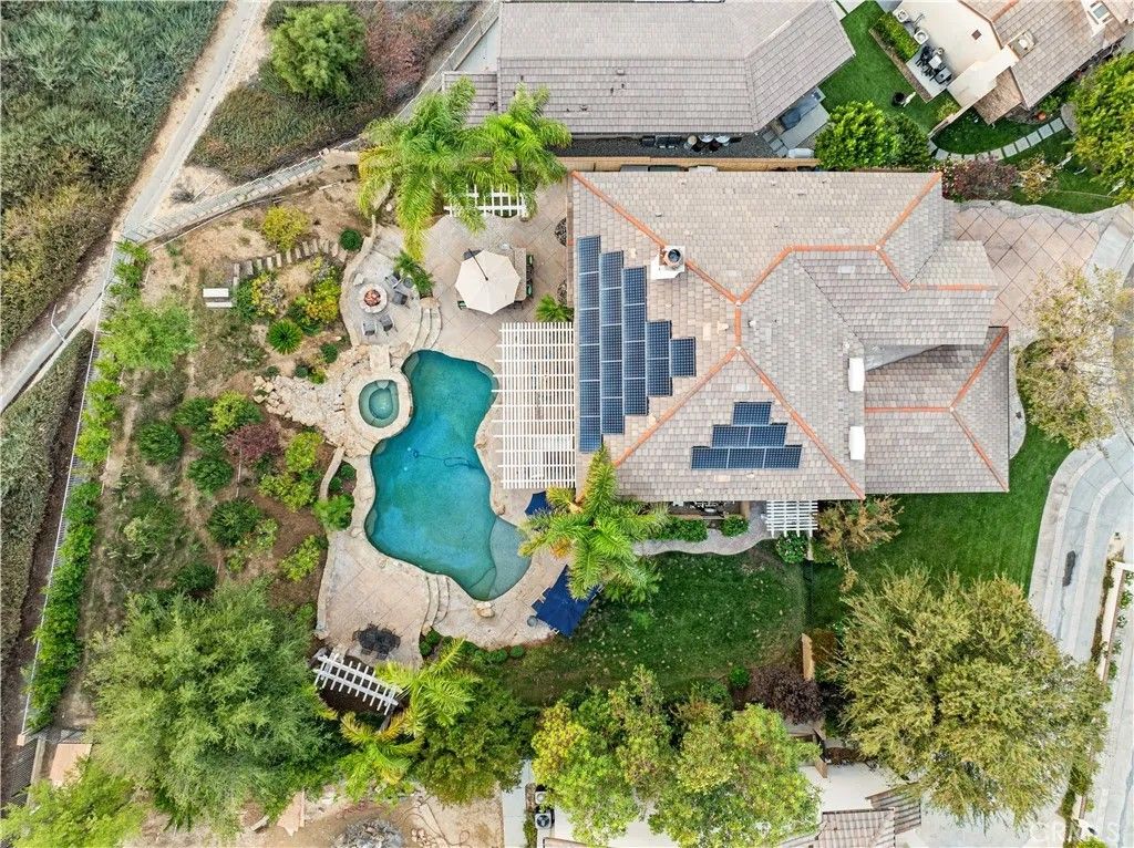 Luxurious Westridge Pool Home, Located on a cul-de-sac with over 14,000 SQFT of space, this stunning 5-bedroom, 4.5-bath home offers nearly 4,000 SQFT of upgraded living with $200K in improvements and solar! Step inside to find a double door entry formal office with front yard views and an elegant dining room adorned with wainscoting, designer fixtures and french doors leading to the side yard. The chefs eat-in kitchen boasts a massive island, quartz countertops, upgraded backsplash, Viking appliances including double ovens and warming drawer, a walk-in pantry, built-in desk, and breakfast nook overlooking the backyard. The kitchen opens to the spacious living room featuring a striking stone accent wall with fireplace, mantel, hearth seating, and a custom-built entertainment center. The first level also offers a powder room, mudroom/laundry area, and a large bedroom with ensuite bathroom and French doors leading to the yardideal for guests or multi-gen living. Upstairs, a grand staircase leads to a luxurious primary suite with a cozy fireplace and spa-like ensuite complete with soaking tub, dual sinks, vanity, glass-enclosed walk-in shower with seating, and large walk-in closet. Additional bedrooms include one with an ensuite bath, two with a Jack-and-Jill bathroom, and a versatile bonus room with built-in desks, storage, and a private balcony. Interior highlights include crown molding, upgraded flooring, shutters throughout, surround sound, new water heater, and upgraded lighting. The backyard is an entertainers paradise, featuring a heated pebble tech pool and spa with waterfalls and baja shelf, multiple seating areas, built-in firepit, outdoor kitchen, pergola-covered patio, lush lawn, and designer landscaping with upgraded lighting. Finished with a 3-car tandem garage and oversized driveway, this home sits within the prestigious Westridge community offering resort-style amenities including multiple pools, tennis courts, and TPC golf course. Conveniently located near award-winning schools Oak Hills Elementary, Rancho Pico Junior High and West Ranch High School, parks, restaurants, and shopping with easy freeway access. This home is a MUST see!!!
