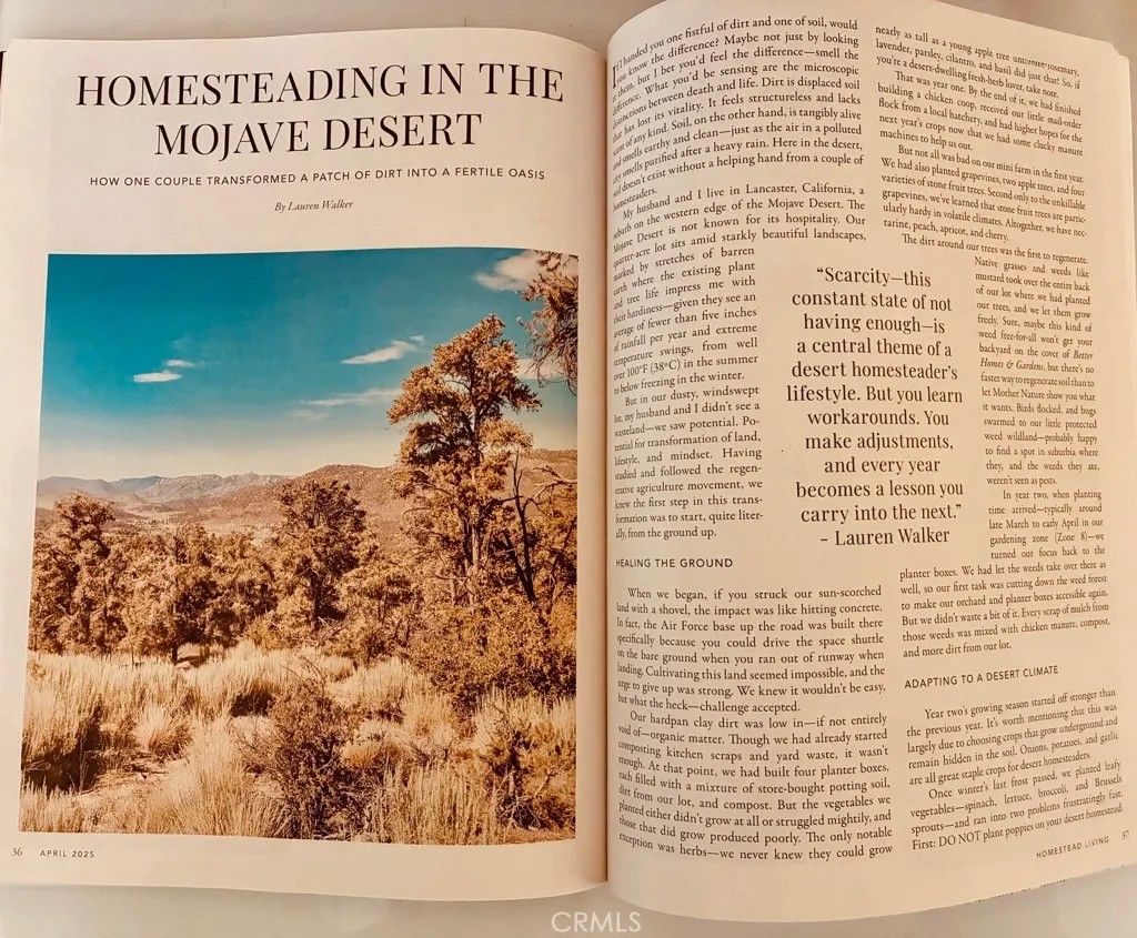 Desert Oasis - Featured in Homestead Living Magazine! Discover sustainable desert living at its finest in this charming 3-bedroom, 2.5-bath retreat showcased in the Spring 2025 edition of Homestead Living Magazine. This one-of-a-kind property features a delightful orchard with apple, cherry, peach, apricot, and nectarine trees, along with grapevines and four irrigated raised garden beds ready for planting. Modern upgrades include new double-pane windows and a new furnace, ensuring year-round comfort. The 120 sq. ft. powered workshop with loft, paved and covered work area, and garden shed provide exceptional flexibility for hobbies or projects. A chicken coop with water and electricity, 550-gallon water tank with pump, outdoor kitchen, and cozy fire pit make this home a true self-sufficient haven. Ideally located near Desert Christian High School, Antelope Valley College, and AV Medical Center, this lush, peaceful property blends creativity, comfort, and convenience into one serene homestead.