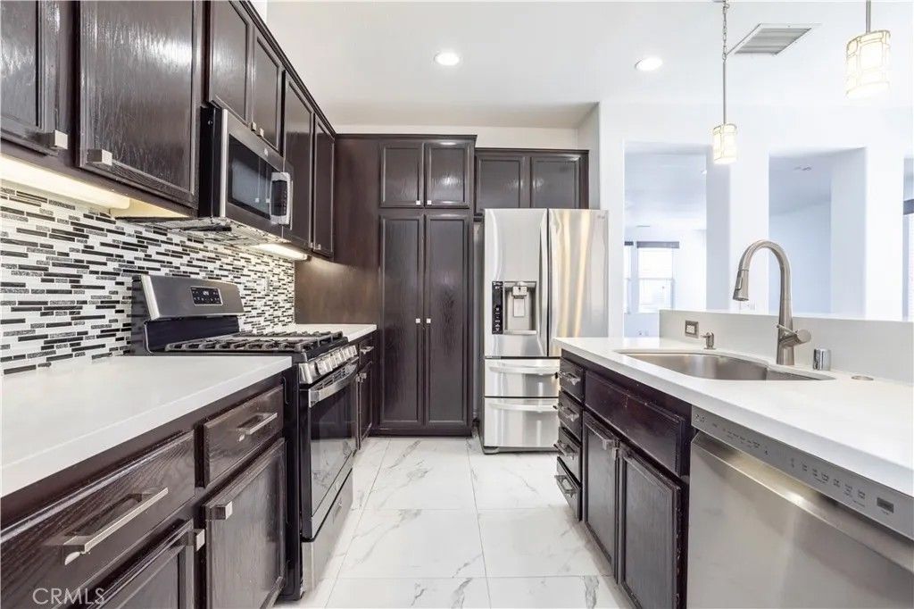 Welcome to this beautifully upgraded 3-bedroom + loft (optional 4th bedroom), 3-bath gem nestled in the highly sought-after Milestone community. Spanning 2,023 sq. ft., this turnkey residence blends modern elegance with everyday comfortjust bring your bags! Step into a chefs dream kitchen featuring white quartz countertops, sleek white tile flooring, and brand-new stainless steel appliances: dishwasher (2024), stove & oven (2024), and microwave (2025). Rich engineered hardwood floors flow throughout the home, complemented by abundant natural light and a flexible loft space ideal for a home office or guest room. Enjoy peace of mind with recent upgrades, including fresh exterior paint (2024), termite fumigation (2024), new water heater (2023), and fully PAID-OFF SOLAR panelsa major bonus for energy savings and long-term value. The backyard is an entertainers paradise, perfect for weekend BBQs or quiet evenings under the stars. The finished garage features premium epoxy flooring for added style and durability. Located just minutes from CA-118 freeway access and walking distance to top-rated schools, parks, restaurants, and shoppingthis home offers the perfect blend of convenience and community.