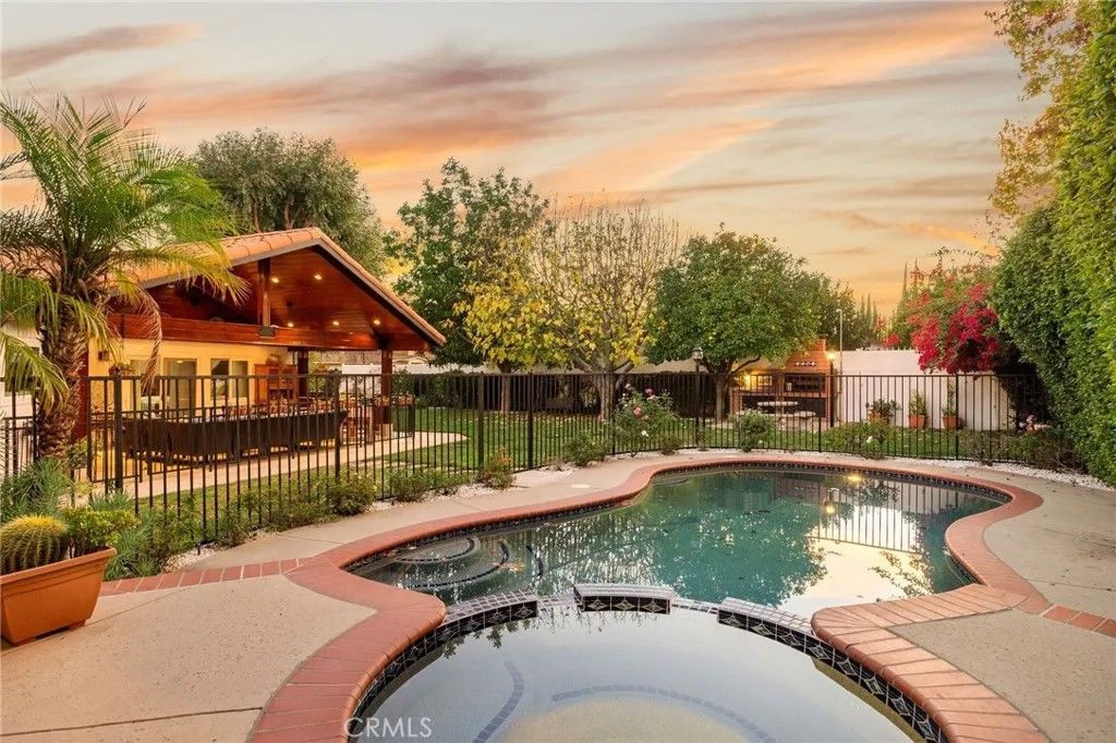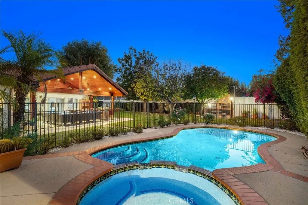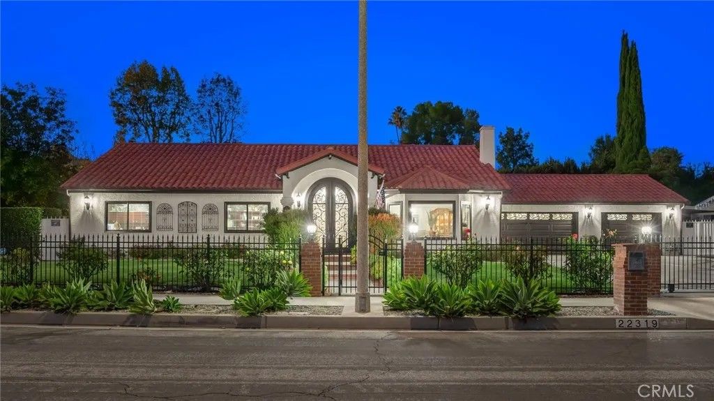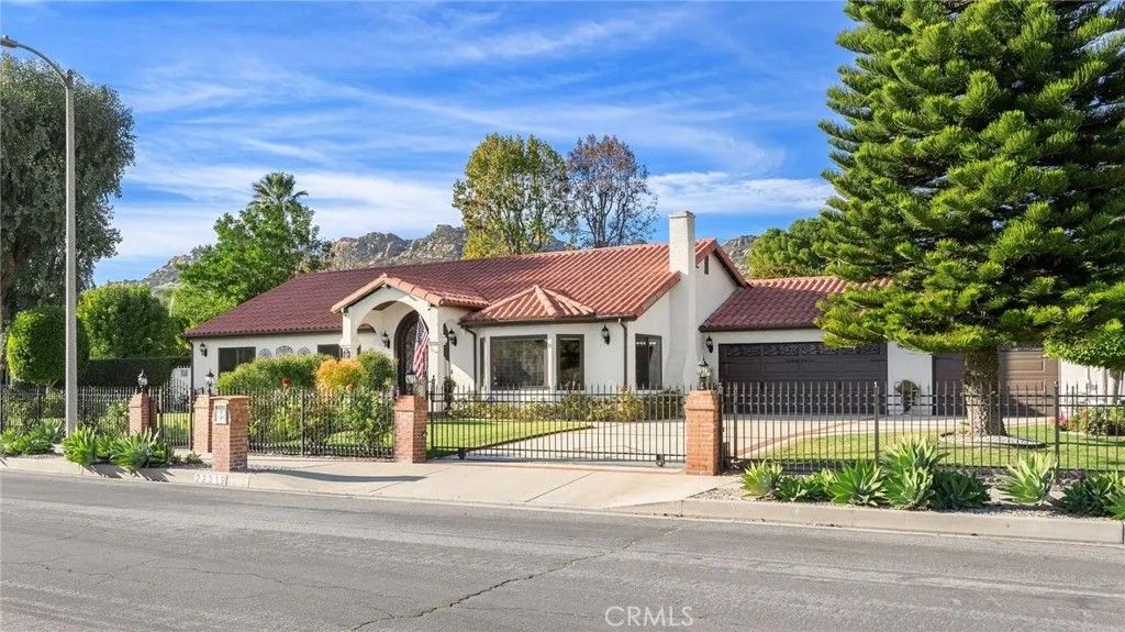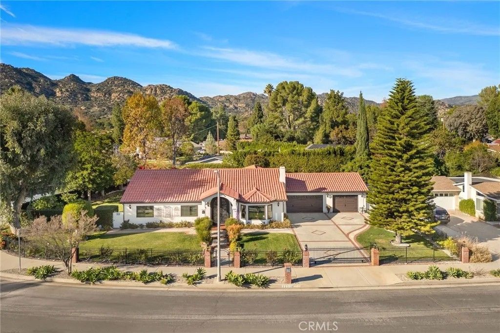 Gated, corner lot single-story home with a three-car garage located in one of Chatsworths most desirable neighborhoods, where homes rarely come on the market. Offering nearly 3,000 sq ft of living space on an expansive lot of over 16,000 sq ft, this well-maintained residence provides space, comfort, and inviting indoor-outdoor living. Upon entry, dramatic smoked-glass and wrought-iron double doors welcome you into a warm and thoughtfully updated interior featuring a combination of polished travertine flooring with designer insets and high-quality oak hardwood floors. The home has been recently refreshed with new interior paint and updated hardware in 2025, while longtime owners have consistently maintained and upgraded the property over the years. The floor plan includes formal living and dining rooms with fireplace, a spacious family room with backyard access and views, and a functional kitchen with oak cabinetry, slide-out storage drawers, and a breakfast bar. The home offers four bedrooms and is currently configured as a three-bedroom, with easy potential to convert back. The oversized covered lanai is a standout feature, offering space for both a full seating area and dining area, and is finished with stained wood ceilings, recessed lighting, and ceiling fans. The backyard includes a pool and spa (resurfaced 2023), new pool equipment (2023), outdoor kitchen, separate gazebo/sunning area, large grassy lawn, mature trees and lush greenery creating a private feel, and a fenced dog run with a recently updated canine cabin. Additional features include electric gates, Milgard windows, HVAC less than 10 years old, and new insulation installed in 2025. Conveniently located near hiking trails, parks, and the natural beauty that defines Chatsworth.