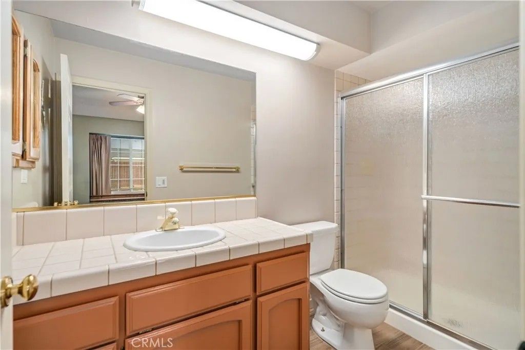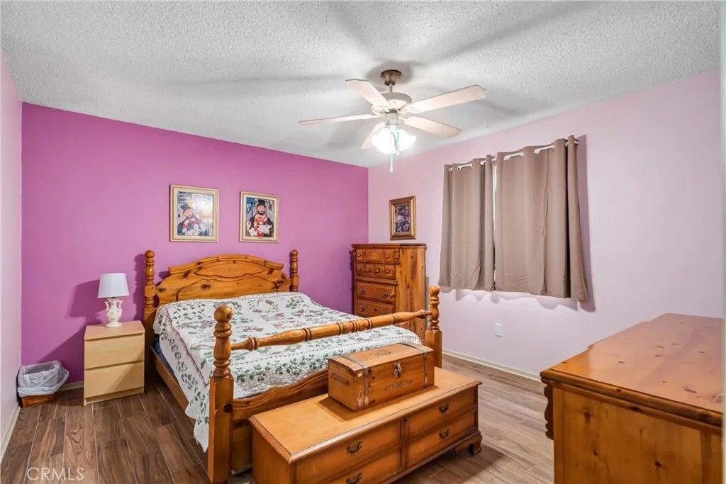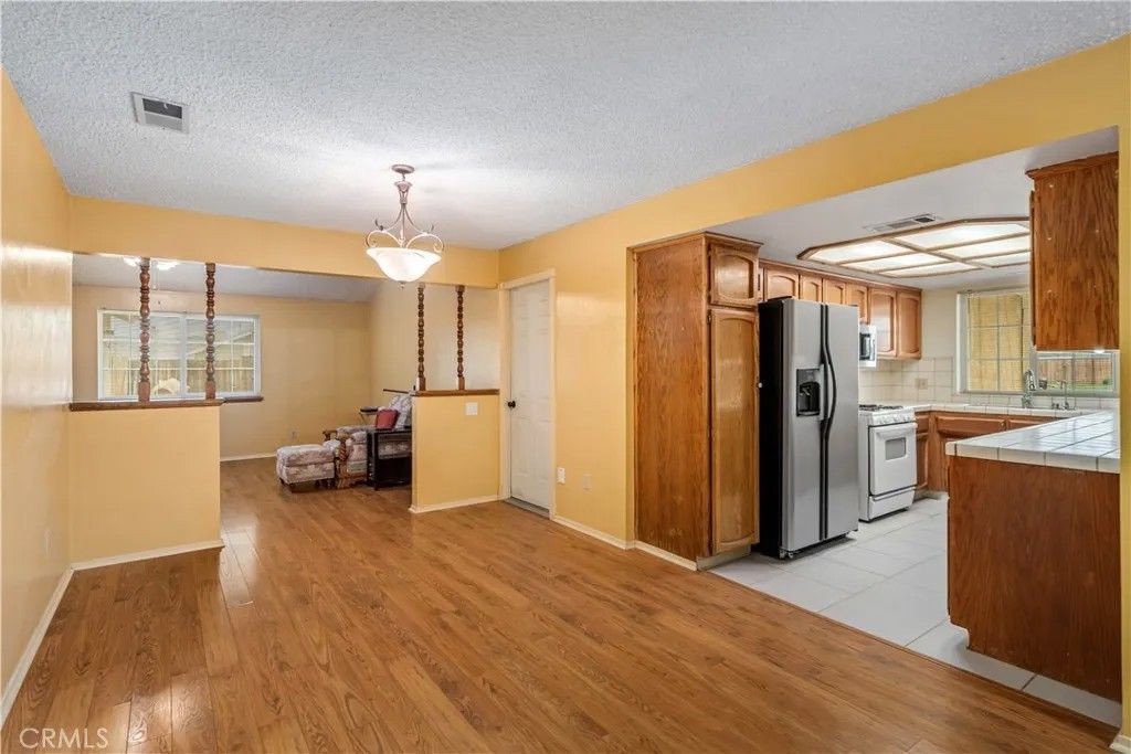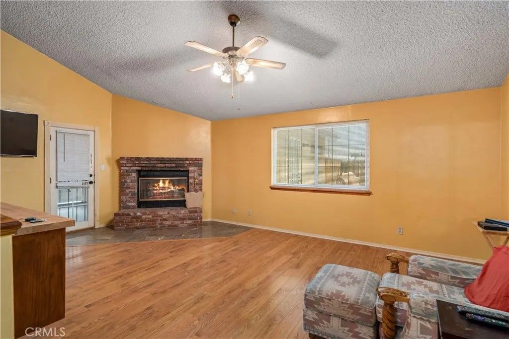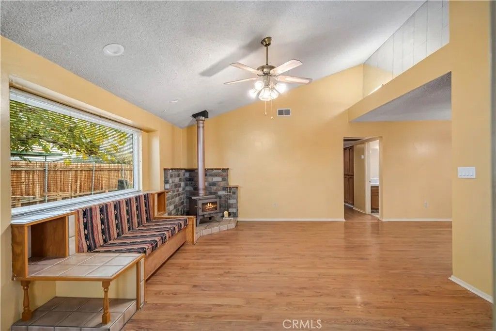 Well-maintained and energy-efficient 3-bedroom, two full bath single-story home with extensive upgrades and flexible living space. Features laminate and wood-tile flooring throughout. The living room offers a pellet stove and a ceiling fan. The family room includes laminate flooring, a brick hearth fireplace, and built-in cabinetry. Permitted 22' x 13' bonus room with separate entry, mini-split system, and dedicated solar panels covering utilities for that roompossible ADU or guest suite (buyer to verify with city). Ideal for extended family, home office, or rental-style use. The kitchen features tile flooring and counters, with a microwave included. Dining area with laminate flooring. Both bathrooms are full baths and have been updated with tile counters and tile floors; the second bath includes a walk-in shower. Bedrooms feature upgraded flooring and updated closet doors. Additional highlights include a heat pump with new ducting, hardwired security cameras, a whole-house vacuum system plumbed, updated windows (including atrium windows, approx. 8 years old), rain gutters, an enclosed patio with a ceiling fan, a wood-fenced backyard, and a shed. The garage offers 220V wiring with a compressor included, plus a washer and dryer; all appliances stay. The main house roof is less than one year old. Solar installed in 2022 at approx. $138/month, covering all Edison electric usage. Move-in ready home offering energy efficiency, versatility, and strong potential for added value. Call today won't last long!!!