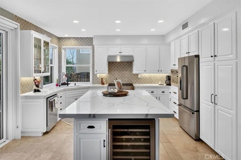 Welcome to this pristine, move-in-ready home in the highly sought-after Northlake community of Castaic, where pride of ownership shines throughout. Offering 4 bedrooms and 3 bathrooms, including a full bedroom and bathroom conveniently located downstairs, this home checks every box. Step inside to the formal living and dining rooms, highlighted by soaring ceilings, box-molded framed windows with shutters, and elegant travertine flooring throughout the downstairs. The incredible, remodeled kitchen is a true showstopper, featuring an extra-large center island with built-in wine refrigerator, pull-out storage on both sides, double-edged quartz countertops, and a Thermador stove and oven with a 36 professional-grade gas range. Stainless steel appliances and a stunning Italian tile backsplash that extends to the ceiling complete this chefs dream kitchen, which opens seamlessly to the family room. The family room offers a cozy fireplace, built-in TV nook (TV included!), and newer Milgard windows with updated window shades in both the family room and kitchen. Upstairs, youll find Brazilian Koa wood flooring, crown molding, and a loft overlooking the living room with shutters. All three additional bedrooms include ceiling fans. The primary suite enjoys a peaceful backyard view and features a spacious primary bathroom with enhanced lighting, marble flooring, tile countertops, dual sinks with newer faucets, and a large walk-in closet. The backyard is a true retreat, showcasing a permitted pavilion with gutters and ground drains, pavers, a beautiful fountain, and a lush grassy yard complete with sprinklers, mature plants, flowers, and treesperfect for relaxing or entertaining. Additional upgrades include a newer air-conditioner and thermostats (upstairs and downstairs), newer heater, whole-house fan, tankless water heater, entire home re-plumbed, re-circulating hot water pump, and whole-house water filtration systemmaking this home both energy-efficient and thoughtfully upgraded. Enjoy Northlake HOA amenities including a pool, spa, and clubhouse, all while living in a home where there is truly nothing to do but move in and enjoy.