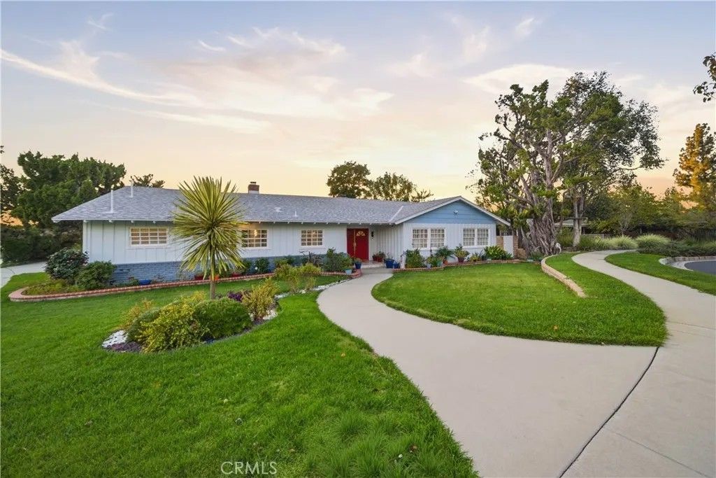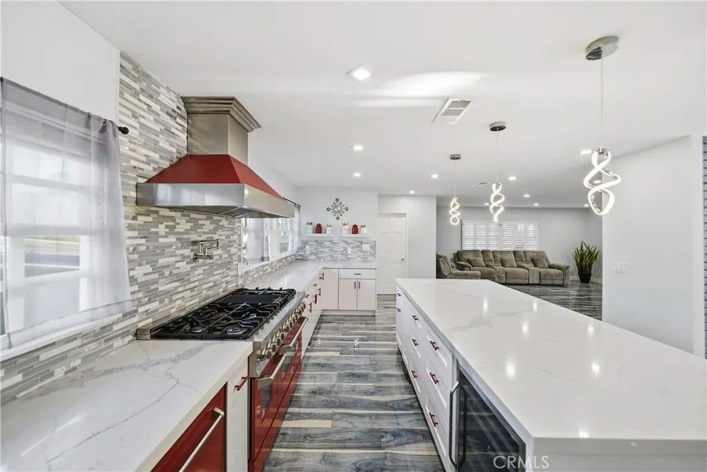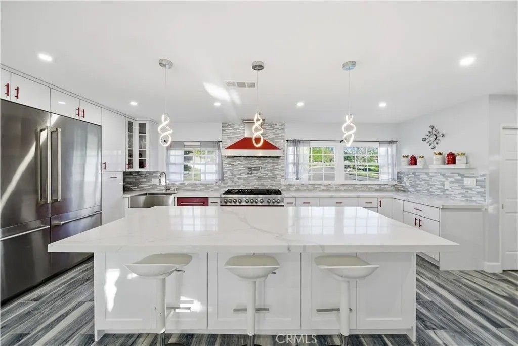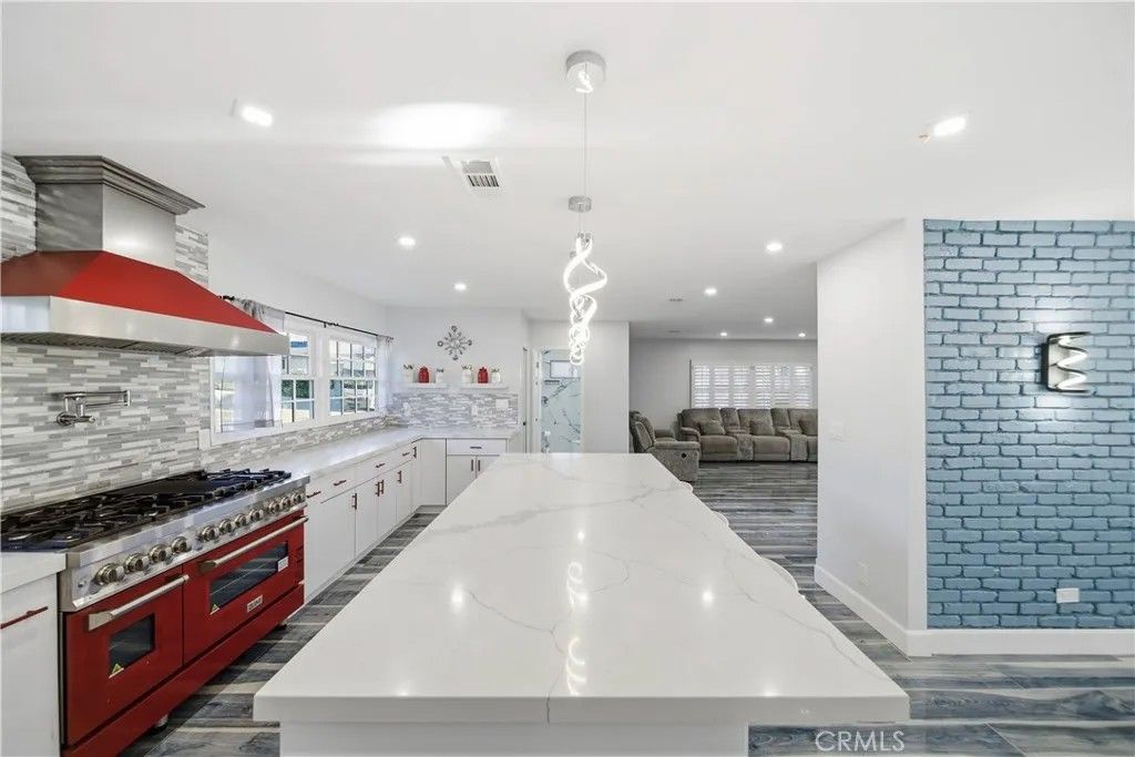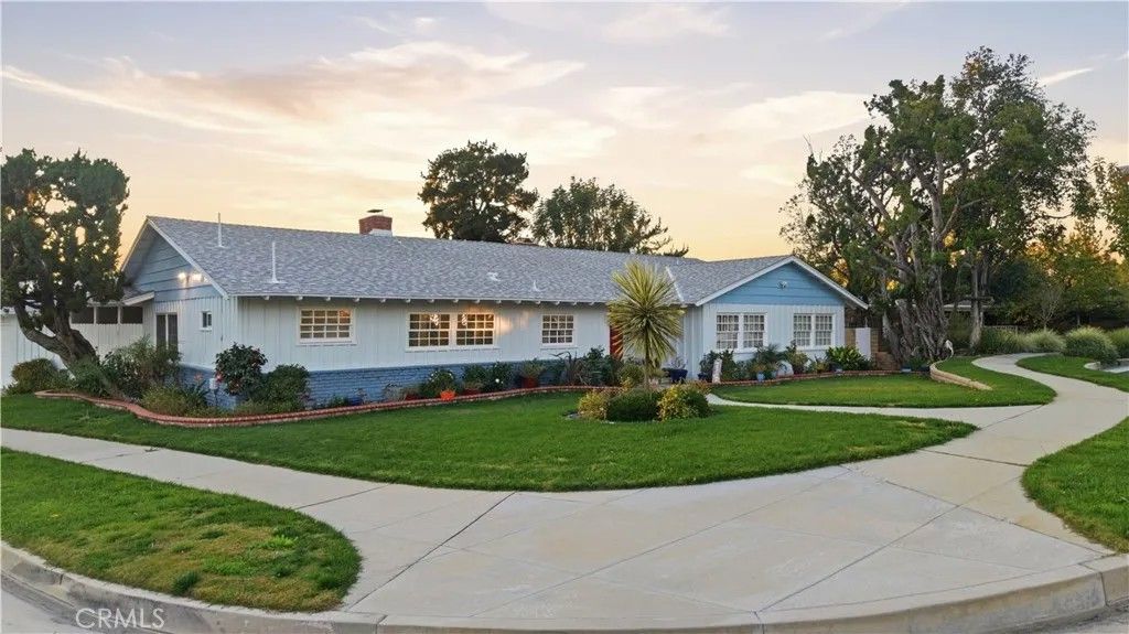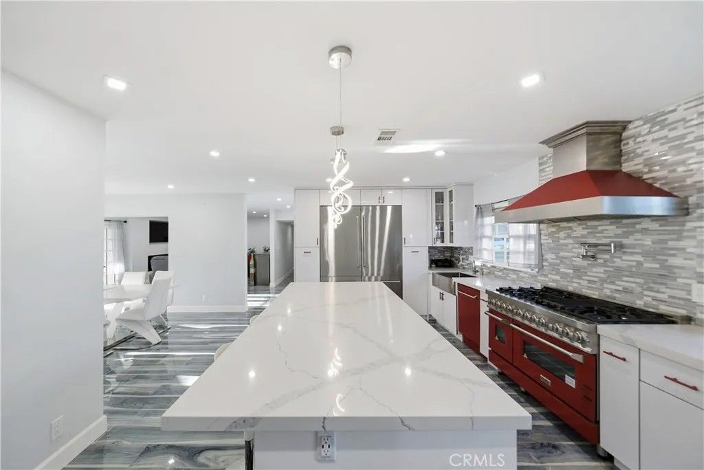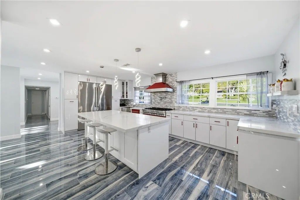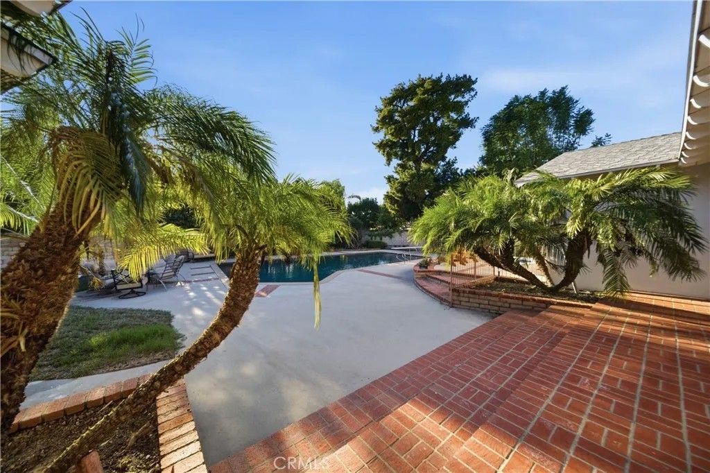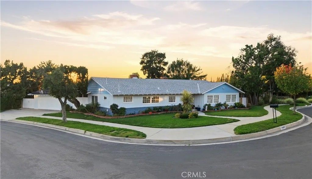 Brand new roof, solar panels in place, ADU potential, and a prime location that continues to be a favorite among Northridge buyers. Sprawling single story living in the desirable Scottish Terrace Estates. Nearly 2,800 square feet, all on one level, with elegant porcelain wood-look tile flooring throughout. Step inside to a wide open floor plan designed for both everyday living and entertaining. The gourmet kitchen is positioned at the front of the home and serves as a true focal point. This chef-inspired kitchen is thoughtfully appointed with a high-end ZLINE appliance package, featuring a stainless steel 7-burner double-oven range with statement hood, ZLINE dishwasher, stainless steel farmhouse sink, trash compactor, pot filler, built-in luxury refrigerator, and wine cooler. White cabinetry is elevated with bold red hardware accents, complemented by quartz countertops and a modern gray-toned tile backsplash. The open concept layout flows seamlessly from the kitchen into the family room, formal living room, and dining area. Designed for an indoor-outdoor lifestyle, sliding doors from the main living spaces open to a private backyard retreat featuring a pool and spa, lush greenery, usable lawn, and a massive covered patio with vaulted ceilings. The home offers four bedrooms and three bathrooms, each finished with elevated, spa-inspired details. The bath is a standout, featuring a massive glass enclosed wet room with a freestanding soaking tub set against a floor to ceiling tile wall. High-end finishes include sleek matte black hardware and LED backlit mirrors over dual vanities. Situated on a corner lot, this true single story ranch offers a wrap-around lawn, wide concrete driveway, and detached two car garage enhancing both privacy and ADU potential. The home also features a convenient indoor laundry room with washer and dryer hookups and a utility sink for added functionality. A rare opportunity offering space, flexibility, and timeless single level living, ready for its next owner.
