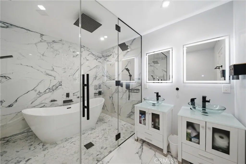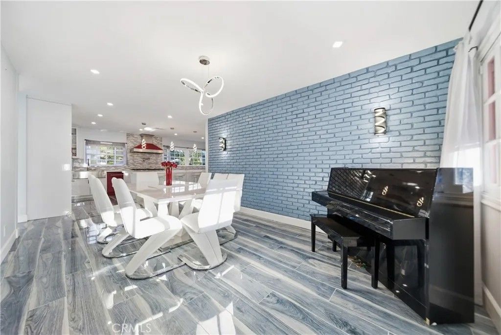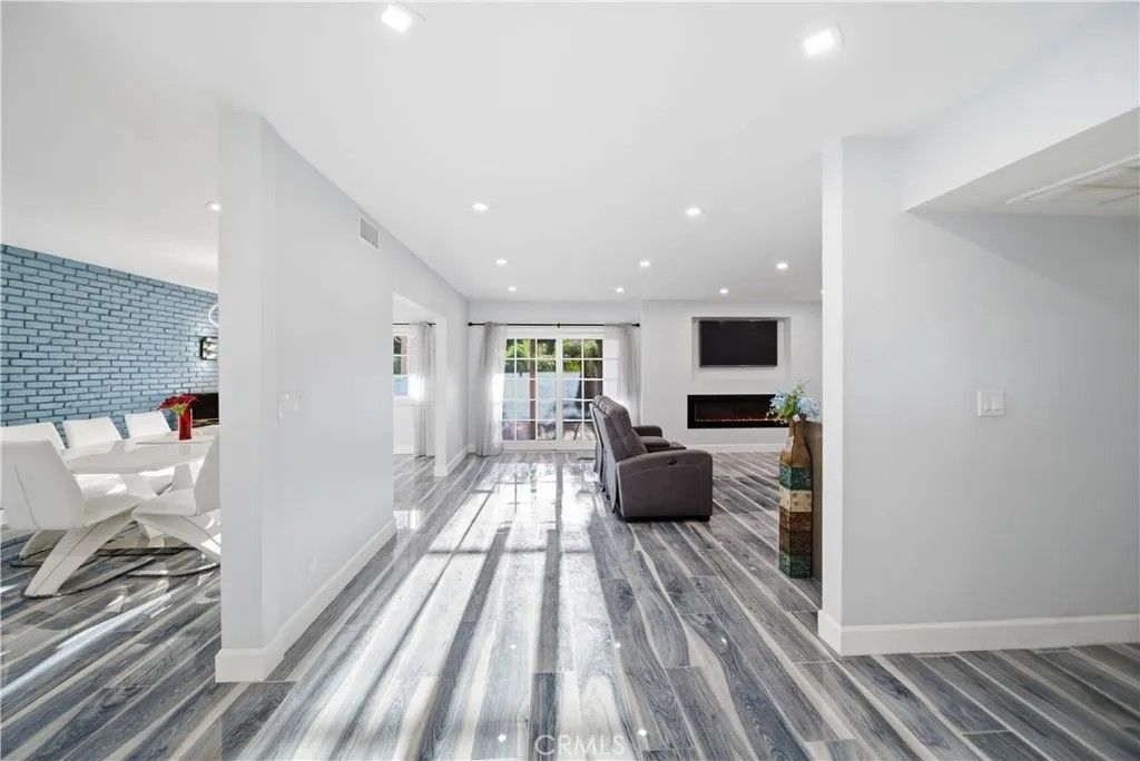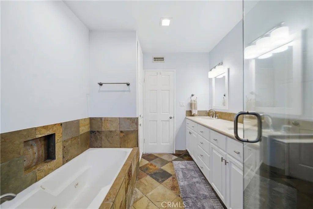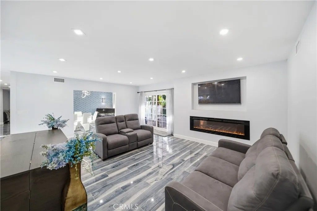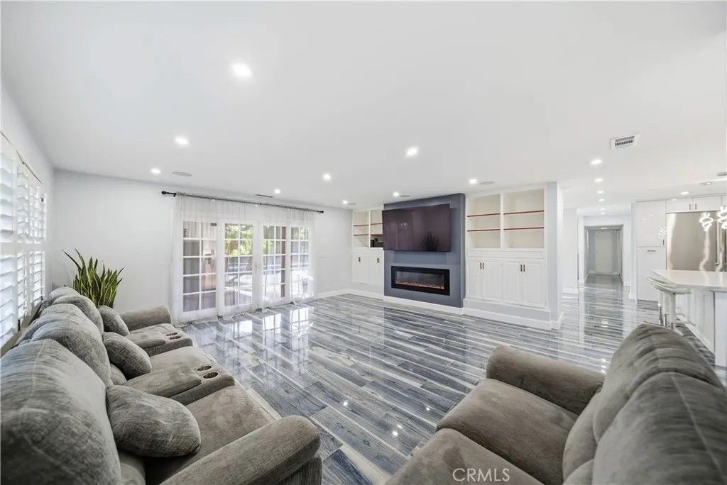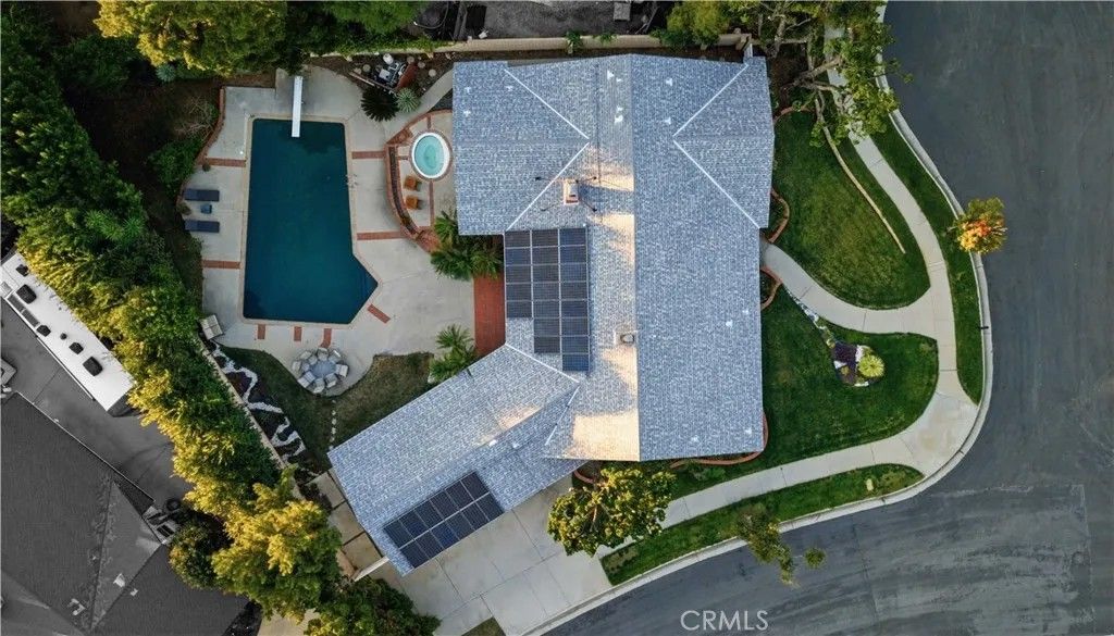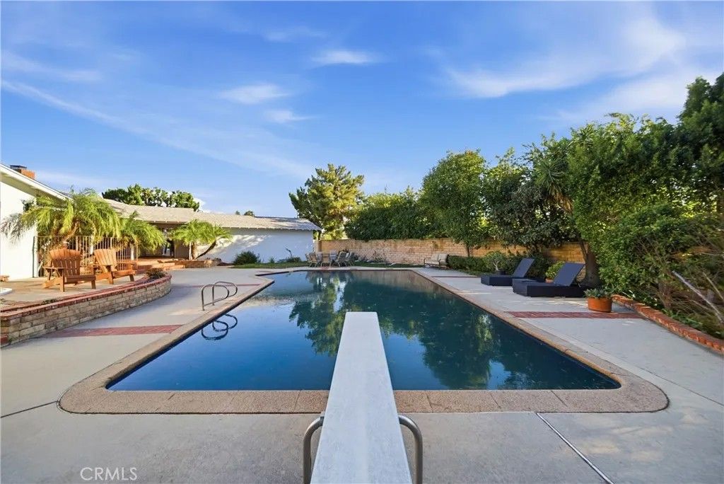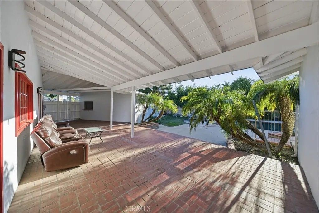 Brand new roof, solar panels in place, ADU potential, and a prime location that continues to be a favorite among Northridge buyers. Sprawling single story living in the desirable Scottish Terrace Estates. Nearly 2,800 square feet, all on one level, with elegant porcelain wood-look tile flooring throughout. Step inside to a wide open floor plan designed for both everyday living and entertaining. The gourmet kitchen is positioned at the front of the home and serves as a true focal point. This chef-inspired kitchen is thoughtfully appointed with a high-end ZLINE appliance package, featuring a stainless steel 7-burner double-oven range with statement hood, ZLINE dishwasher, stainless steel farmhouse sink, trash compactor, pot filler, built-in luxury refrigerator, and wine cooler. White cabinetry is elevated with bold red hardware accents, complemented by quartz countertops and a modern gray-toned tile backsplash. The open concept layout flows seamlessly from the kitchen into the family room, formal living room, and dining area. Designed for an indoor-outdoor lifestyle, sliding doors from the main living spaces open to a private backyard retreat featuring a pool and spa, lush greenery, usable lawn, and a massive covered patio with vaulted ceilings. The home offers four bedrooms and three bathrooms, each finished with elevated, spa-inspired details. The bath is a standout, featuring a massive glass enclosed wet room with a freestanding soaking tub set against a floor to ceiling tile wall. High-end finishes include sleek matte black hardware and LED backlit mirrors over dual vanities. Situated on a corner lot, this true single story ranch offers a wrap-around lawn, wide concrete driveway, and detached two car garage enhancing both privacy and ADU potential. The home also features a convenient indoor laundry room with washer and dryer hookups and a utility sink for added functionality. A rare opportunity offering space, flexibility, and timeless single level living, ready for its next owner.