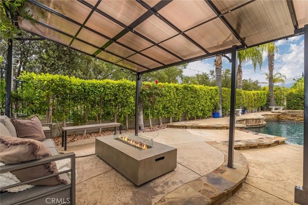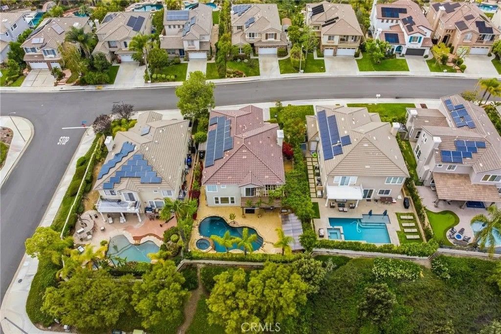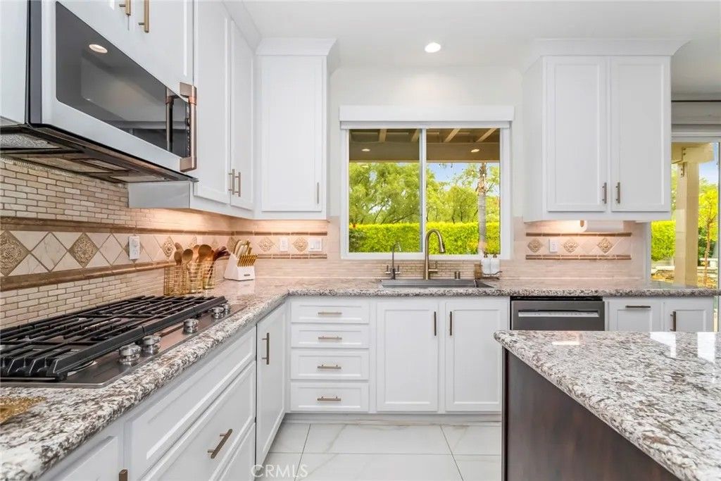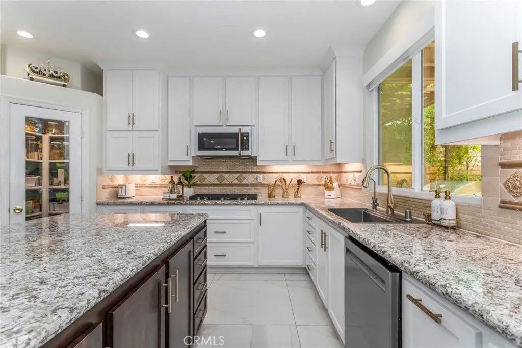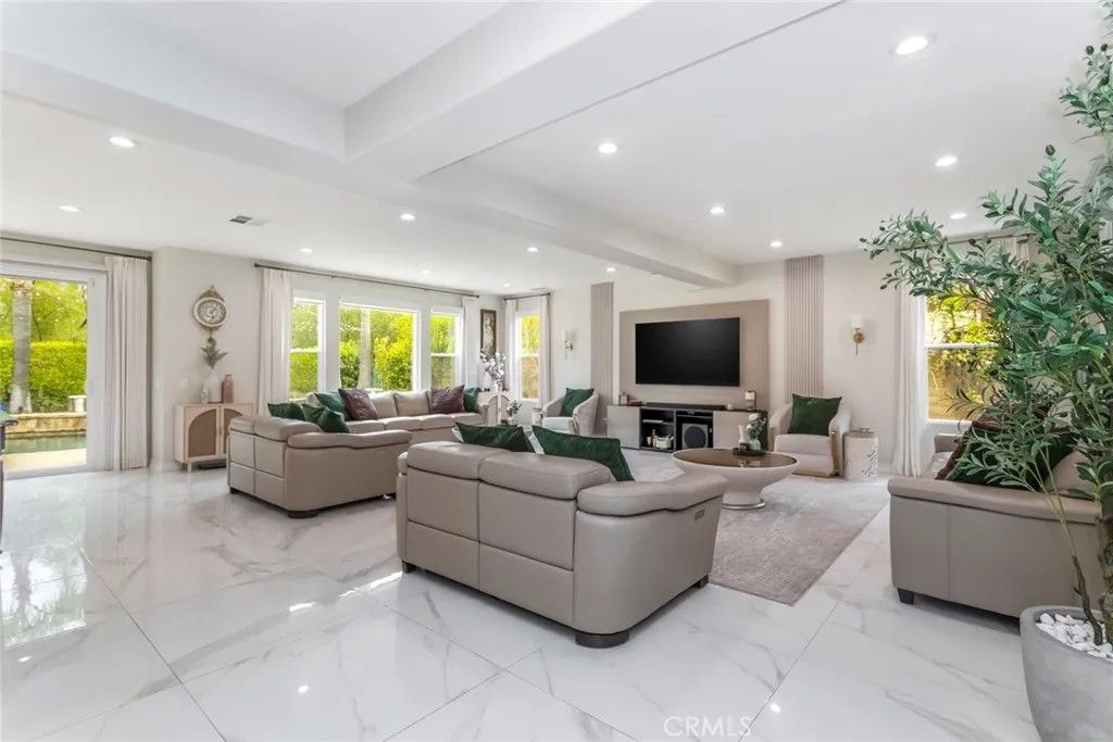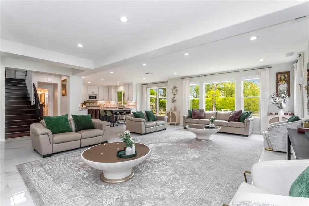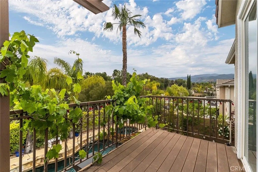 Welcome to this stunning Executive Pool Home, ideally situated at the end of a beautiful cul-de-sac in upper Stevenson Ranch in the highly desired Twilight Vista tract. From the moment you arrive, the home makes a lasting impression with exceptional curb appeal, highlighted by a private courtyard with professional landscaping and tranquil fountains. Through the grand double doors you will find a breathtaking formal entry, where soaring ceilings and a dramatic wrought-iron staircase create a striking focal point. Rich marble-inspired 20 x 20 tile flooring spans the lower level, while the upper level is beautifully finished with warm wood flooring, creating a cohesive blend of elegance and comfort throughout. Spanning nearly 3600 sq ft, the expansive floor plan features 5 bedrooms, 5 baths, a huge great room, formal dining, office nook and upstairs laundry. The expanded great room includes modern wood slat wall detail, ambiance lighting and tons of windows filling the space with natural light. At the center of it all, the newly updated kitchen impresses with an oversized center island, white shaker cabinetry, gorgeous granite counters, walk in pantry, stainless appliances, and modern hardware. The space opens seamlessly to the inviting great room perfect for hosting large gatherings. The main level also features a generously sized bedroom and a private full bath, ideal for guests, multigenerational living, or a home office. Upstairs, the primary suite offers a true retreat, complete with a private balcony capturing sweeping views of Stevenson Ranch and the surrounding mountains. Thoughtfully re-designed with a huge walk in closet with custom built ins and a spa-inspired bath featuring a soaking tub and oversized walk-in shower. The upper level also includes 3 additional well appointed bedrooms, and a versatile flex space ideal for an office. The backyard is designed for both relaxation and entertaining, featuring a newer pool and spa, lush landscaping, and expansive patio spaces perfectly positioned to take in the surrounding views. Additional highlights include plantation shutters, surround sound, enhanced security, solar, Tesla charging station, newer interior and exterior paint, new HVAC systems, tankless water heater, new windows (downstairs) and a 3 car attached garage. Enjoy the benefit of a low HOA, no mello-roos and access to highly acclaimed award winning schools. Close to shopping, restaurants, gorgeous parks and easy access to the 5 freeway.