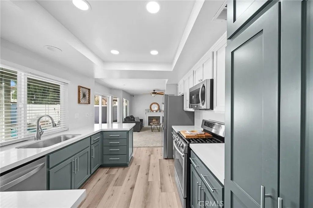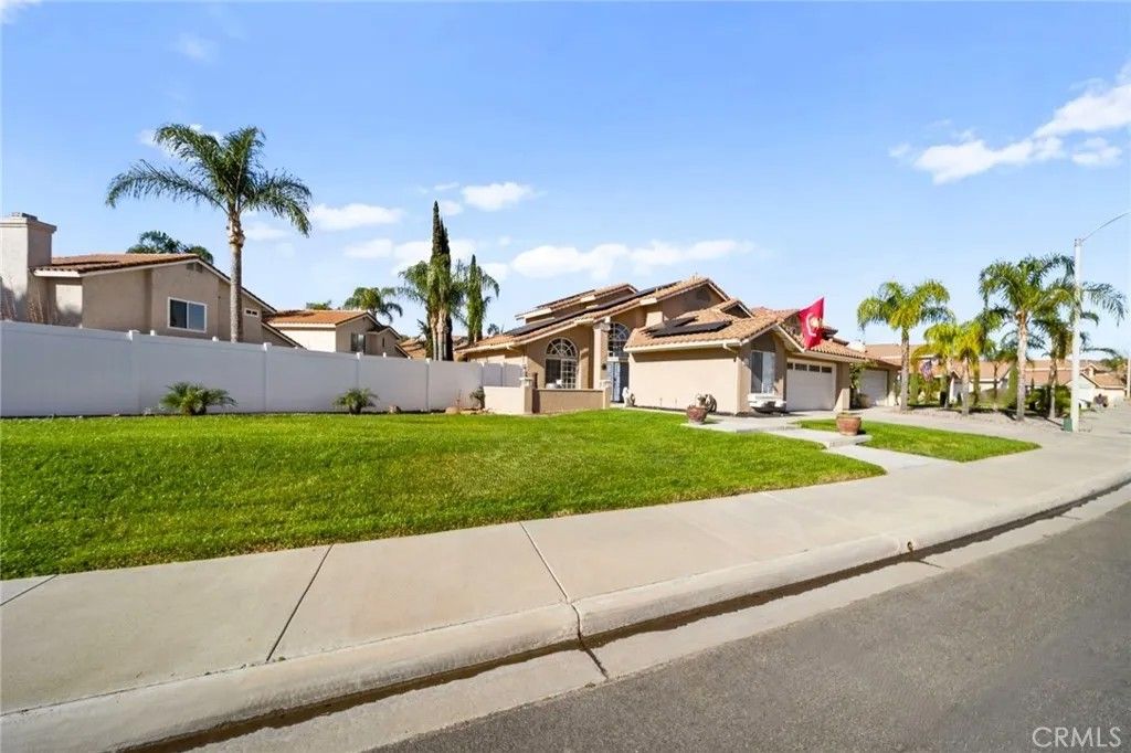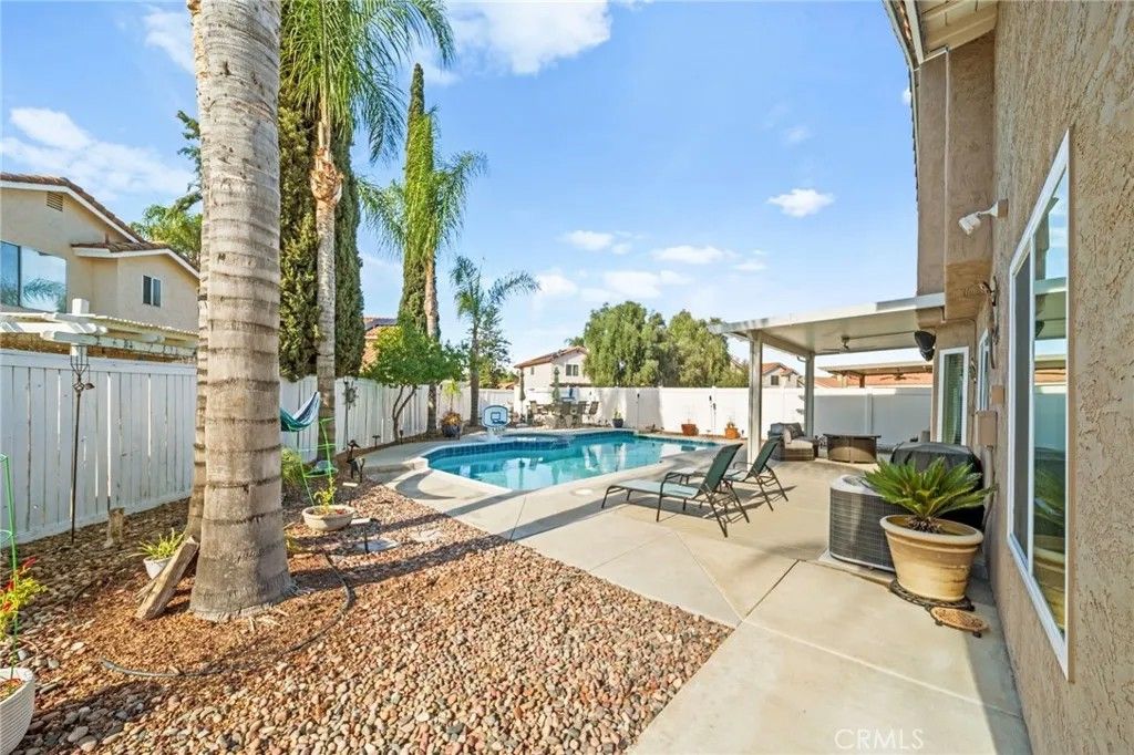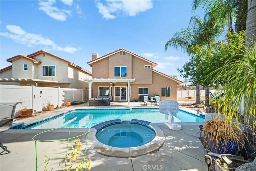 Immaculate and fully loaded 4 + 1 Bedroom 3 bath pool home with a huge yard in Menifee Lakes. This upgraded, turnkey family home is complete with a renovated kitchen with newer appliances and quartz countertops, newer flooring throughout, including a bedroom and adjacent full bathroom on the first floor level. For the large family or remotely employed, downstairs offers an additional bonus room/office/5th bedroom option separate from the other downstairs bedroom. On just shy of a quarter acre, the entertainers dream yard offers a large size pool and spa with newer pool equipment, heater and new pool pump, large patio cover, built-in bbq island with bar seating, in addition to a very spacious rear yard complete with low maintenance DG lined with fruit trees, and a front yard with plush sod, large enough in size to play a game of catch or throw the football. Upstairs holds 3 bedrooms and 2 full bathrooms including the primary suite with large walk-in closet and dual sink vanity. Additional upgrades in this fully loaded home include newer HVAC system, newer hot water heater, upgraded rear windows, three whole house-fans, new ceiling fans in the bedrooms, and SOLAR. Very centrally located near shops and restaurants, enjoy the location of Menifee Lakes and all the amenities it has to offer, all while being in a very LOW tax zone and a LOW HOA of only $100/ mo. Come make your dream home a reality. Cumulative days on market inaccurate, home was only listed active for 1 week in March.