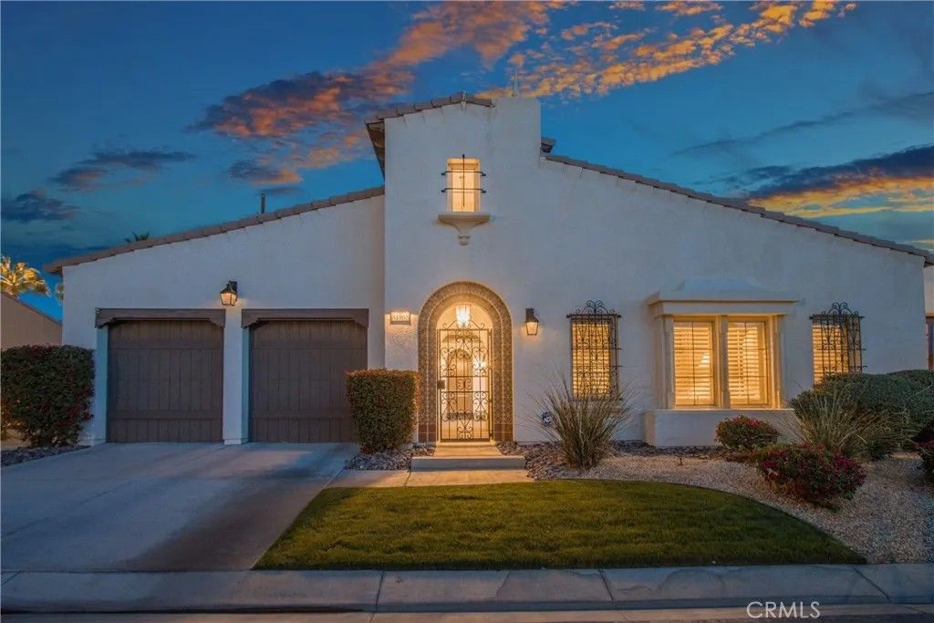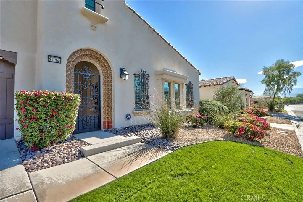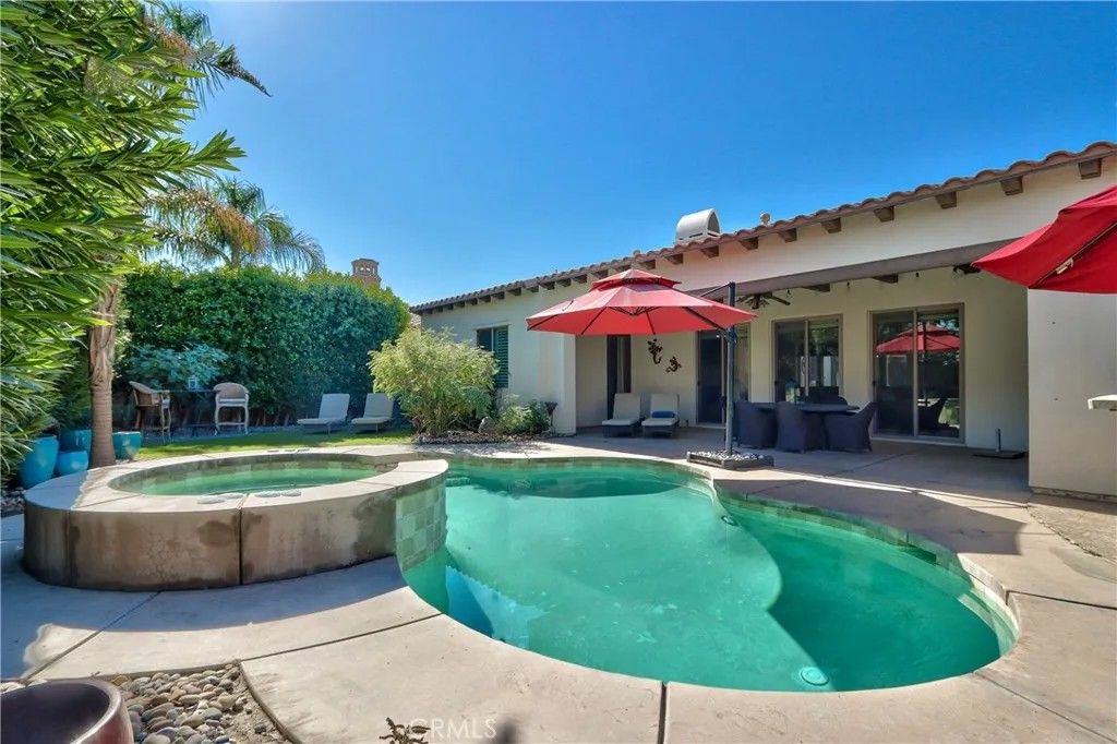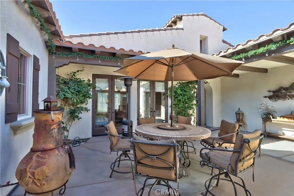 Spanish retreat located in the Estates of Carmela. This home captures the essence of La Quinta resort-style living with its striking Spanish architecture and inviting, open layout. High ceilings and graceful arches add character throughout the interior, enhancing the resort feel. The entry features a large, enclosed courtyard accessed through French doors, promoting wonderful indoor-outdoor flow. The expansive great room connects seamlessly to this courtyard on one side and, on the other, opens via three sliding doors to the spacious, private backyard oasis, complete with a pool and an enclosed California Room. The great room is open to the gourmet kitchen, which features a center island, beautiful designer lighting, a large walk-in pantry, and a butler's pantry/prep area with extensive storage and cabinet space. Designer lighting is a feature throughout the entire home. The large Primary Suite is a true retreat, offering a separate French door entrance to the backyard. The Primary Bathroom includes a spacious walk-in shower, dual sinks, a separate soaking tub, and a large walk-in closet. The two guest bedrooms are generously sized. One features a private outdoor sitting area, and the other is large enough to function as a casita or office and includes French doors opening to the main entry courtyard. The guest bathroom is equipped with dual sinks and a large shower/bath combination. The backyard is spacious and private, providing numerous enclosed areas perfect for relaxing around the pool. It also features a custom BBQ island and a beautiful pergola for additional seating. The property includes a dedicated side area for gardening, complete with lemon and lime trees. The landscaping is drought-tolerant and equipped with sprinkler drip lines to all plants and trees, complemented by beautiful accent lighting. This home is being sold comfortably and tastefully furnished. Located in an elite and lively town, you will enjoy sunshine all year round and never a shortage of activities, including great entertainment, shopping, and dining. The area is also close to PGA Golf, the Indian Wells Tennis Garden, and offers abundant biking and hiking trails.