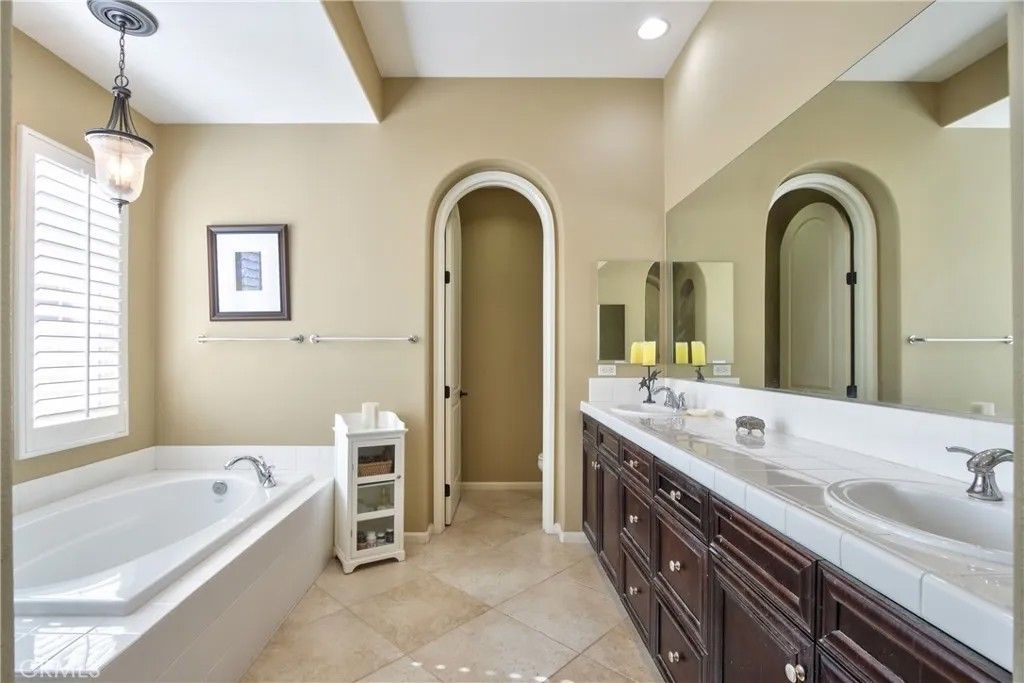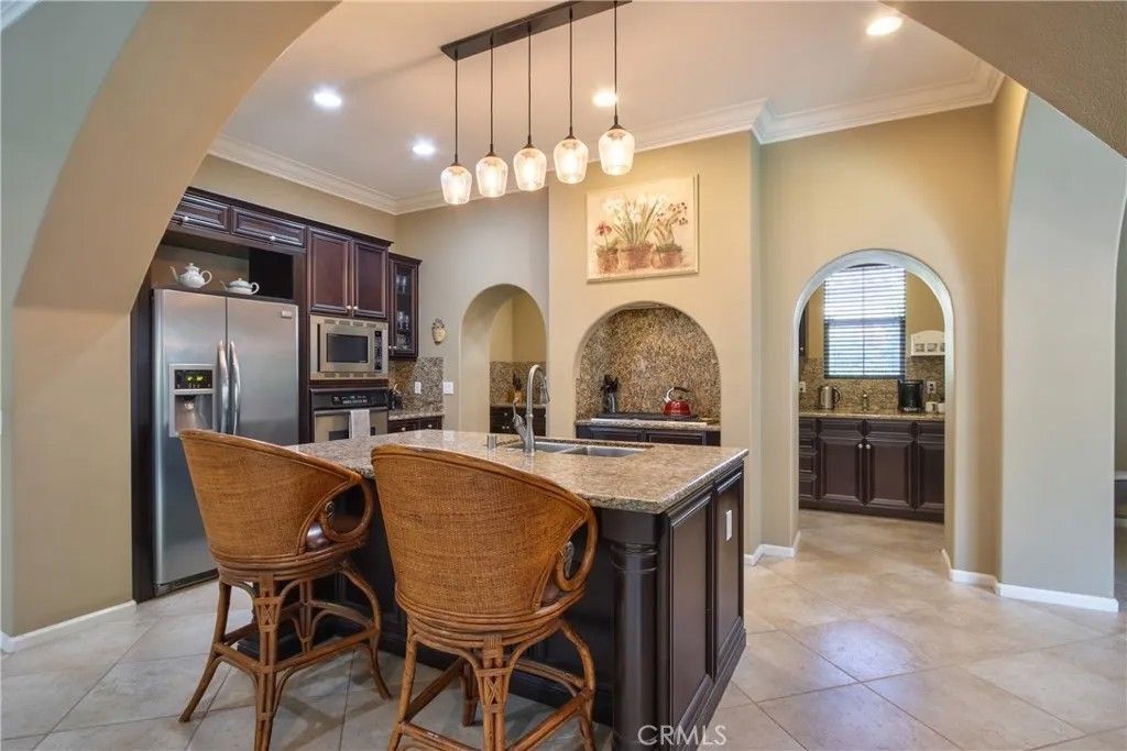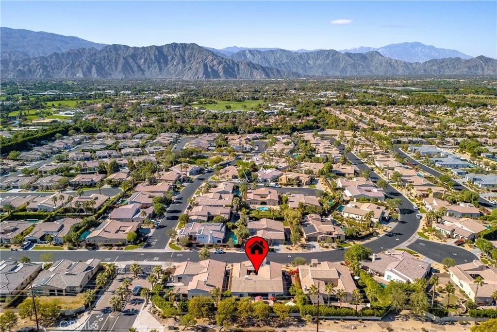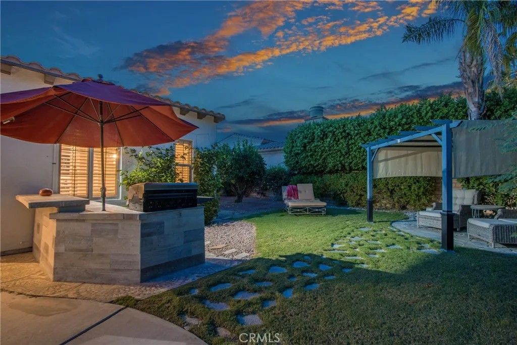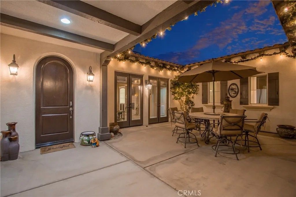 Spanish retreat located in the Estates of Carmela. This home captures the essence of La Quinta resort-style living with its striking Spanish architecture and inviting, open layout. High ceilings and graceful arches add character throughout the interior, enhancing the resort feel. The entry features a large, enclosed courtyard accessed through French doors, promoting wonderful indoor-outdoor flow. The expansive great room connects seamlessly to this courtyard on one side and, on the other, opens via three sliding doors to the spacious, private backyard oasis, complete with a pool and an enclosed California Room. The great room is open to the gourmet kitchen, which features a center island, beautiful designer lighting, a large walk-in pantry, and a butler's pantry/prep area with extensive storage and cabinet space. Designer lighting is a feature throughout the entire home. The large Primary Suite is a true retreat, offering a separate French door entrance to the backyard. The Primary Bathroom includes a spacious walk-in shower, dual sinks, a separate soaking tub, and a large walk-in closet. The two guest bedrooms are generously sized. One features a private outdoor sitting area, and the other is large enough to function as a casita or office and includes French doors opening to the main entry courtyard. The guest bathroom is equipped with dual sinks and a large shower/bath combination. The backyard is spacious and private, providing numerous enclosed areas perfect for relaxing around the pool. It also features a custom BBQ island and a beautiful pergola for additional seating. The property includes a dedicated side area for gardening, complete with lemon and lime trees. The landscaping is drought-tolerant and equipped with sprinkler drip lines to all plants and trees, complemented by beautiful accent lighting. This home is being sold comfortably and tastefully furnished. Located in an elite and lively town, you will enjoy sunshine all year round and never a shortage of activities, including great entertainment, shopping, and dining. The area is also close to PGA Golf, the Indian Wells Tennis Garden, and offers abundant biking and hiking trails.