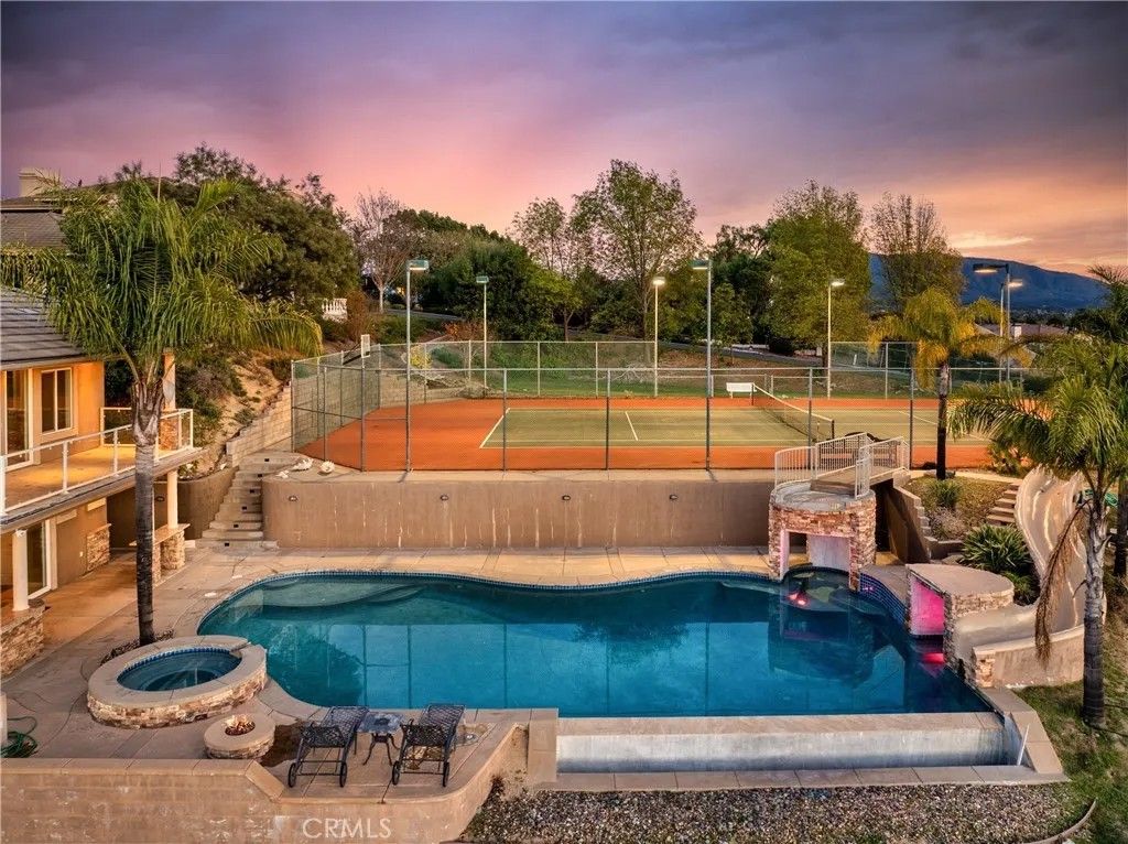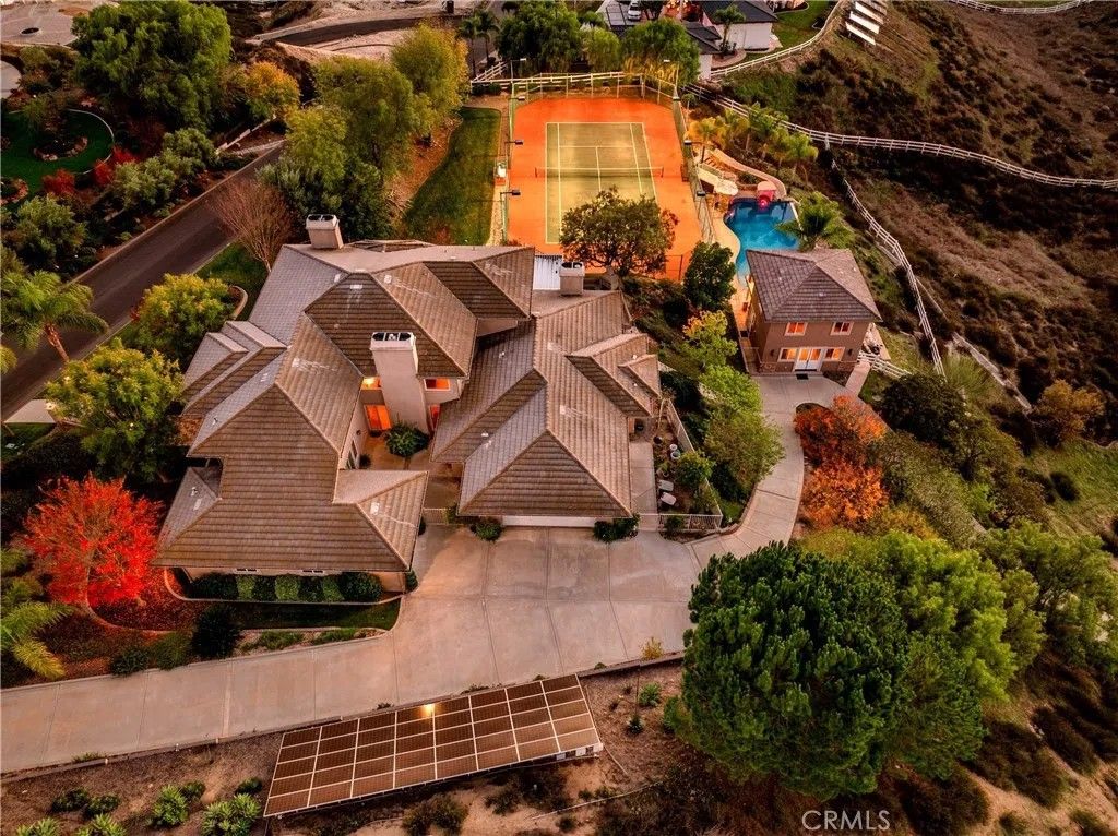 Prestigious Santiago Estates Temeculas premier address. Ideally positioned along Millionaire Row, this refined estate spans nearly 4 private, usable acres, offering serene views, exceptional privacy, and an elegant residence designed for luxury living. The home showcases 5 spacious bedrooms, including a main-floor primary suite, along with a sophisticated formal living room, formal dining room, and a private executive office. Light-filled interiors, high ceilings, and three wood-burning fireplaces create an atmosphere of warmth and timeless style. The gourmet kitchen features granite countertops, double ovens, stainless steel appliances, and an inviting breakfast nook that opens seamlessly to the estates outdoor living spaces. The grounds are nothing short of resort-caliber. Enjoy a lighted tennis court, expansive entertaining patios, and a dramatic infinity-edge pool enhanced by waterfalls, a slide, and a diving platforman entertainers paradise and a true retreat. A beautifully designed guest house provides exceptional versatility with a full kitchen, bathroom, and an upstairs family room with a private balconyideal for extended stays, multi-generational living, or a high-end studio. With abundant additional land for horses, vineyards, orchards, or future enhancements, plus paid-for solar, this estate offers both luxury and long-term value. Perfectly located just minutes to town, shopping, dining, and Temeculas renowned Wine Countrythis is an extraordinary offering in one of the valleys most prestigious and sought-after communities.