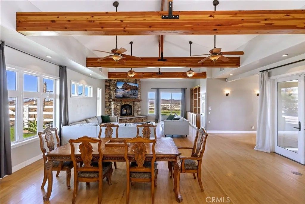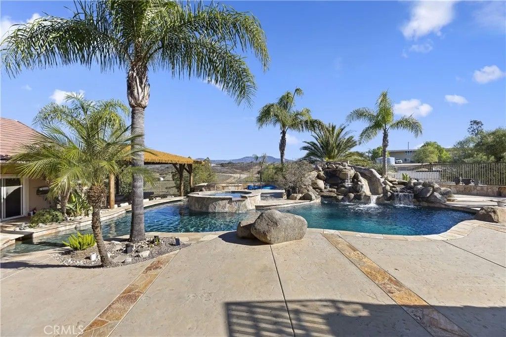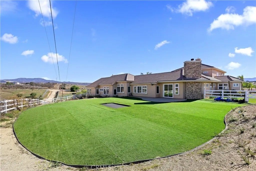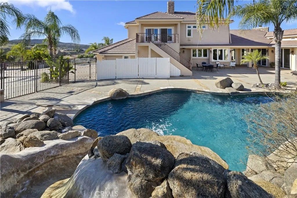 Perfectly situated for relaxed, luxurious Wine Country living, this custom estate includes both a stunning main residence and a spacious 2-bedroom guest house & massive RV garage. Set on nearly 5 acres with sweeping views. The primary home offers over 4,671 sq. ft. with a free-flowing floor plan, spacious bedrooms with vaulted and open-beam ceilings, rich wood flooring, and exceptional stone tile work throughout. The chefs kitchen impresses with stainless steel appliances, granite counters, double ovens, and a large walk-in pantryseamlessly opening to the warm, inviting family room highlighted by a dramatic floor-to-ceiling fireplace. The elegant primary suite is a retreat of its own, featuring a fireplace, wood-beamed ceilings, an expansive layout, and two private balconies overlooking Temecula Wine Country. The luxurious primary bath is beautifully appointed with dual sinks, a spa tub, walk-in closet, and refined finishes. An office with built-ins provides the perfect space to work from home. Step outside to your own private resort: a custom saltwater pool and spa with waterfall, slide, and diving board, plus an impressive outdoor kitchen complete with stainless steel appliances, refrigerator, granite counters, plasma TV, swim-up bar, fire pit, and custom tiki cover. The grounds are tastefully landscaped with extensive decking ideal for entertaining. A true equestrian estate, the property offers paddocks, covered turnouts, and a riding arena. The impressive workshop is paired with a HUGE RV garage, providing exceptional space for large coaches, car collections, or contractor equipment. Above the RV garage sits the full 2-bedroom, 1-bath guest house with kitchen and living roomideal for extended family, visitors, or income potential. An additional studio with its own bathroom offers space for a gym, office, or creative retreat. With paid solar and well water, this estate is both efficient and cost-effective, perfect for equestrians, contractors, car collectors, or anyone seeking the ultimate Temecula Wine Country lifestyle.