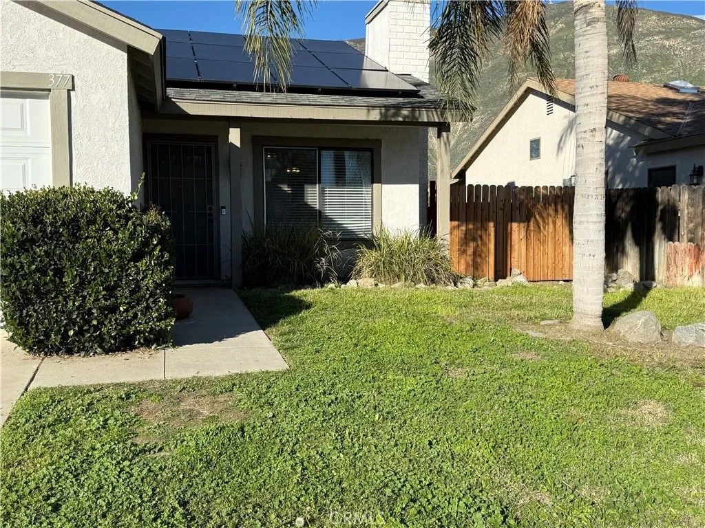 Beautifully Updated Single-Story Home with Modern Upgrades & Landscaped Backyard & SOLAR perfect for a first-time homebuyer ~ this lovely home located at 377 Quandt Ranch Rd, San Jacinto featuring 2 bedrooms, 2 bathrooms, and 890 sq ft of thoughtfully updated living space on a spacious 6,098 sq ft lot with an attached two-car garage ~ RV/boat parking *potential* ~ with large side yard. Located in the desirable San Jacinto community, this home offers scenic neighborhood views of the San Jacinto mountains and is just minutes from Soboba Casino and the Soboba Springs Golf Course. Enjoy convenient access to schools, parks, shopping, dining, and major highways. Step inside to discover new flooring and baseboards, fresh interior paint, and new light fixtures that brighten every room. The open living room welcomes you with high ceilings, a gas-starter fireplace, and large windows that fill the space with natural light. Bedrooms offer vaulted ceilings and ample closet space. The primary suite includes a walk-in closet, sliding door to the backyard, and an ensuite bathroom with dual sinks and a shower/tub combo. The upgraded kitchen features granite countertops, custom backsplash, stainless steel appliances ~ NEW DISHWASHER ~ and a breakfast bar with seating for three ... perfect for casual dining. Direct access to the backyard makes indoor/outdoor living effortless. Outside, the beautifully landscaped backyard sets this home apartoffering lush greenery, a concrete covered patio, and full fencing, creating a peaceful and private outdoor retreat. Additional upgrades include a new HVAC system, leased solar system, and updated interior finishes throughout, providing comfort, efficiency, and long-term savings. This property has NO HOA and offers LOW PROPERTY TAXES! This move-in-ready home blends modern upgrades with a fantastic locationan ideal opportunity in San Jacinto.