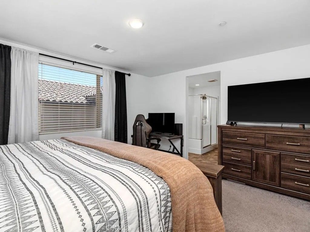 Welcome to Copper Sky, one of Winchesters most desirable communities by Tri Pointe Homes. This better-than-new, beautifully maintained Plan 4 model offers one of the largest layouts in the development, featuring an open-concept design with luxury vinyl plank flooring, a light-filled great room, and a spacious kitchen complete with a generous island, stainless steel appliances, quartz countertops, and a walk-in pantry. Upstairs, youll find a versatile loft, perfect for a home office, playroom, or second living area, alongside all three bedrooms and a conveniently located large laundry room. The primary suite boasts a sizable walk-in closet and an ensuite bath with a walk-in shower and dual vanities. Additional highlights include recessed lighting throughout, new window blinds, eight solar panels for energy efficiency, and brand-new turf in the backyard for low-maintenance living. The home is just steps from the resort-style community pool, spa, BBQ area, and nearby parks. Located minutes from shopping, dining, and entertainment, with easy access to both Menifee and Temecula, this home combines style, space, and an unbeatable location.