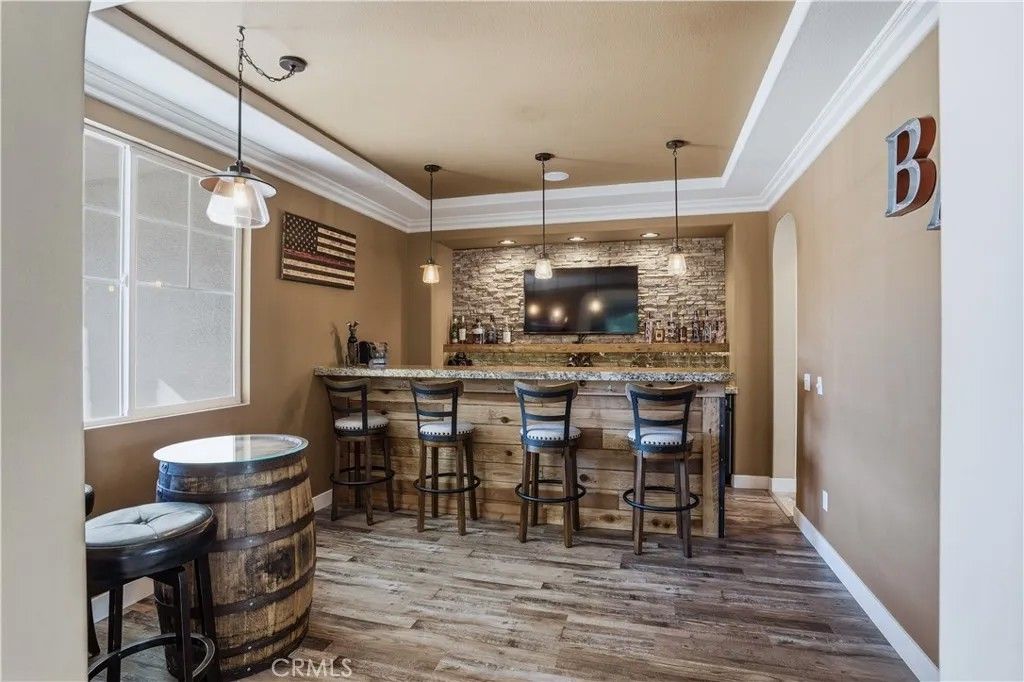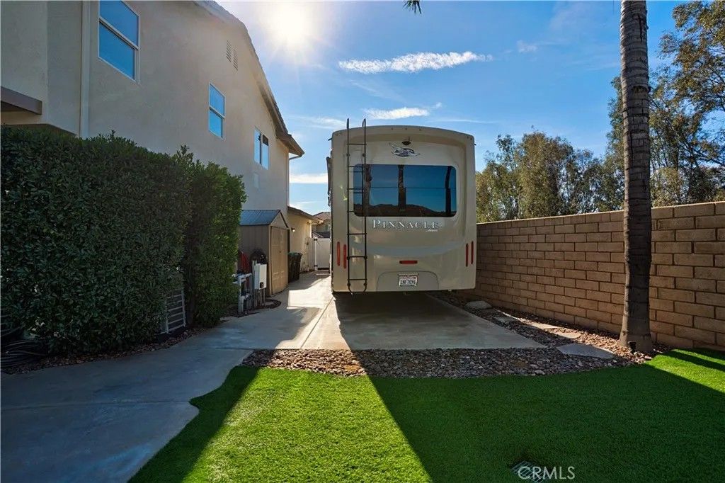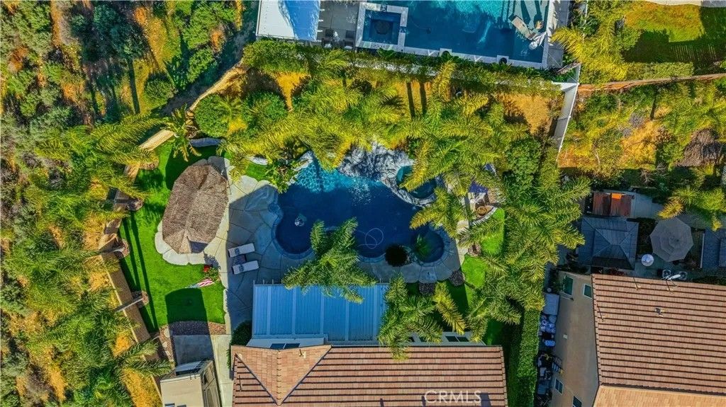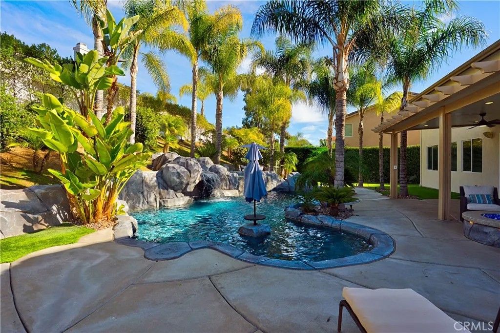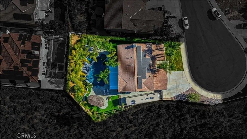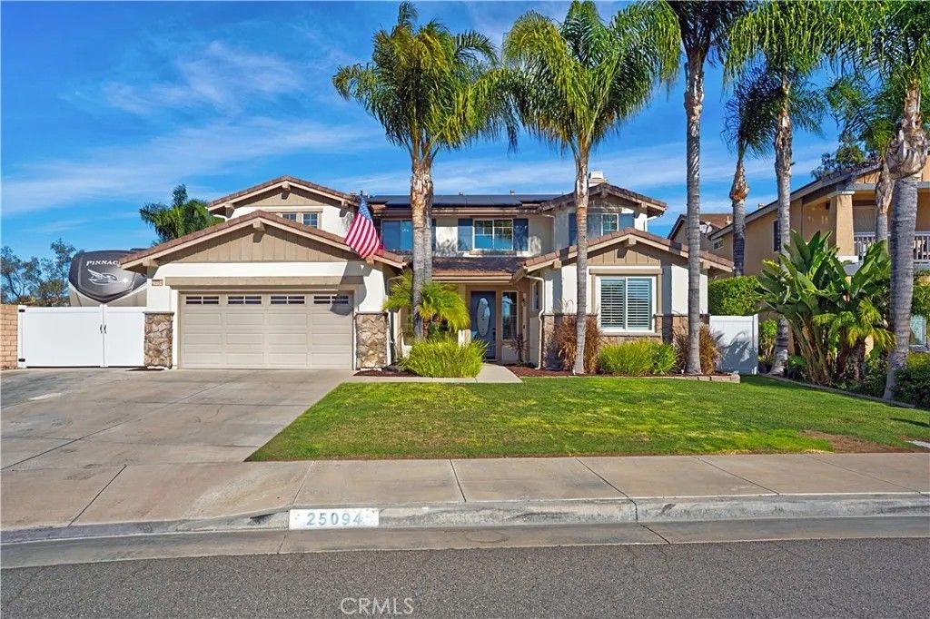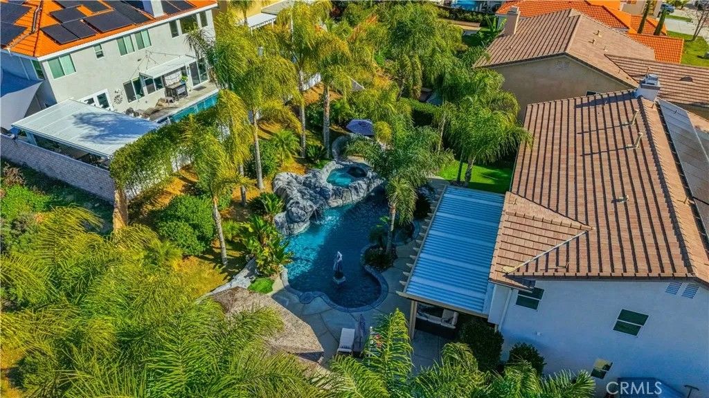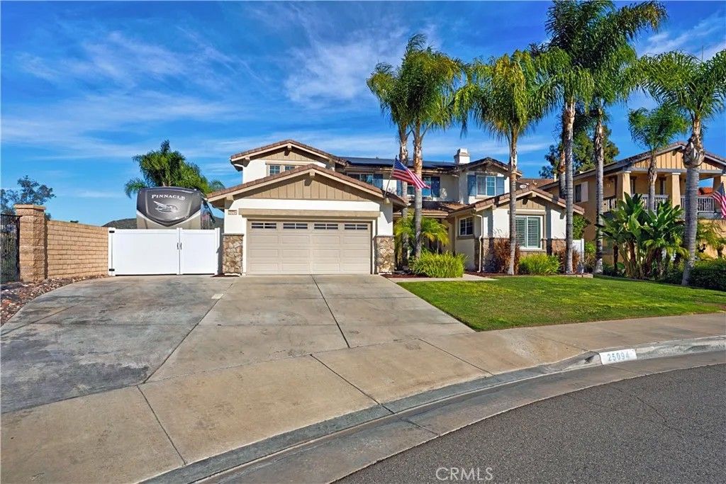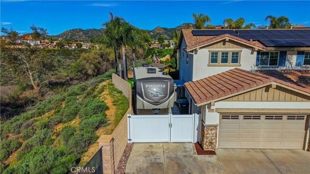 Welcome to 25094 Meridian Ct, Wildomar where everyday living feels like a staycation and entertaining comes naturally. Tucked at the end of a quiet cul-de-sac with no neighbors on one side, this home delivers the privacy you crave and the space to truly enjoy it. Step into a true entertainers paradise, starting with the backyard: a stunning in-ground rockscape pool and spa paired with a large palapa-style bar featuring tons of seating, a keg, BBQ, mini fridge, and dedicated grilling areathe ultimate setup for hosting unforgettable pool parties, game days, and weekend gatherings. Inside, the fun continues with a thoughtfully designed 5-bedroom, 3-bath layout. A bedroom and full bathroom downstairs make hosting guests or multi-generational living easy. The open-concept kitchen keeps everyone connected, while the den converted into a full bar adds a bold, one-of-a-kind touch. Upstairs, the living room has been transformed into a home theater, turning movie nights into a true experience. The primary suite feels like a retreat of its own, complete with a jetted soaking tub and large walk-in closet. Add in a 3-car garage, gated RV parking, and an owned solar system, and you have a home thats as smart as it is fun. Located close to shopping, schools, and hospitals, this home truly checks all the boxesprivacy, personality, and an unbeatable entertaining vibe. If youre looking for a place that was made for making memories, this is the one.