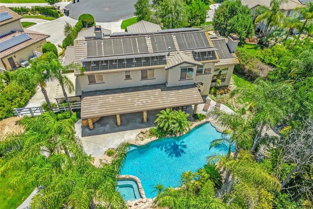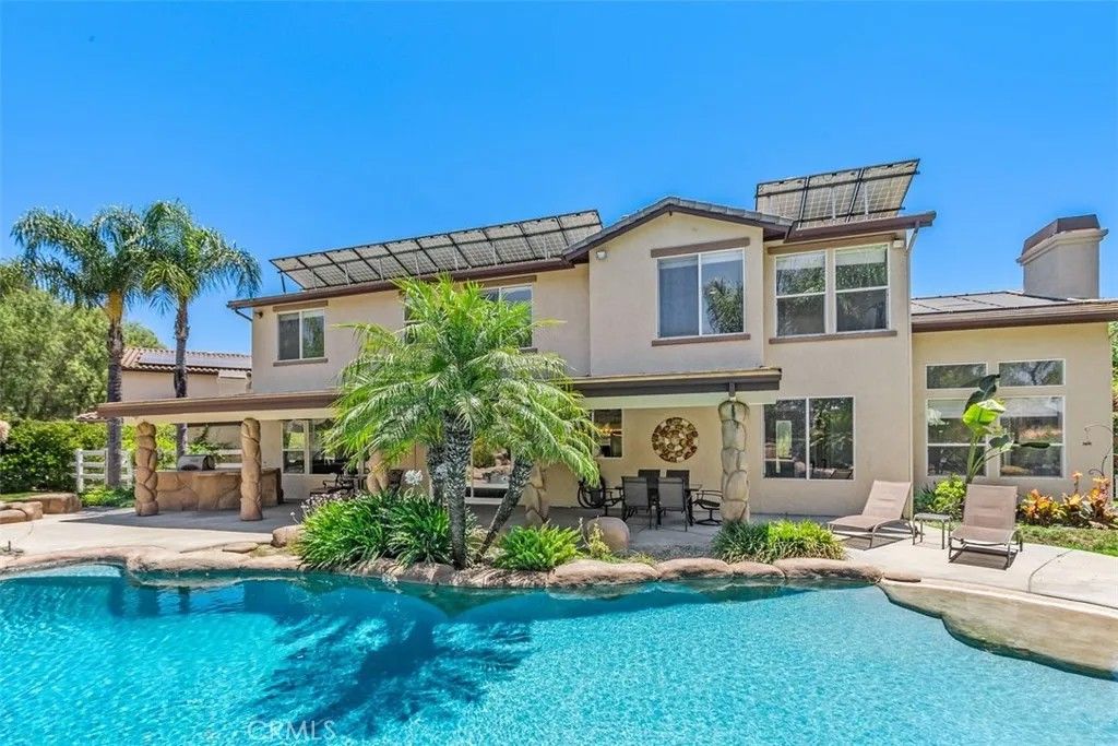 Welcome to Paradise! This incredible Meadowview POOL/SPA/SOLAR home features 5-bedrooms, 5 bathrooms, plus office, plus loft, plus pool house with 1 bathroom, plus pool/spa, plus BBQ, plus firepit, plus sport court. Step inside to a formal entryway, tall ceilings, crown molding, and natural lighting throughout. Downstairs includes an ensuite bedroom w/bathroom, office, formal dining room, formal living room, family room, Kitchen, & laundry room, and a secondary bathroom. Upstairs is huge master suite, dual sinks, vanity, his & her closets. Three other bedrooms, plus spacious loft. Features and upgrades include: Paid, adequately sized solar panels for electricity and pool. Enjoy more conveniences with a Whole house soft water system, circulating heat pump, whole house fan, and dual air conditioners. The outdoor living space includes a beach entry pool, spa, water fountains, along with a pool house with shower & bathroom, Built in BBQ, fire pit, and sport court. Low Taxes & Low HOA. Community amenities include Equestrian Center, two pools, spa, tennis courts, pickleball courts, basketball courts, parks, event/recreation room, open space to ride horses, bikes, hiking trails and lovely mature trees. Centrally located to everything, from the Prominade Mall, to Old Town Temecula, to Wine Country, whilst still being tucked away and secluded from any hustle and bustle.