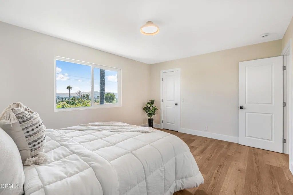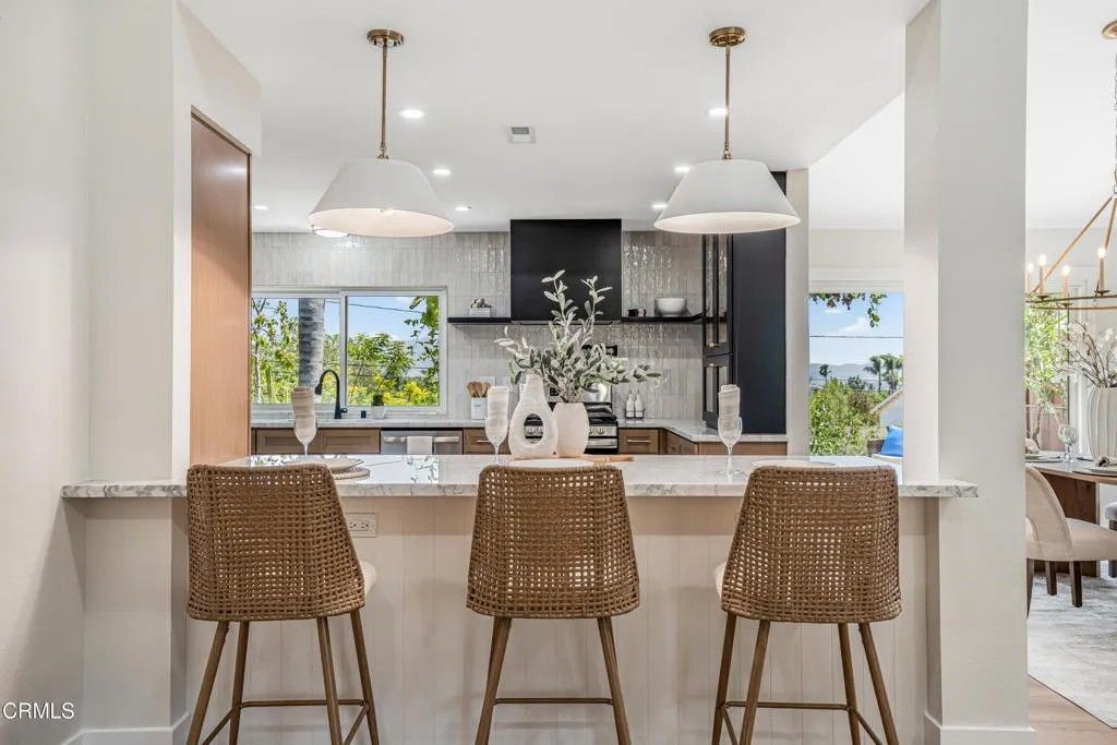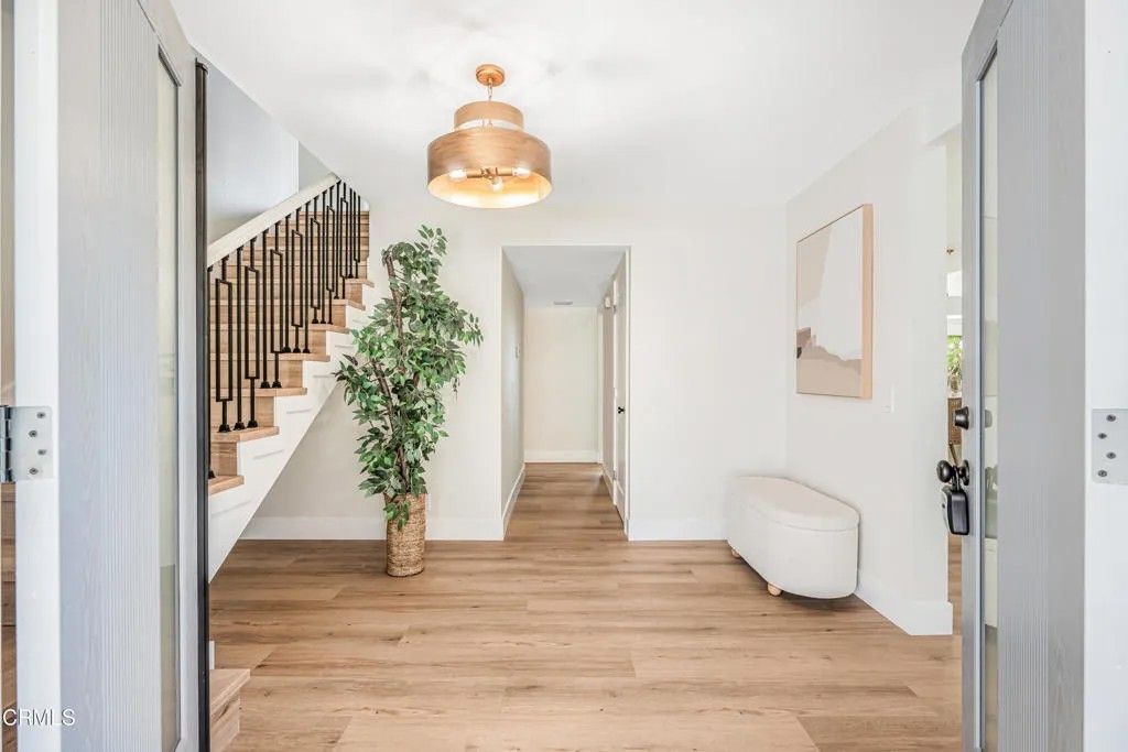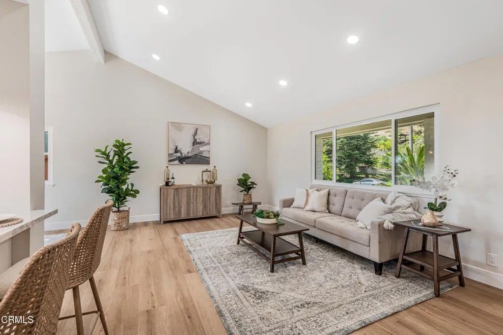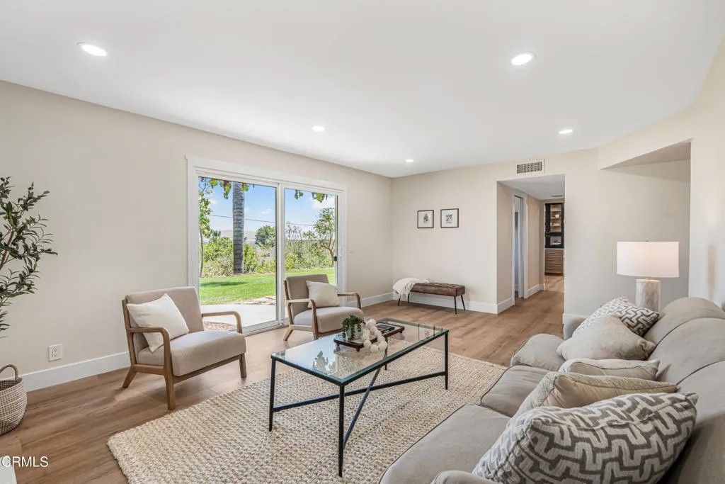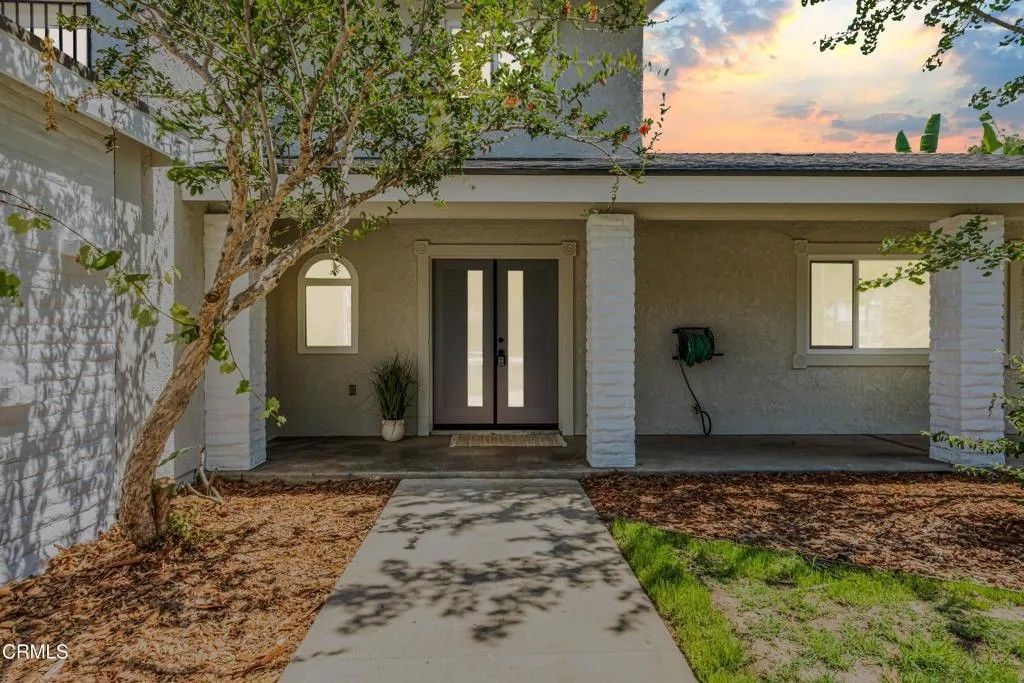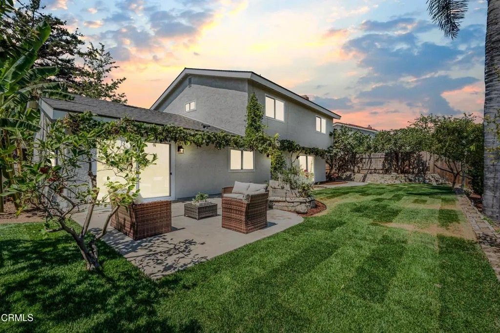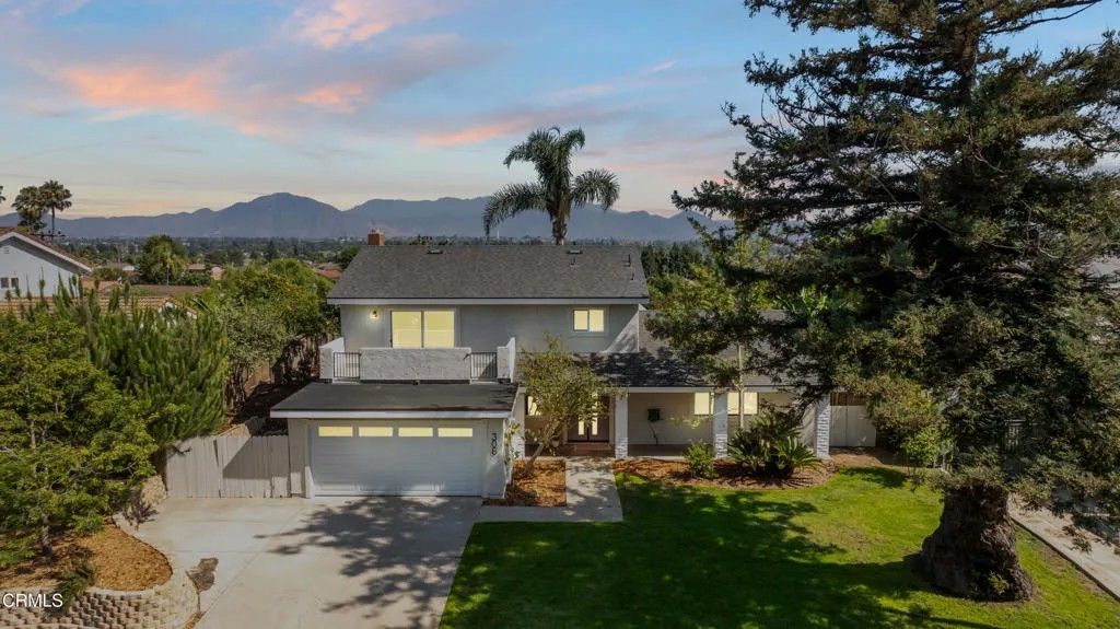 Nestled in the desirable city of Camarillo, this stunning two-story single-family residence offers 4 bedrooms, 3 bathrooms, and over a million reasons to call it home. From the moment you arrive, the double-door entry and soaring ceilings set the tone for an elegant and airy interior, enhanced by recessed lighting throughout. The formal dining area is a showpiece, featuring a centered, eye-catching chandelier and sliding glass doors that frame views of the spacious backyard. The updated kitchen is a chef's dream, showcasing marble countertops, modern cabinetry, a stylish backsplash, and a breakfast bar adorned with sleek pendant lights overlooking the inviting living room. A cozy family room with a warm fireplace and another set of sliding doors fills the space with natural light. The first floor also offers a well-appointed guest bathroom with a custom-tiled walk-in shower, a dedicated laundry room, and a generously sized bedroom perfect for guests or a home office. Upstairs, two additional bedrooms share a modern bathroom with a glass-enclosed walk-in shower. The expansive primary suite is a private sanctuary, complete with sliding doors leading to a serene balcony where you can savor your morning coffee while soaking in breathtaking mountain views. The suite also features a spacious walk-in closet and a luxurious en-suite bathroom with dual sinks and a beautifully tiled walk-in shower. This home has been thoughtfully upgraded with dual-pane windows and a new roof, offering both comfort and efficiency. The backyard is a true highlight, offering ample space for entertaining, mature fruit trees including coffee and banana, and unparalleled panoramic vistas that will make you fall in love with this property all over again. With a 2-car garage, refined finishes, and a location that balances tranquility with convenience, this Camarillo gem is ready to welcome its next chapter.