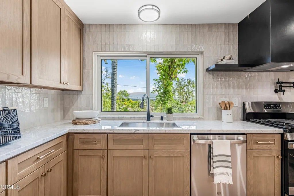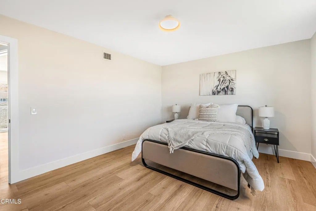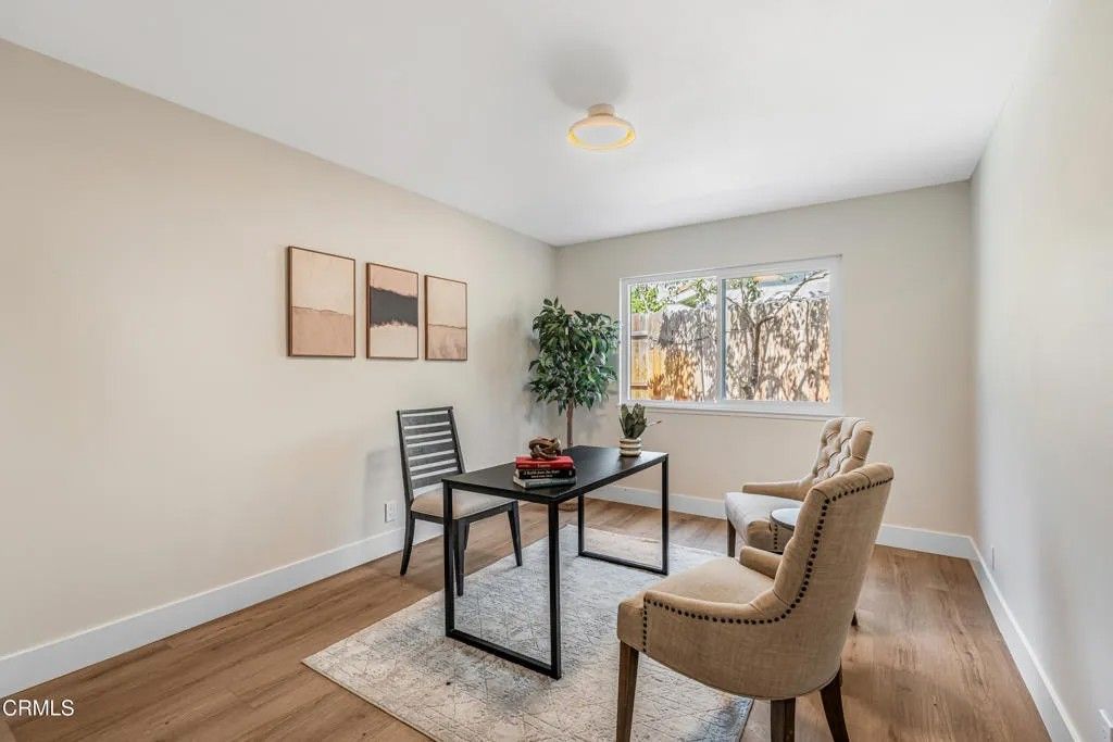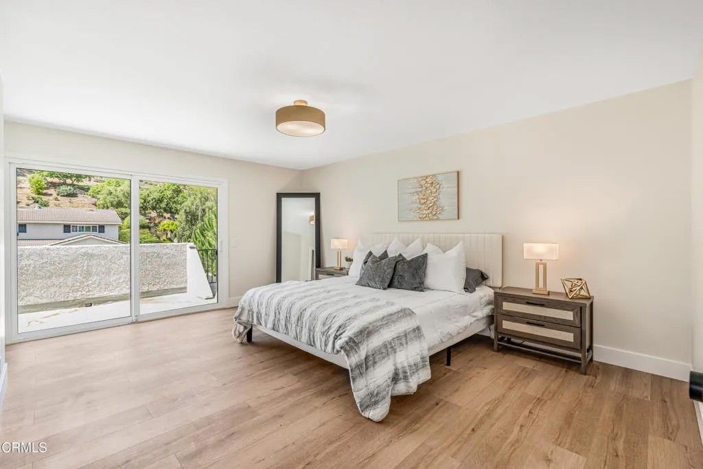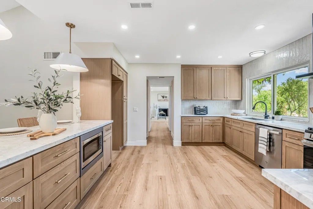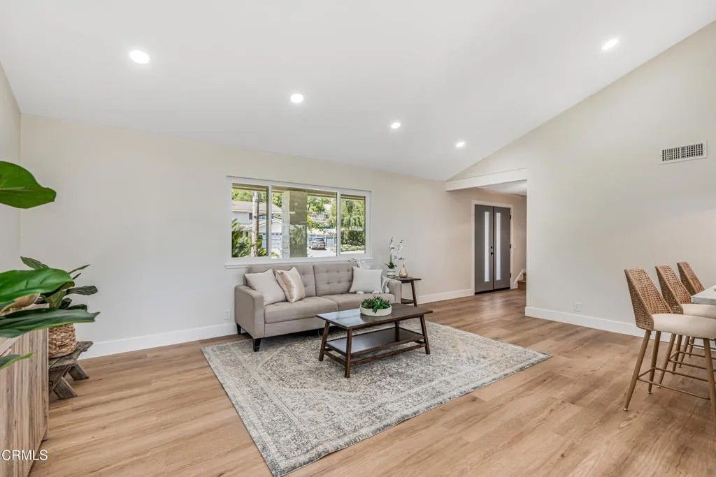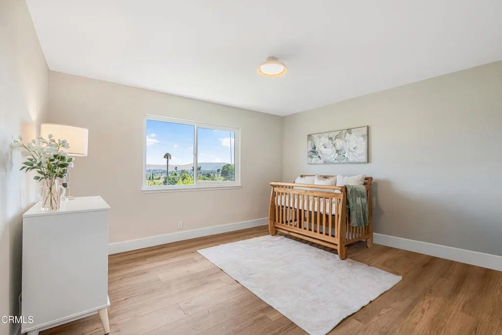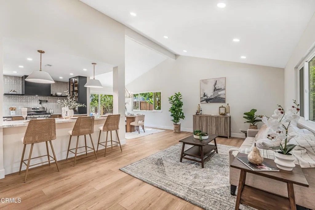 Nestled in the desirable city of Camarillo, this stunning two-story single-family residence offers 4 bedrooms, 3 bathrooms, and over a million reasons to call it home. From the moment you arrive, the double-door entry and soaring ceilings set the tone for an elegant and airy interior, enhanced by recessed lighting throughout. The formal dining area is a showpiece, featuring a centered, eye-catching chandelier and sliding glass doors that frame views of the spacious backyard. The updated kitchen is a chef's dream, showcasing marble countertops, modern cabinetry, a stylish backsplash, and a breakfast bar adorned with sleek pendant lights overlooking the inviting living room. A cozy family room with a warm fireplace and another set of sliding doors fills the space with natural light. The first floor also offers a well-appointed guest bathroom with a custom-tiled walk-in shower, a dedicated laundry room, and a generously sized bedroom perfect for guests or a home office. Upstairs, two additional bedrooms share a modern bathroom with a glass-enclosed walk-in shower. The expansive primary suite is a private sanctuary, complete with sliding doors leading to a serene balcony where you can savor your morning coffee while soaking in breathtaking mountain views. The suite also features a spacious walk-in closet and a luxurious en-suite bathroom with dual sinks and a beautifully tiled walk-in shower. This home has been thoughtfully upgraded with dual-pane windows and a new roof, offering both comfort and efficiency. The backyard is a true highlight, offering ample space for entertaining, mature fruit trees including coffee and banana, and unparalleled panoramic vistas that will make you fall in love with this property all over again. With a 2-car garage, refined finishes, and a location that balances tranquility with convenience, this Camarillo gem is ready to welcome its next chapter.