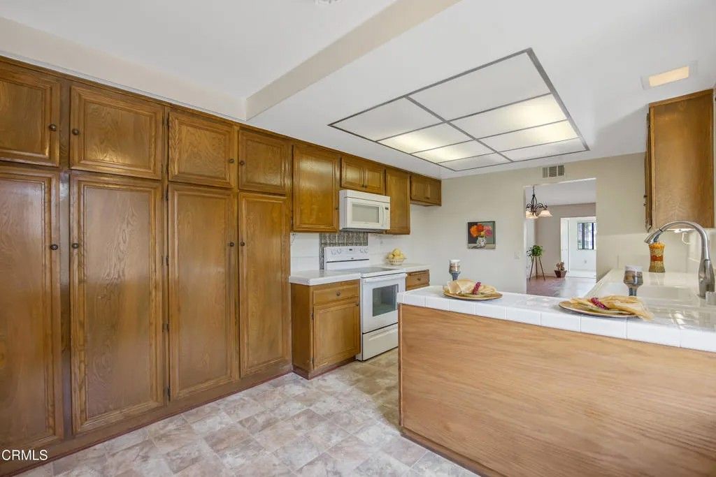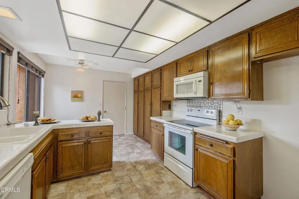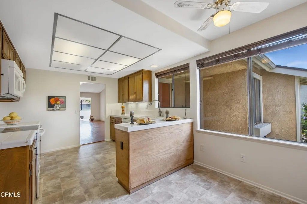 Set in one of Camarillo's most sought-after 55+ communities, this charming Capri model offers the perfect blend of comfort, convenience, and active living in Leisure Village. Perfectly situated on a lush greenbelt with no one behind you, this desirable end-unit offers exceptional privacy, wonderful natural light, and peaceful surroundings. The spacious floor plan features approximately 1,253 square feet of comfortable living space. The living area is enhanced with vaulted, smooth ceilings, sky lights and beautiful wood flooring. It opens to a light filled, enclosed patio room with closet, providing additional flexible space perfect for relaxing, crafting, or entertaining. The kitchen offers a charming breakfast nook to enjoy your morning coffee, with a window looking out to the greenbelt, an abundance of cabinets for storage and tile counters. The primary bedroom includes a generous closet and en-suite bathroom while the secondary bedroom, with plantation shutters, provides flexibility for guests or a home office. Enjoy the upgraded walk-in shower accented with stylish fixtures. Step outside to enjoy your own patio and soak up the California sun surrounded by mature trees and greenery. On those rare warm days, retreat inside and enjoy the comfort of air conditioning. Whether you're spending time in your enclosed patio room, chatting with neighbors on morning walks, or simply taking in the peaceful atmosphere, this home offers the perfect balance of comfort and connection. Residents of Leisure Village enjoy a beautifully maintained community with gated security, lush landscaping and an exceptional array of amenities including a 3-par golf course, heated pool and spa, fitness center, tennis and pickleball courts, library, multiple hobby rooms, countless clubs, classes, and social events--all just minutes from Camarillo's shops, dining, and freeway access. It is truly special place to live. This well-kept home has is also available to lease.