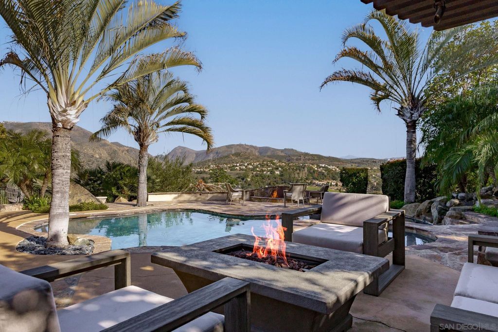 Welcome to your family's Dream Home in exclusive guard-gated Cielo of Rancho Santa Fe. Just completely remodeled - new kitchen and all new bathrooms within last 6 months. Owned SOLAR added for home & pool plus battery back up! Located in the acclaimed Roger Rowe School District. Situated on a peaceful cul-de-sac, this home offers breathtaking Panoramic VIEWS that will inspire awe. With a convenient downstairs primary suite & Brand-NEW SPA bath, this residence delivers elegance and sophistication at every turn. The heart of the home is the gourmet kitchen equipped with top-of-the-line appliances, complemented by a 750-bottle temperature-controlled wine room, perfect for family gatherings and celebrations. Hardwood floors add warmth and charm throughout the thoughtfully designed floor plan. Impeccably curated, Full Home Water Filtration system provides peace of mind for your family's health and well-being. Step outdoors to discover an entertainer's oasis; spacious backyard featuring an outdoor kitchen, great for enjoying meals alfresco or hosting soirees under the starlit sky. Dedicated home office is a quiet sanctuary for productivity. Elevating lifestyle to new heights, residents are invited to enjoy the exclusive amenities of Cielo, including an Olympic pool, fitness and conference centers, and multiple tennis courts. Experience the life of luxury in this enchanting home, where every moment is cherished, and memories are made for generations to come.