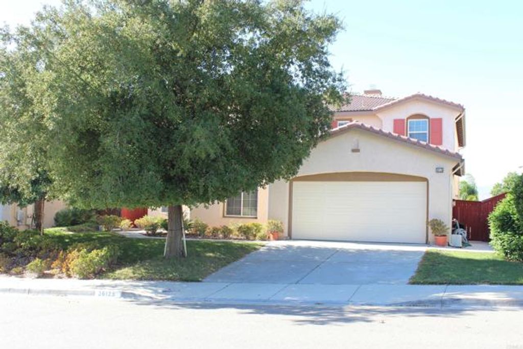 Move-in ready home in Clayton Ranch! Home features 5 bedrooms, 3 bathrooms; one bedroom on the main floor. Walk into an open floor plan, spacious living room and dining room displaying ample natural light. Generous family room with a fireplace conveniently connects to breakfast counter bar area, kitchen, office nook, and additional dining. Kitchen features granite throughout, central dishwashing zone, stainless steel appliances and plenty of storage in walk in pantry. Second floor offers balcony, luxurious loft space, additional office space, impressive primary bedroom with western mountain views, ensuite bathroom with dual sinks, separate soaking tub and shower, a spacious his and hers walk-in closet. Three additional bedrooms upstairs and full bathroom. Low maintenance backyard, 4 car tandem garage, newer AC and heating units are positive features. Minutes away from Inland Valley Hospital, 15 freeway, shops, and restaurants!