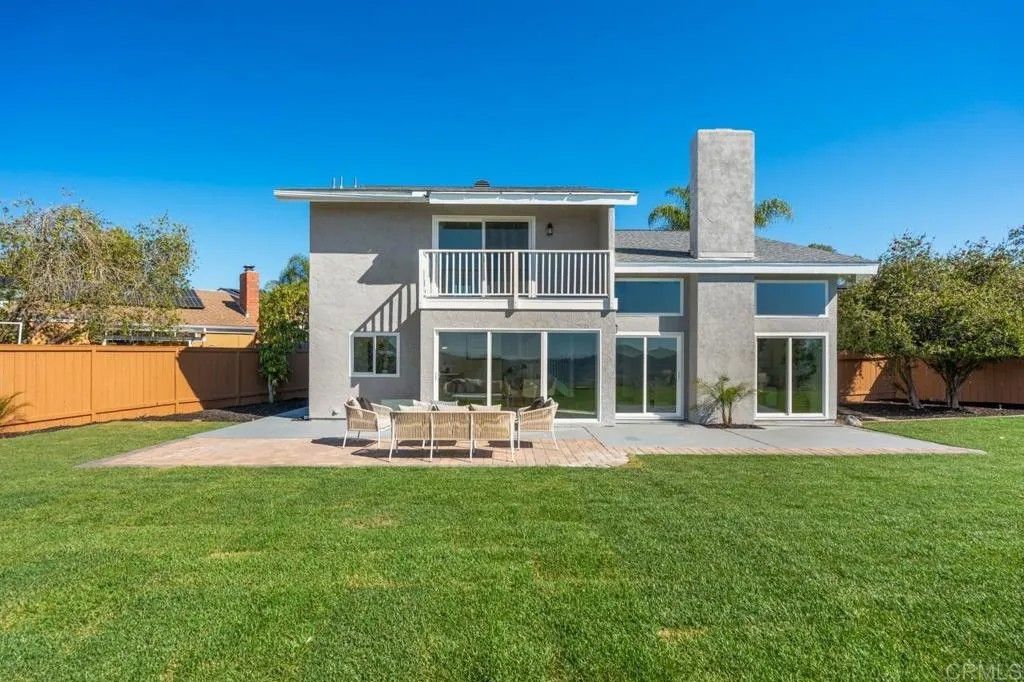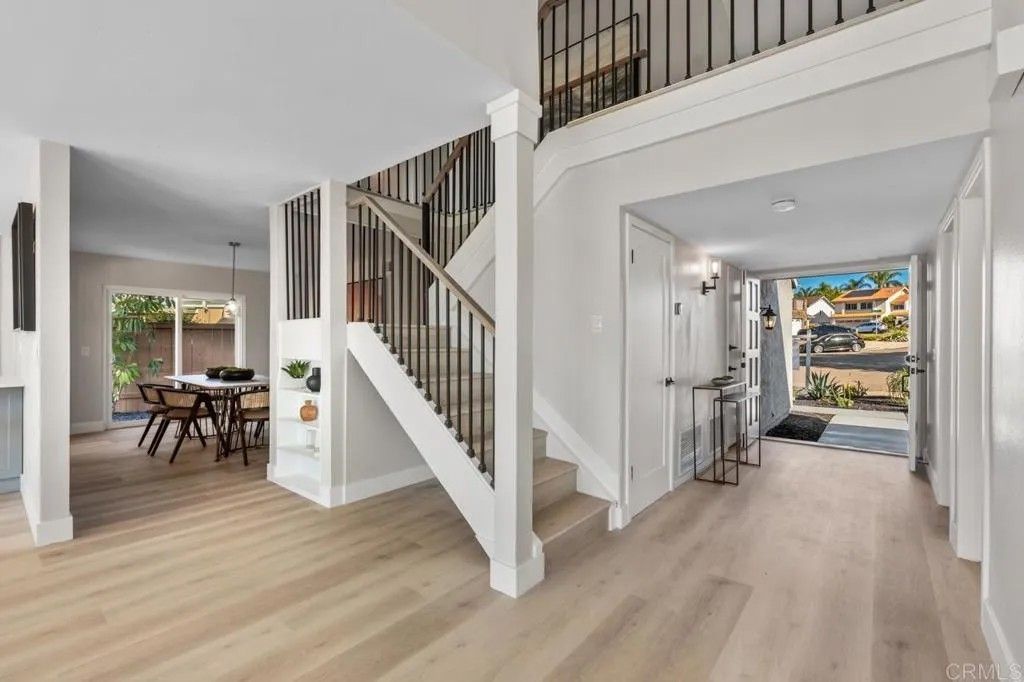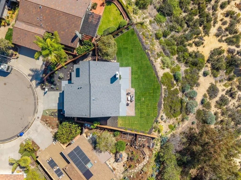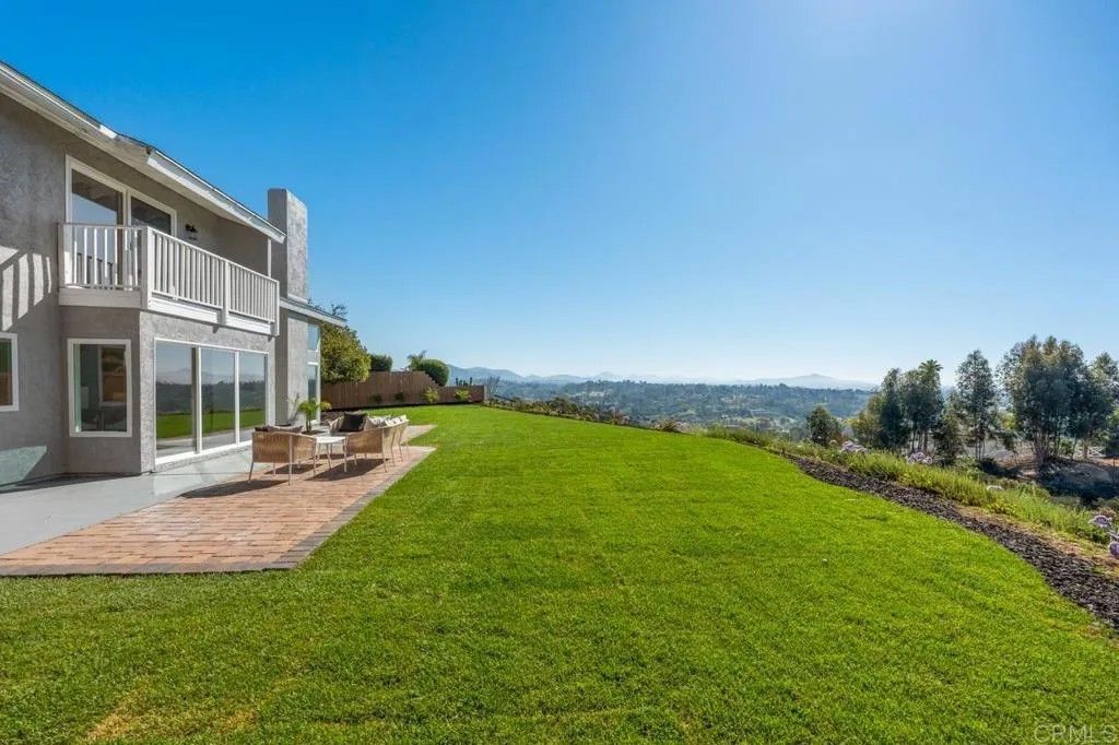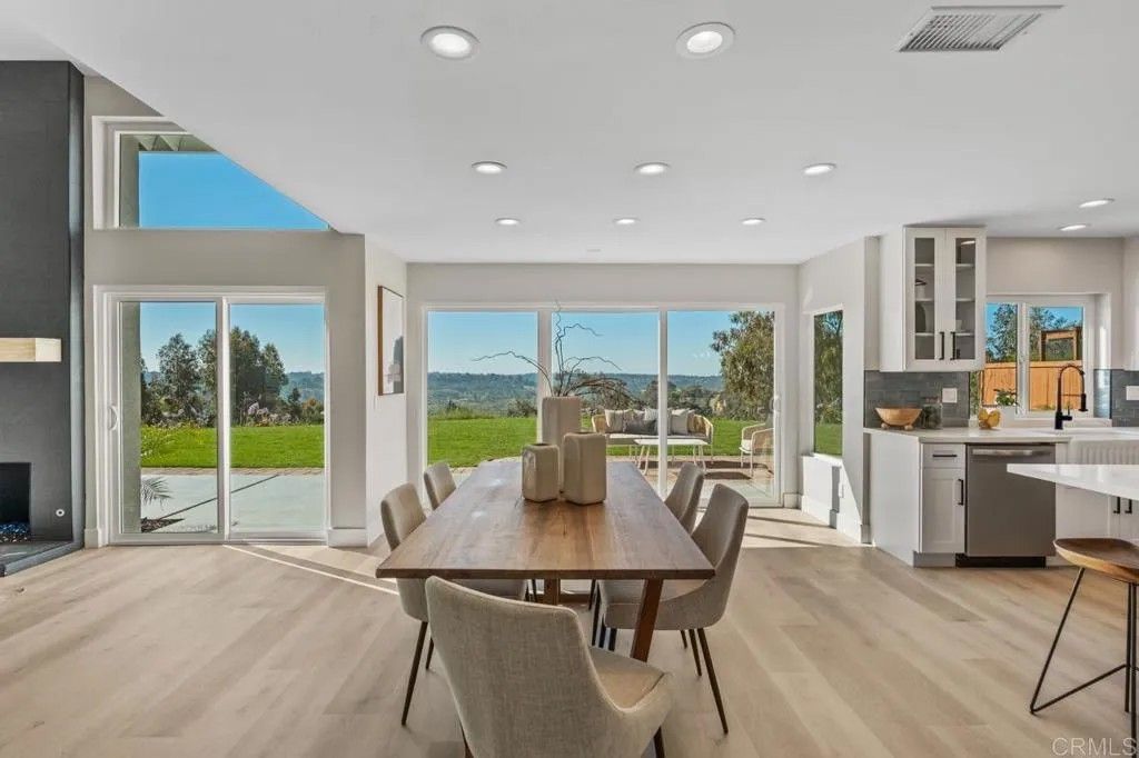 Completely remodeled and ideally located at the end of a premier cul-de-sac, this exceptional Encinitas home offers sweeping 180 panoramic valley and mountain views with a true great room design spanning the entire rear of the home. The open floor plan was reimagined to create a seamless connection from the kitchen through the main living areas, all oriented toward breathtaking panoramic views of rolling hills, canyon, valley, and surrounding natural landscape. With a comprehensive interior and exterior renovation, high-end finishes throughout, and expansive indoor-outdoor living spaces designed to capture the views, this home represents a rare combination of thoughtful design, privacy, and dramatic scenery in one of Village Parks most sought-after locations.The home was thoughtfully reconfigured with removal of an interior bearing wall to create a true great-room layout and installation of an expanded sliding door system to maximize the panoramic valley views. All structural improvements were completed with City of Encinitas permits and finaled with Certificate of Occupancy. Approaching the home, you immediately notice the quiet end-of-cul-de-sac setting and the newly redesigned front landscape with drought-tolerant plantings that complement the natural surroundings. Inside, soaring ceilings and an abundance of natural light create an immediate sense of openness. As you enter, your eye is drawn through the main living area directly to the sweeping panoramic valley and mountain views beyond. The interior has been fully renovated with new windows, updated lighting, new outlets and fixtures, new shaker-style interior doors with updated handles and hinges, mirrored closet doors, six-inch baseboards, and extra-wide luxury vinyl plank flooring throughout.The main living areas were completely reconfigured to create a true great room overlooking the incredible panoramic views. A wall was removed (with permits) to open the space from end to end, connecting the kitchen, breakfast area, and family room into one expansive living environment designed for entertaining and everyday living. At the center of the room is a dramatic custom two-story fireplace finished with custom black tile and accented by a large white oak mantle, creating a striking architectural focal point. The fully custom kitchen has been thoughtfully opened and redesigned with both style and function in mind. It features an oversized center island with breakfast bar seating, quartz countertops, a glazed ceramic artisan subway tile backsplash, custom soft-close cabinetry, and all new stainless steel appliances. A Signature Curington farmhouse single-basin fireclay sink sits beneath new windows framing the landscape, while Xidane Alturas gold pendant lighting highlights the island. Cooking has been upgraded from electric to gas, making the kitchen as functional as it is beautiful. Large new windows and sliding doors throughout the home maximize the incredible scenery. A dual sliding door system adjacent to the kitchen has been expanded to a triple-panel configuration, creating a seamless indoor-outdoor connection and allowing the entire great room, breakfast area, and living room to open directly to the backyard and views beyond. The flexible Village Park floor plan offers five bedrooms and three bathrooms, including a bedroom and full bathroom on the main level, ideal for guests or a home office. All bathrooms have been completely remodeled with new custom cabinetry, coastal gray quartz countertops, new tile flooring, backlit mirrors, and new fixtures. Upstairs, the oversized primary suite enjoys elevated panoramic views of the canyon, valley, and surrounding hillsides. The suite features a newly built private balcony overlooking the open space, creating the perfect setting for morning coffee or sunset evenings while taking in the scenery. The backyard has been redesigned to take full advantage of the pie-shaped lot and unobstructed views. Fresh sod provides open space