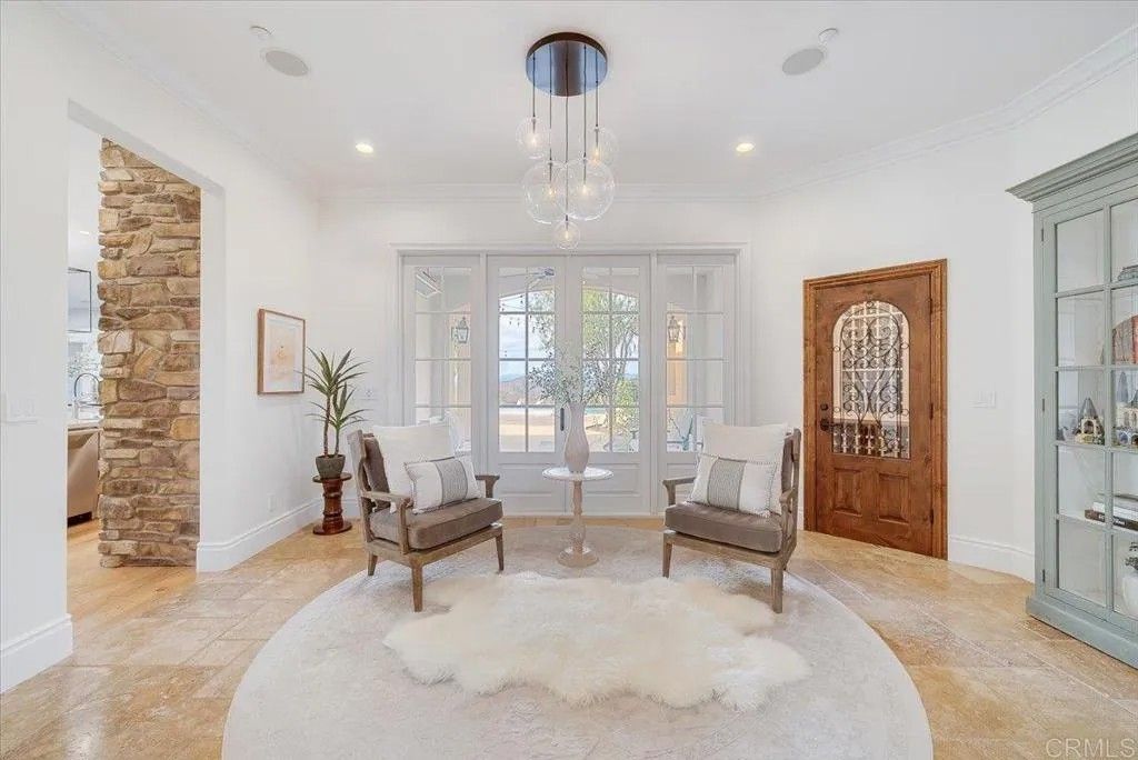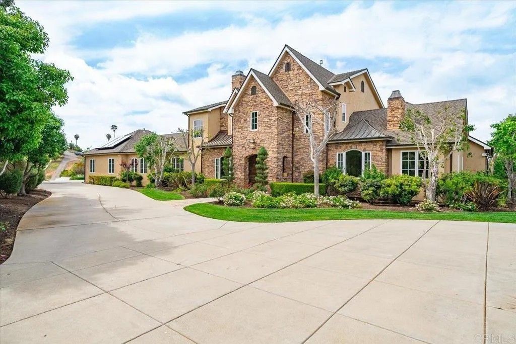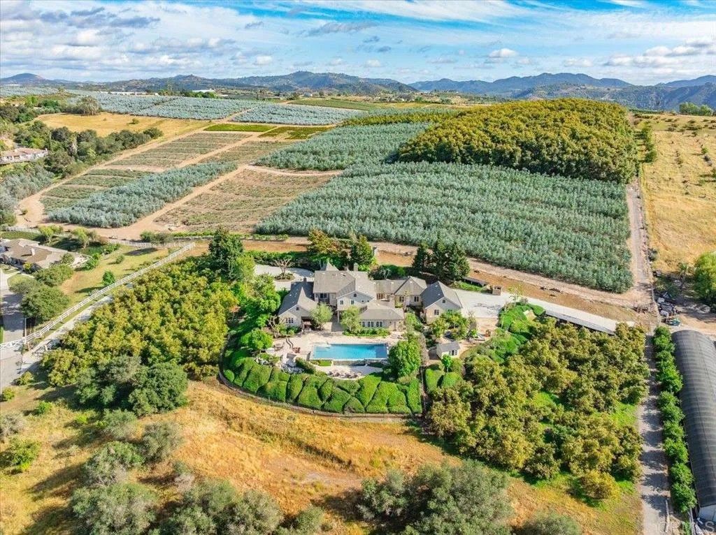 Modern luxury meets European charm on 2.52 sprawling acres in the hills of Bonsall, CA. This exquisite property offers a refined lifestyle combining elegance, comfort and green features. Spectacular views from every room of this five bedroom and six bathroom estate property. The open floorplan lends itself to effortless entertaining with the gourmet kitchen opening to the family room. Chef's kitchen features a large island, quartzite counters, upgraded cabinetry, a Wolf commercial range with two ovens, four burners, grill, and French top, Sub-Zero refrigerator and dual Miele dishwashers, connecting to a dining area anchored by a stacked-stone fireplace. A climate-controlled 330-bottle wine room serves collectors and hosts. The primary bedroom is conveniently on the main level and includes a fireplace, spa-style bathtub, large walk-in closet and an adjacent flex space suitable for an office, gym or studio. Unique touches include a secret childrens play room, custom treehouse, in-ground trampoline and a dedicated play area. Systems and finishes have been upgraded throughout: motorized shades, upgraded designer lighting, tankless water heating, a smart water-management system and whole-house water purification and monitoring. The grounds are resort-caliber, featuring a saltwater lap pool with an infinity edge and beach entry, convenient outdoor kitchen, outdoor poolside shower, cozy sunken firepit with seating, dining courtyard and reflecting pond with breathtaking sunsets and panoramic valley and mountain views. Oversized four car garage has a workshop bathroom and ample loft storage. Eco-friendly amenities include 24 owned solar panels with dual inverters, solar pool heating and Nest-controlled HVAC. Fully usable flat lot with 170 mature Certified Organic Hass avocado trees add agricultural value and sustainable living appeal. Private gated entrance, and security system with fire detection provide security. The sense of seclusion and tranquility is unmatched, offering the privacy of expansive land while being just 20 minutes from essential amenities, including Trader Joes, Target, Home Depot, Lowes, and Costco and only 5 minutes to major highways.
