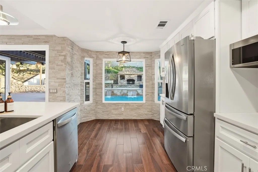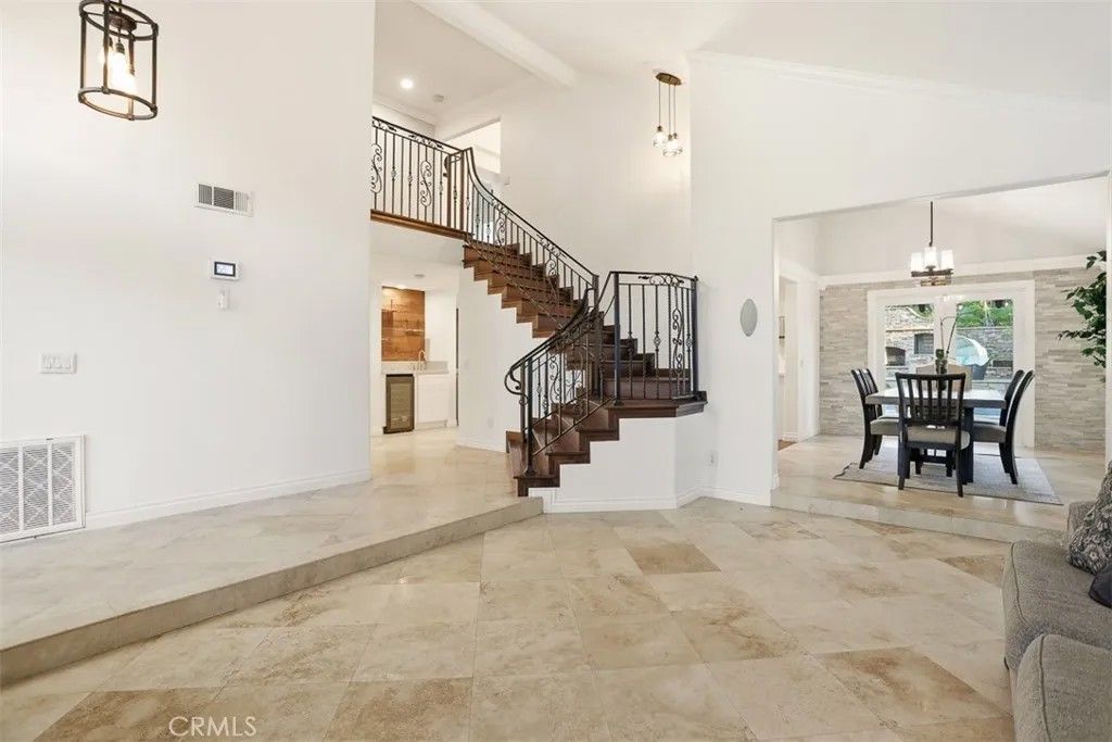 Welcome to 5600 Via De Campowhere comfort, character, and the California lifestyle come together in a home designed to be lived in, loved, and shared. Tucked into one of Yorba Lindas most inviting neighborhoods, this 4-bedroom, 3-bath residence offers 2,287 sq ft of living space that feels even larger thanks to soaring vaulted ceilings and an airy, open flow. From the moment you arrive, the home sets a tone of pride and warmth. The extra-wide diamond-cut ribbon driveway, lush landscaping, decorative wrought-iron gates, and rare RV parking create a grand yet welcoming first impression. Inside, a custom spiraling iron staircase anchors the home with striking craftsmanship. The formal living and dining rooms invite gathering, and two sets of swinging French doors open wide to a private patio with an outdoor kitchenblending indoor and outdoor living in a way perfect for California evenings. A first-floor bedroom offers flexibility for guests, an office, or a home gym, while a dedicated laundry room adds everyday convenience. Throughout the home, recessed lighting, tile, bamboo, and natural stone elevate the details. The remodeled kitchen is a standout, featuring quartz countertops, stainless steel appliances, glass-front white shaker cabinetry, reclaimed-wood accents, stacked-stone details, and both a breakfast bar and a cozy eat-in nook. The adjoining family room continues the theme of comfort and character with its stacked-stone fireplace, reclaimed-wood backdrop, and custom dry bar with wine fridge. Wide French doors open to create a seamless connection to the stunning backyard. And the backyard is truly a showstopper: a custom pool with waterfalls, spa, tiered patio with wood-burning fireplace, two golf putting greens, an outdoor kitchen with granite counters and built-in BBQ, all-seasons patio cover, fruit trees, basketball hoop, and generous RV parking. Its an entertainers paradise and a private retreat in one. Upstairs, three spacious bedrooms offer thoughtful touches including ceiling fans, custom lighting, and reclaimed-wood barn doors. The main bedroom features a sprawling layout and a spa-inspired ensuite bath. All of this sits minutes from 100+ miles of trails, Brush Canyon and Box Canyon Parks, pickleball courts, and top-rated Bryant Ranch, Travis Ranch, and Yorba Linda High School. Experience the charm, community, and lifestyle that make Yorba Linda one of Orange Countys most sought-after cities.