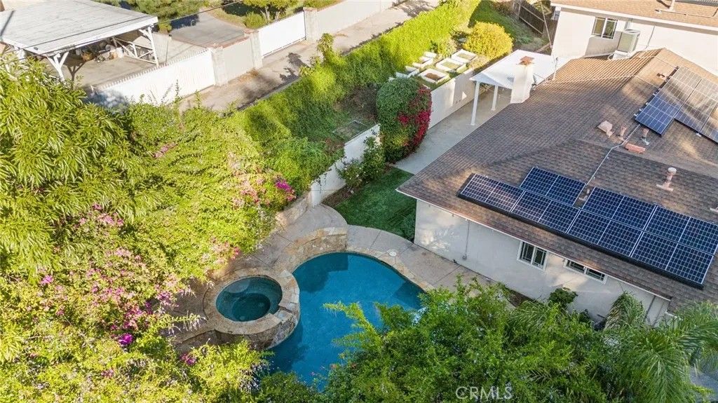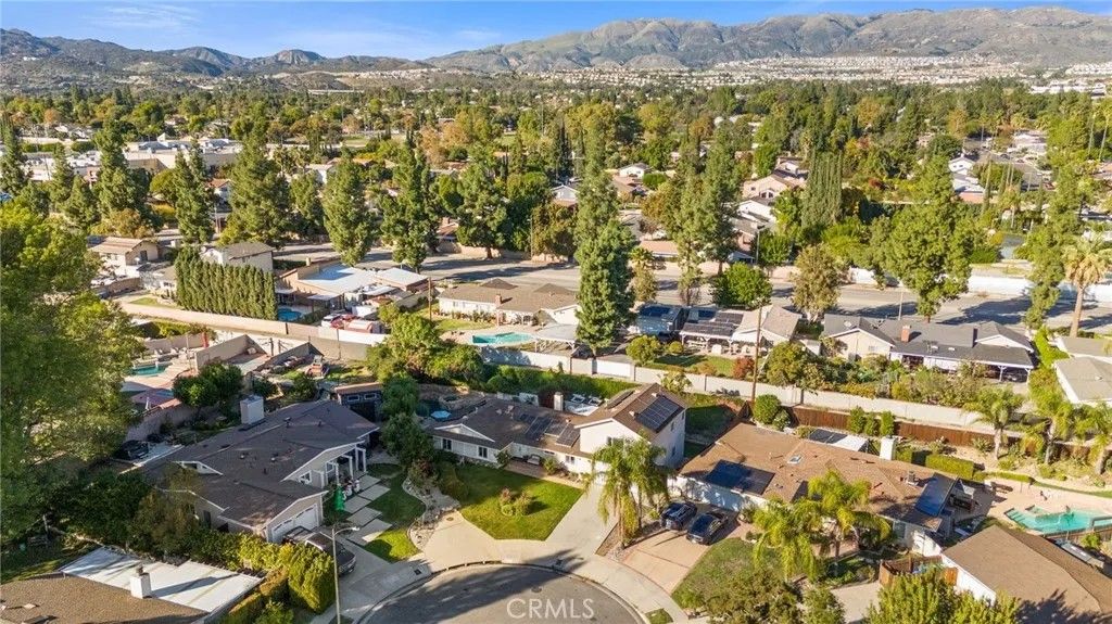 Welcome to this beautifully updated 5-bedroom, 4-bathroom POOL HOME nestled on a peaceful Chatsworth cul-de-sac! Sitting on an expansive nearly 10,000 sq ft lot, this bright and inviting residence offers an exceptional layout perfectly designed to convert the TWO offset bedrooms upstairs, with separate entrance option, to an ADU. The master en-suite is upstairs offering a retreat of its own with high ceilings, a spacious walk-in closet, and gobs of natural light. Additional energy-efficient upgrades include dual-pane windows and slider as well as leased SOLAR PANELS, helping reduce utility costs year-round! The additional THREE bedrooms & TWO bathrooms are on the other side of the home, one being a mini en-suite while the others sharing the hallway FULL bathroom! The home features luxury plank flooring, UPDATED bathrooms and a central great room with a stylish fireplace! The kitchen has tons of cabinetry, granite countertops, travertine backsplash, stainless steel appliances, double oven and a cooktop located on the island peninsula that overlooks the great room. An added bonus is a built-in hutch for multiple uses such as a serving buffet or bar. Let your imagination run wild in this ideal space. Step outside and discover your very own private backyard, OASIS! Enjoy a sparkling pool with Baja Shelf and elevated HOT TUB surrounded by natural stone & lush vegetation creating such the tropical resort-like ambiance! The backyard also features a welcoming sitting area with vinyl awning, green turf and multiple raised vegetable planters, creating an ideal space for outdoor dining, relaxation, and gardening. This Chatsworth gem offers the perfect blend of comfort, style, and tranquilityready to welcome its next owner!!