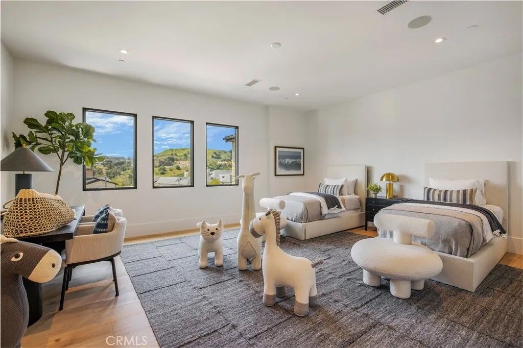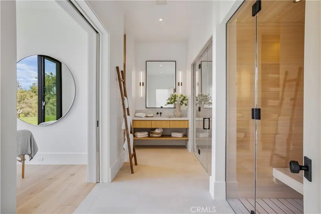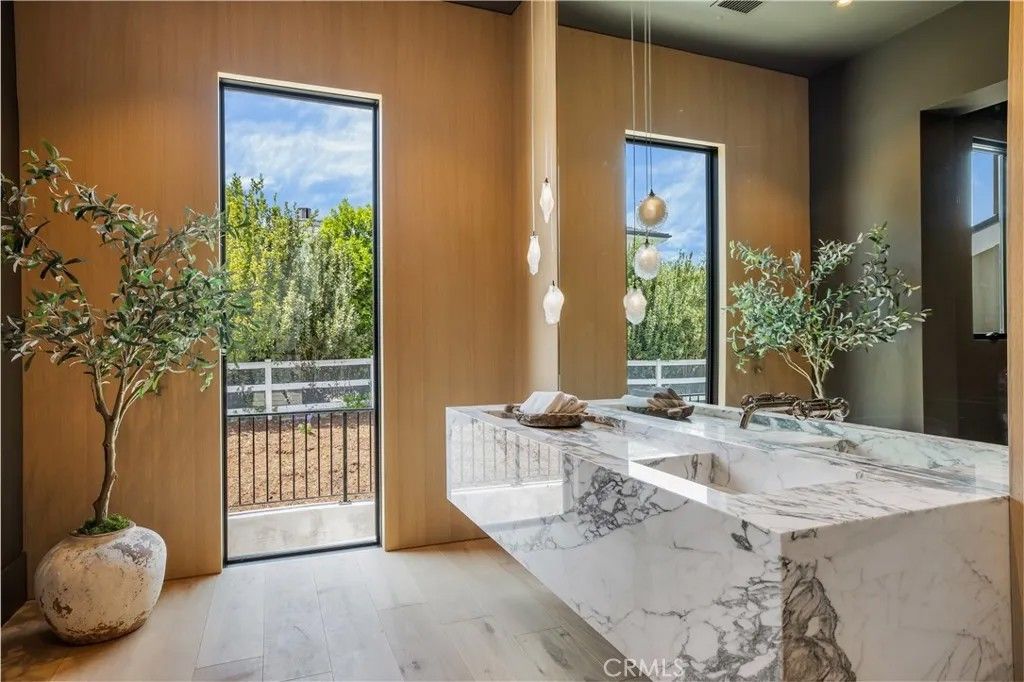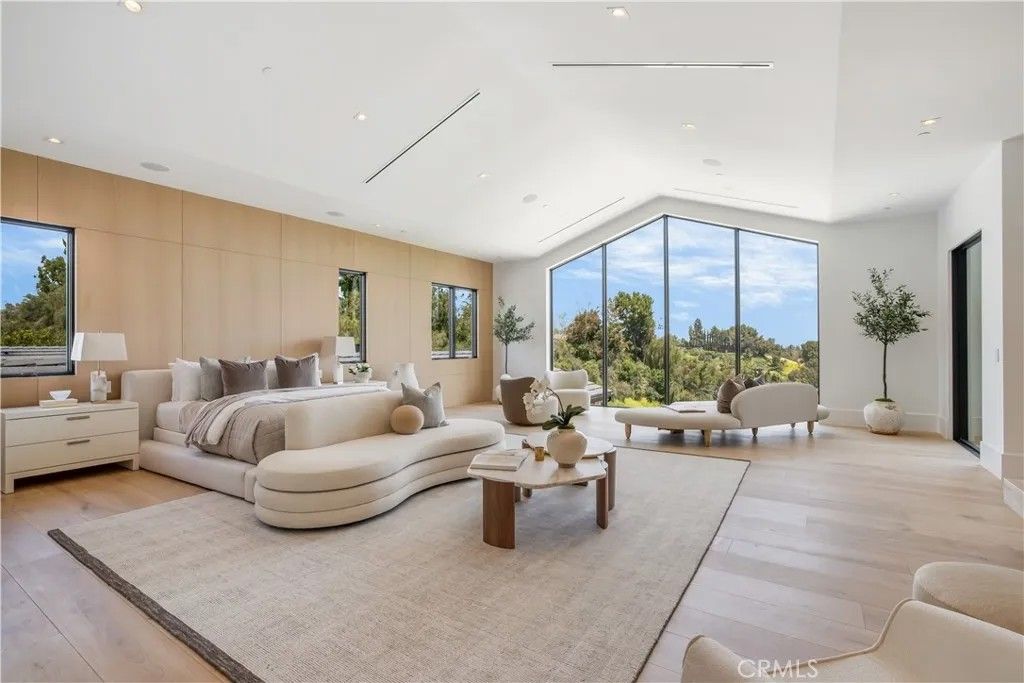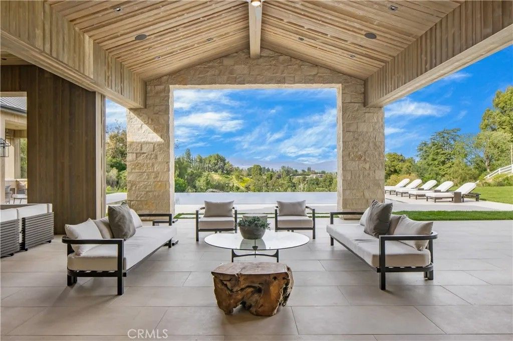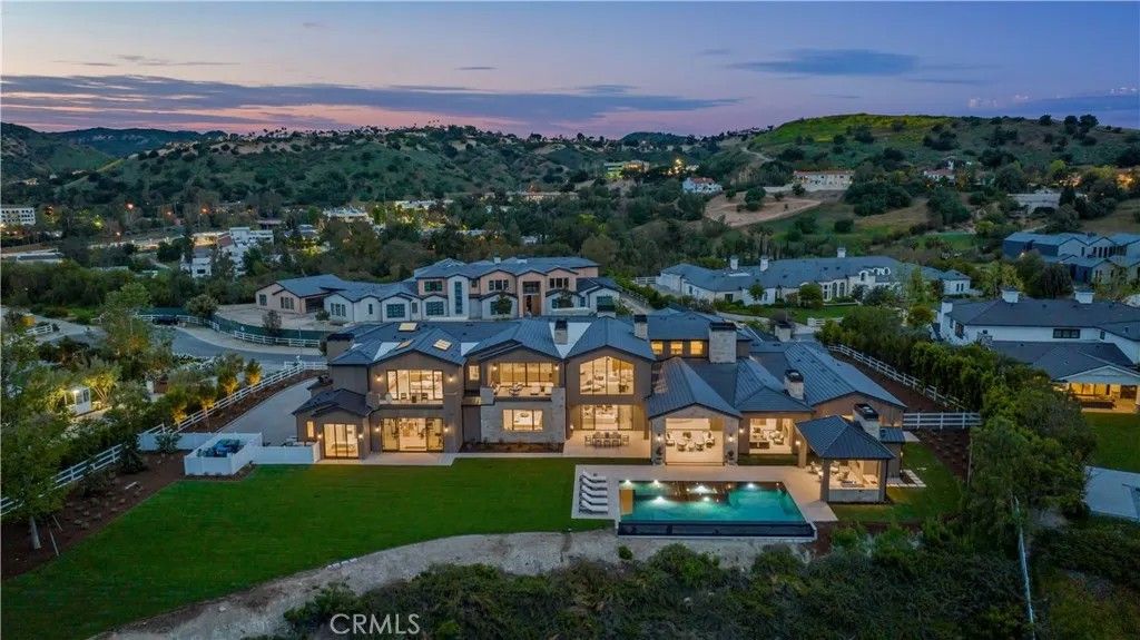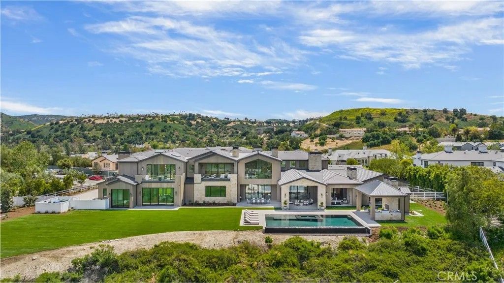 Welcome to "The Ridge at Hidden Hills". This new, absolutely spectacular, one-of-a-kind estate is nestled at the end of a quiet cul de sac and is sited on a beautiful 1.77 acre view lot. Step through the custom 12 glass pivot door and enter into a world of luxury, elegance, and quality. Bathed in natural light, and spanning 21,670 square feet, this home exemplifies the essence of the relaxed, indoor/outdoor California lifestyle. Highlights of the spacious open floor plan include a gorgeous, three level floating staircase, stellar, restaurant quality chefs kitchen (and prep kitchen), entertainers center island with counter seating, and big breakfast room, all open to the large family room with motorized, sliding walls of glass, two-sided fireplace, and adjoining living room with lounge and seating bar. Additional amenities include a formal dining room with refrigerated wine wall, adjoining butler's pantry, and a full catering kitchen, plus a large private office with full wall windows, a stunning home theater with fabric covered acoustic sound walls, and wonderful gym & spa complete with massage room, steam shower & sauna. There are six generous en suite bedrooms, four upstairs and two on the main floor, all serviced by an elevator. The superb primary suite offers a sitting area, fireplace, deluxe bath with dual showers and big soaking tub, enormous, room sized custom closets, and a large private balcony showcasing the expansive pastoral views. One of the two downstairs suites is a second primary suite with a soaking tub, covered patio, and its own private entrance. The basement space is a world of its own with a huge game room/lounge, a two lane bowling alley, and garages for 10 cars, showcased by gleaming epoxy floors, plus there's an additional 4 car garage on the main level. The spacious grounds include a sparkling, zero edge infinity pool & spa, three covered patios complete with a full barbecue center, two fireplaces, a powder bath, outdoor bath & shower, and expansive grass lawns. There are also plans for a guest house. This trophy property is located on one of the finest streets in all of Hidden Hills, and close to highly regarded public & private schools, and The Commons shopping center.