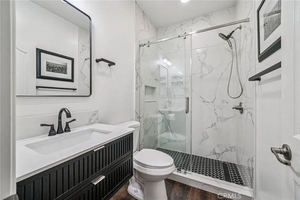 Spacious contemporary luxury home in a classy neighborhood, featuring newly renovated, stylish bathrooms with modern fixtures and sliding, frameless glass shower doors. The first floor includes a two-car garage with extra storage/workshop space, a bedroom next to a 3/4 bathroom, and an under-stairs storage cupboard. An open-concept dining room, kitchen, and living room with a gas fireplace create an inviting setting, while the kitchen offers ample cabinets, a large granite island, and a mounted wine rack. The large backyard is half-paved, half lawn, with views of mature trees and elegant surrounding homes. Perfect for children's playtime and large social gatherings. Upstairs are four bedrooms, including a master suite with a spacious walk-in closet featuring a wood closet system and glass display cases. The master bathroom includes a contemporary freestanding tub. A separate 3/4 bathroom with dual sinks and a laundry room with an additional vanity sink add convenience. Newly installed recessed ceiling lights in every room provides ample lighting for comfort and style.